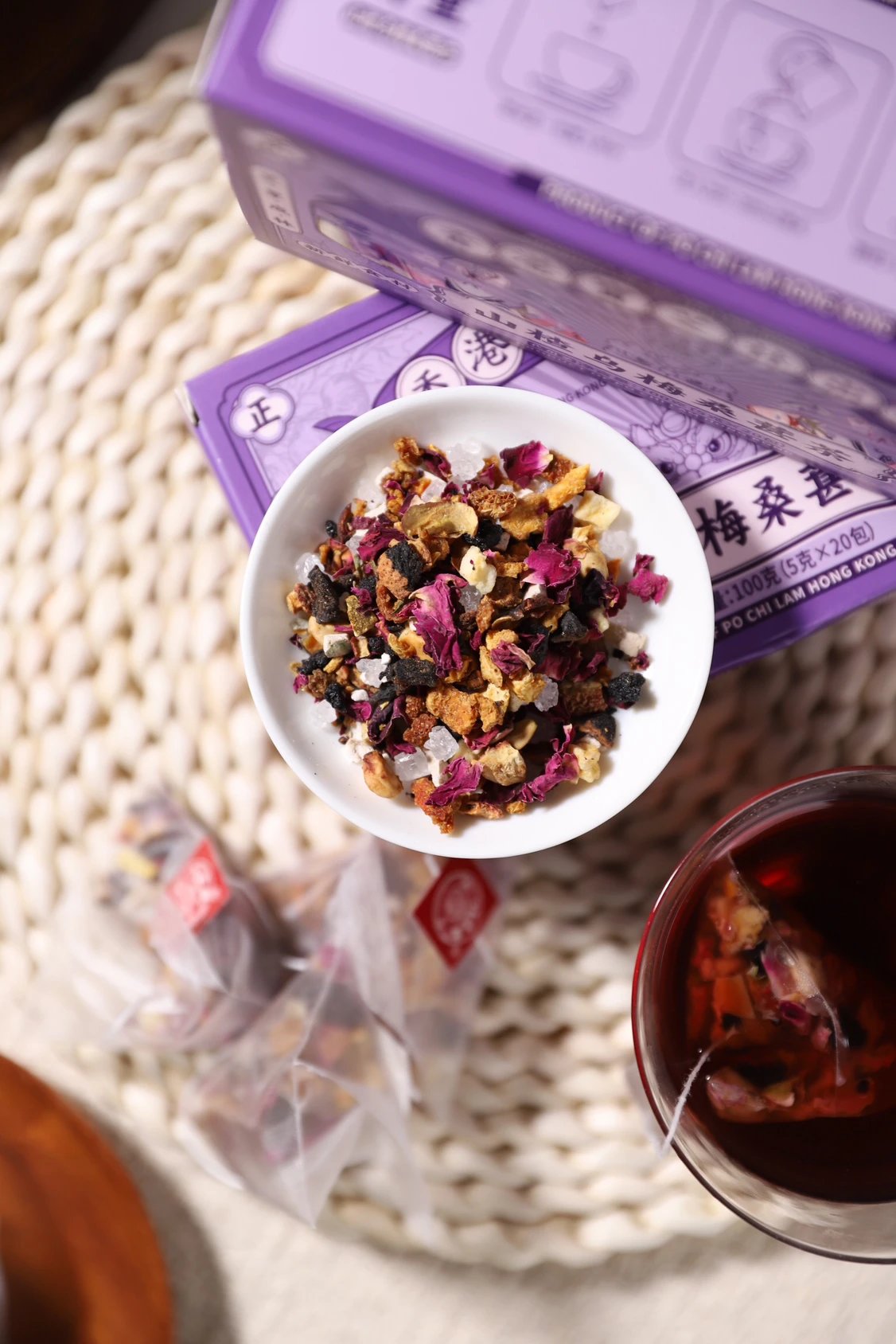 【配料】冰糖、橘皮、茯苓、苹果干、山楂、桑葚、乌梅、重瓣红玫瑰