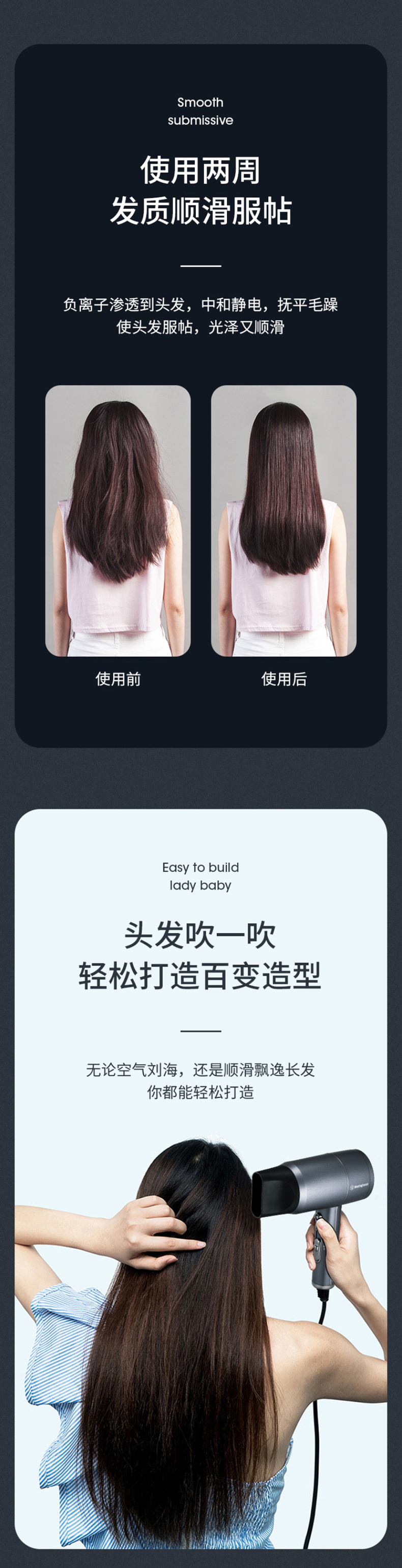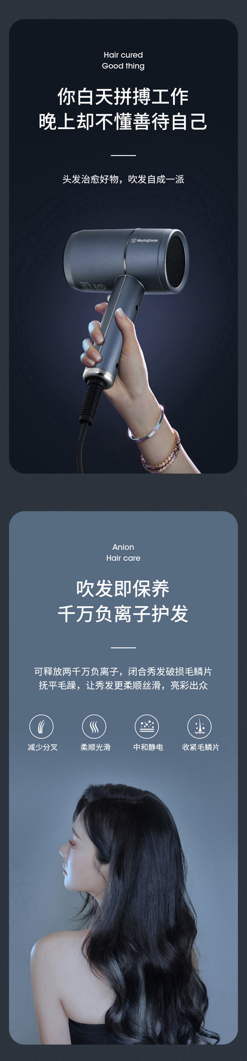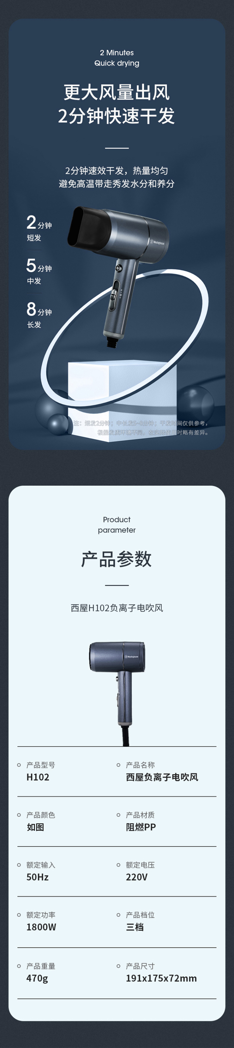 西屋(Westinghouse)吹风机家用负离子便携护发网红款电吹风蓝雾灰 H102