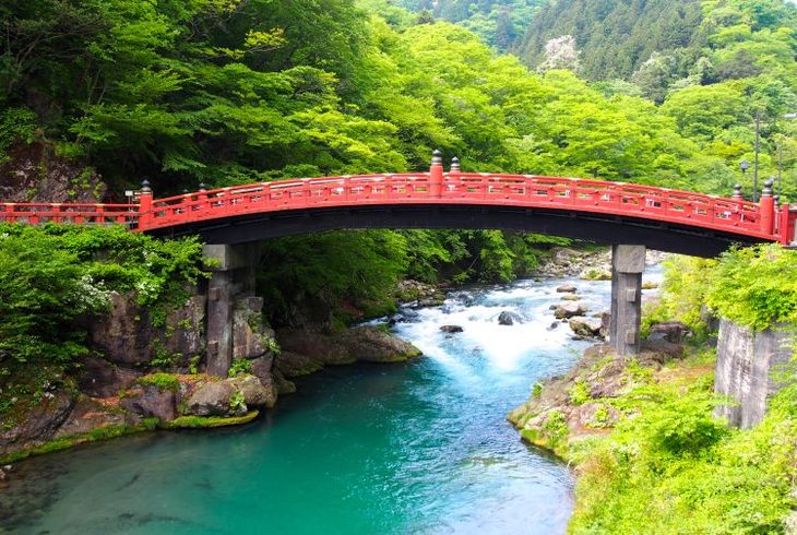 神桥长达 28 米,是日光的神圣入口。这座桥被称为日本三大桥之一,朱漆桥拱被绿叶环绕,加上桥下潺潺的流水,形成了一幅特别动人的画卷。