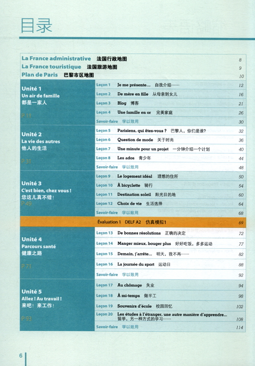 一、结构简明,内容扼要而新鲜:适于课时较少的教学安排或用于自学。每三个单元之后配置一套DELF考试仿真模拟题,从听力理解、口语表达、阅读理解、书面表达四个方面检测学习效果。