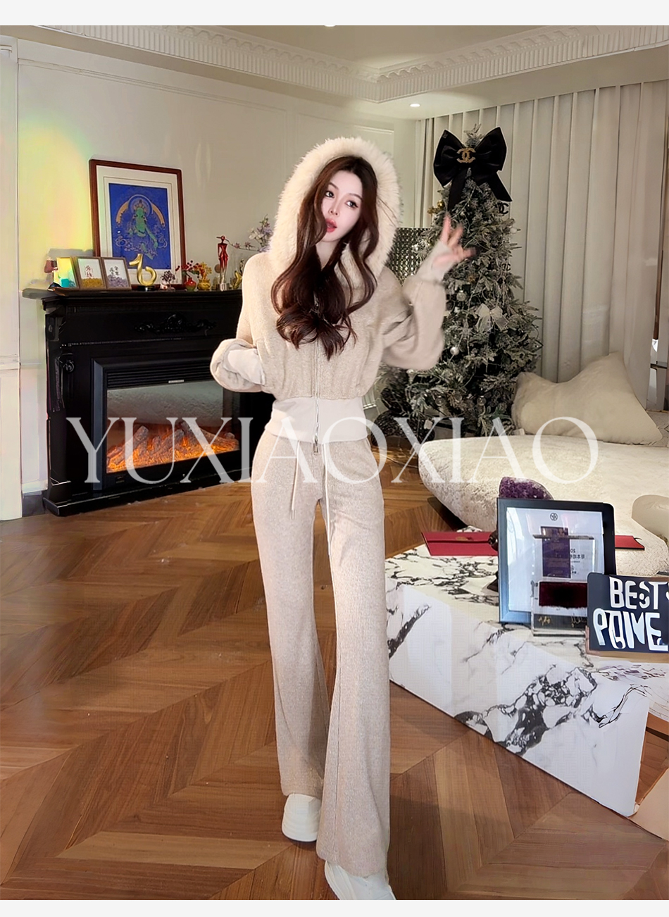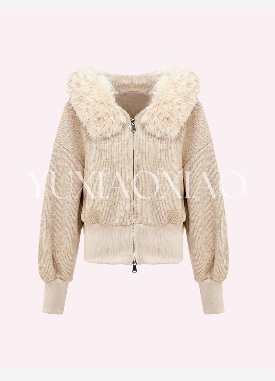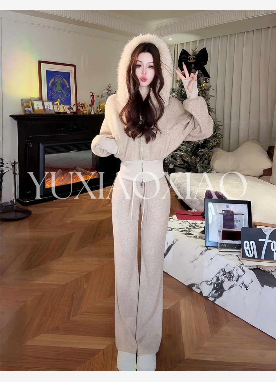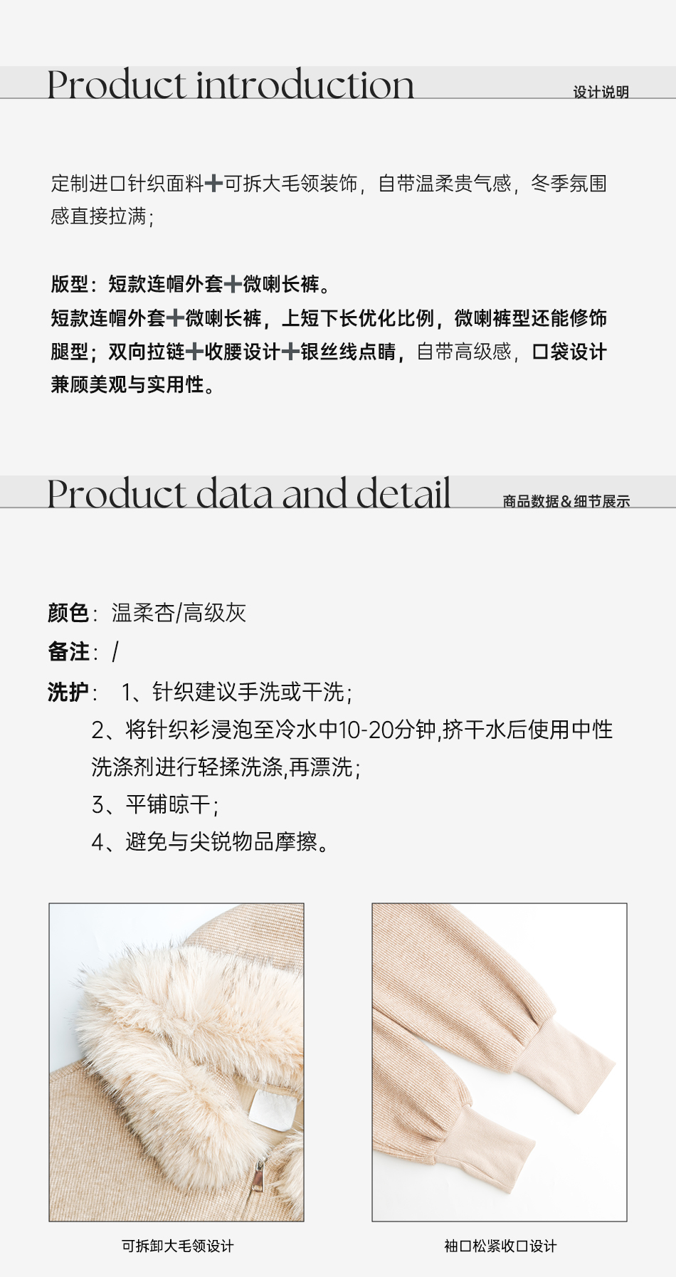 余潇潇【长岛假期】可拆毛领双拉链亮丝短款针织连帽外套&微喇长裤