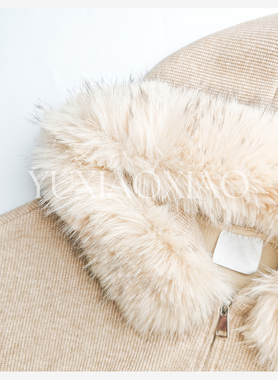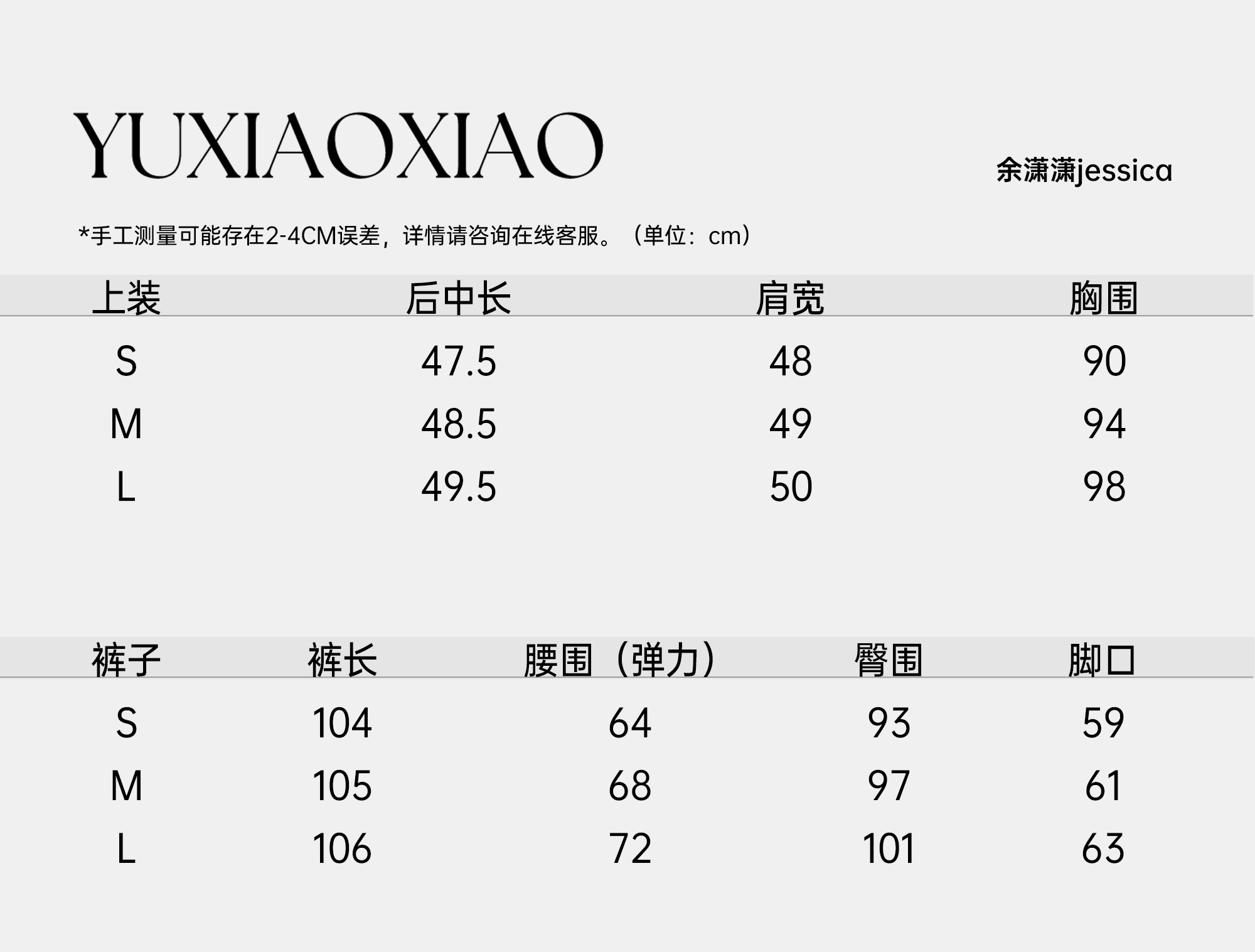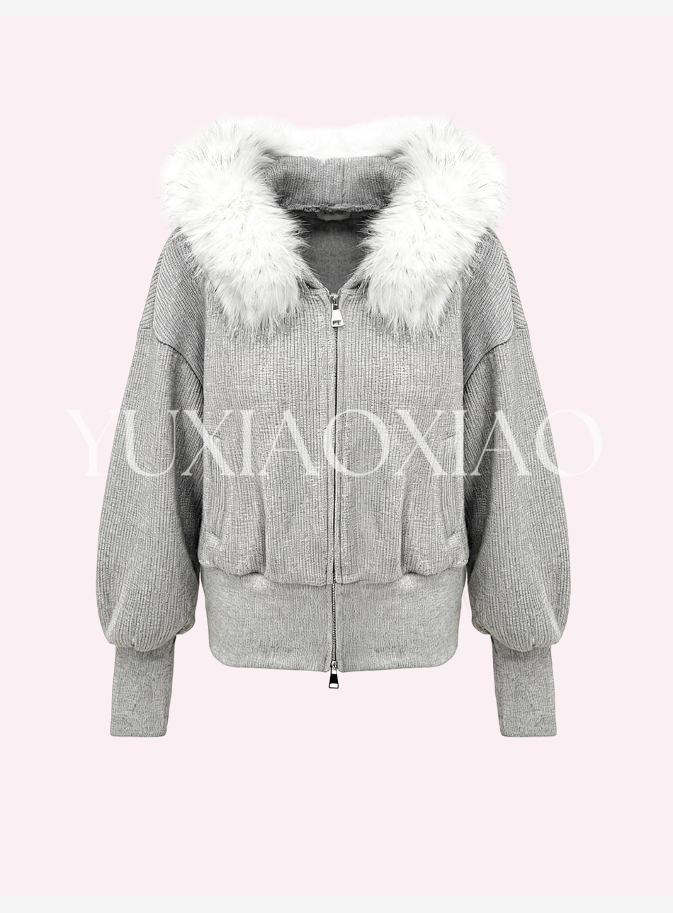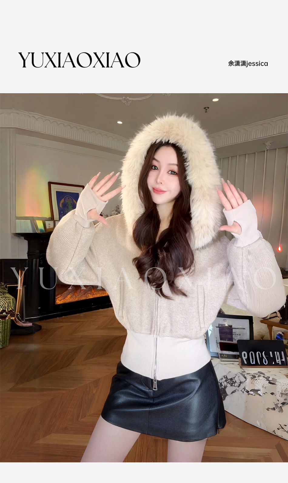 余潇潇【长岛假期】可拆毛领双拉链亮丝短款针织连帽外套&微喇长裤