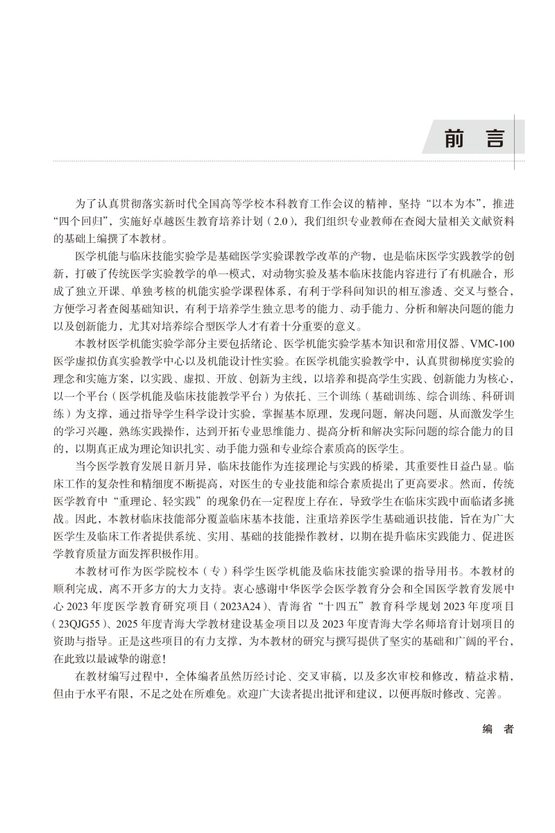 本书为青海大学医学院校本教材,内容包括依据各科教学大纲基本要求而设计的常规基础性实验,为开拓学生专业综合思维而开设的综合性实验,为培养学生初步的科研能力、创新精神而开设的设计性实验,从而形成了医学机能实验学梯度实验的完整体,并结合机能实验相关内容,应用好新建设的“VBL-100虚拟实验室系统”。临床技能部分覆盖临床基础技能,注重培养医学生基础通识技能,基于对当前医学教育需求的深刻洞察,旨在为广大医学生及临床工作者提供系统、实用、基础的技能操作指导