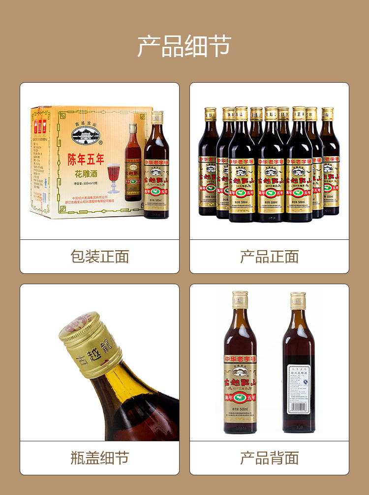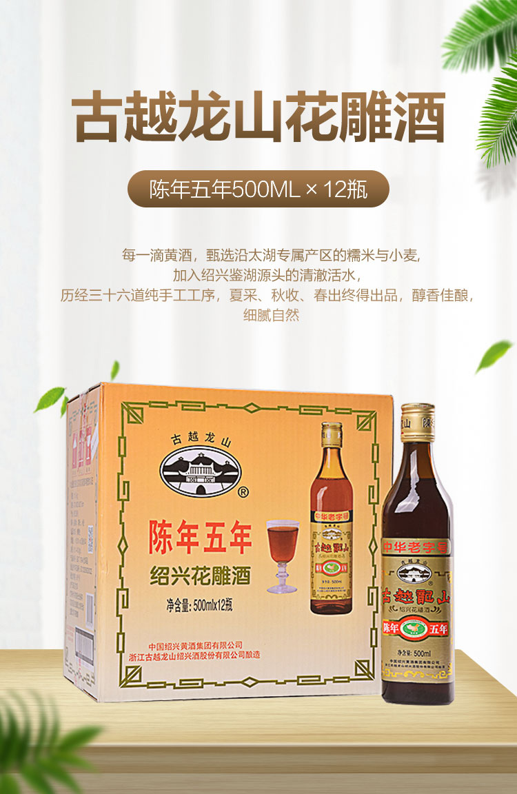 古越龙山 绍兴黄酒 花雕酒五年陈 半干型 500ml*12瓶 整箱装