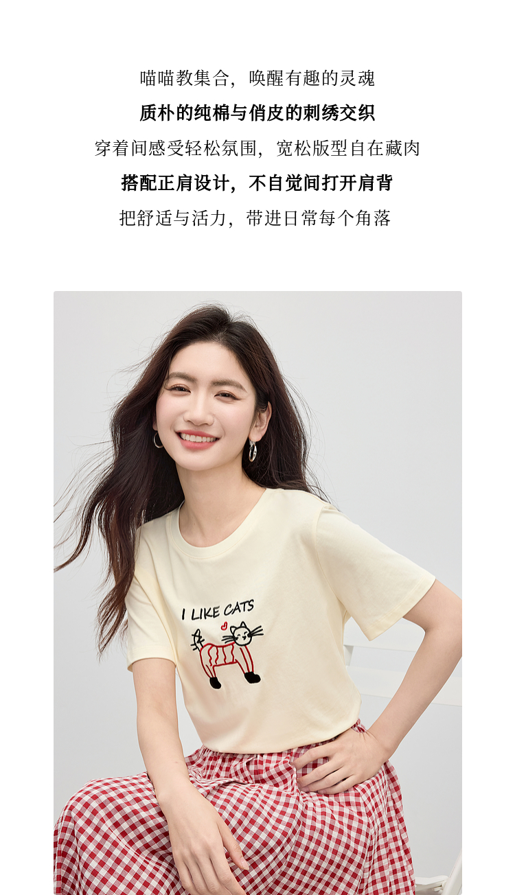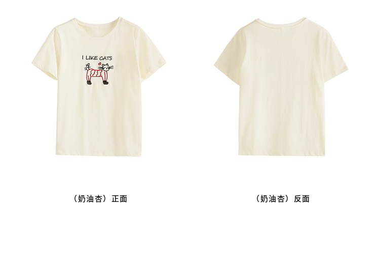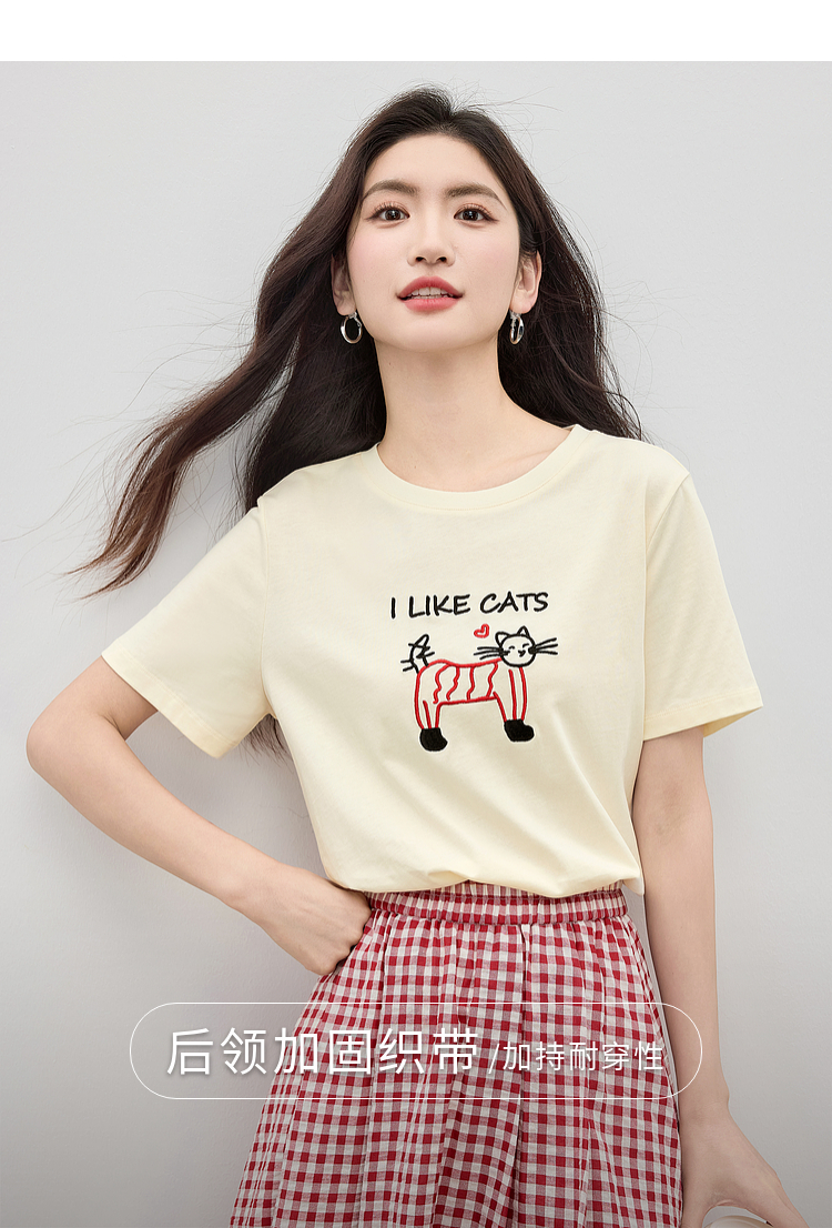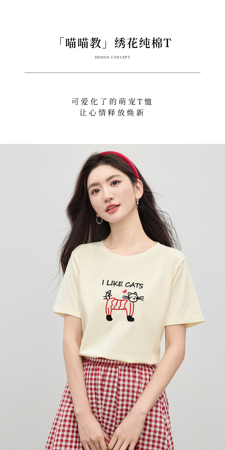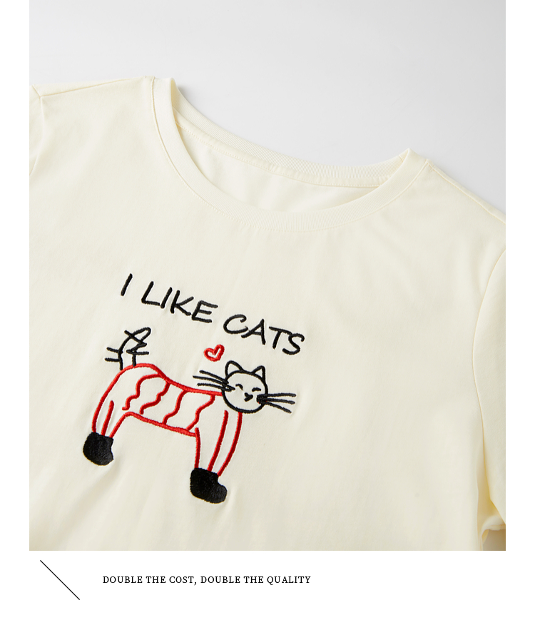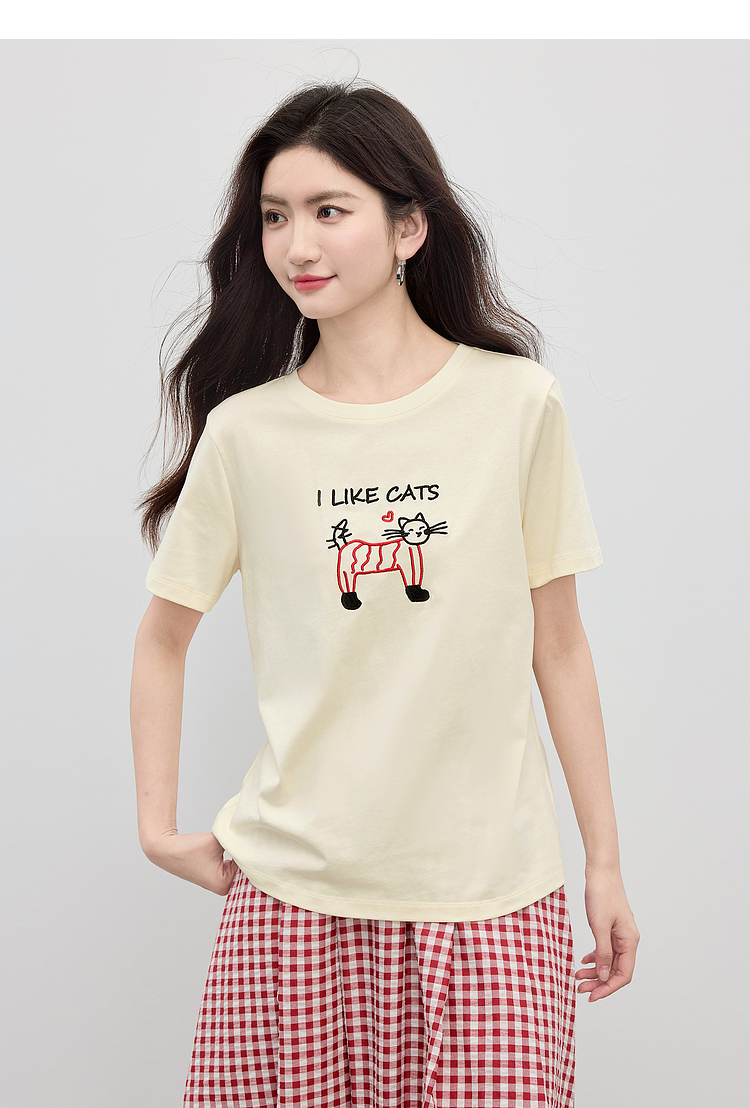 【专属特价】熙世界美式猫咪刺绣T恤女短袖夏日趣味减龄圆领正肩体恤上衣纯棉