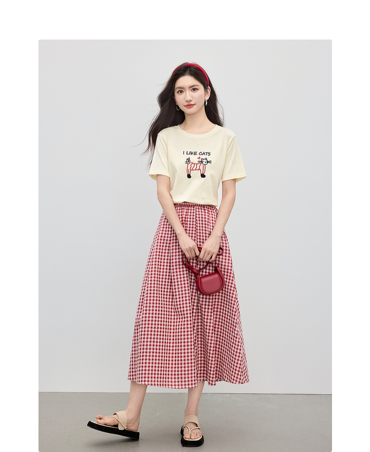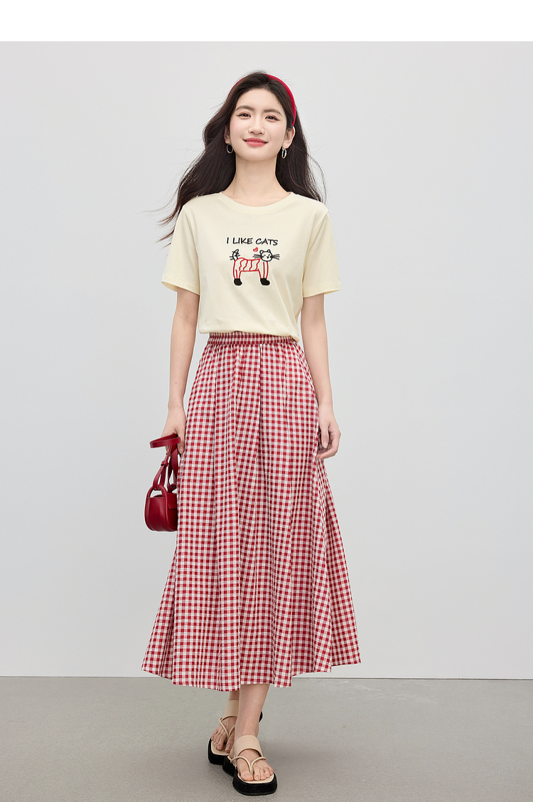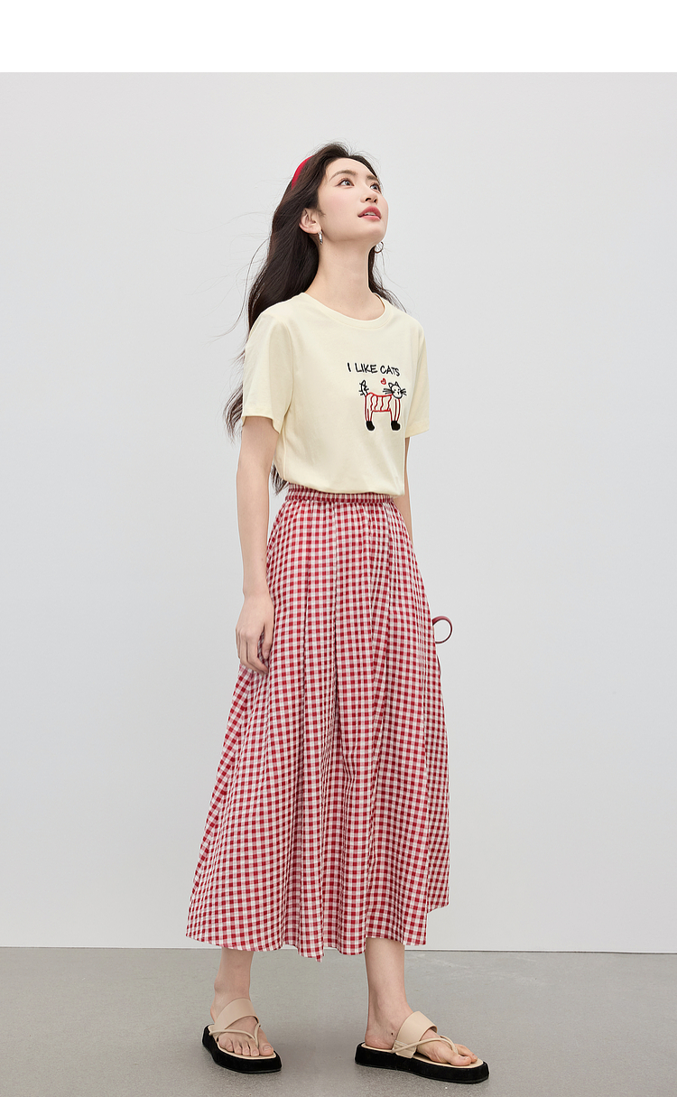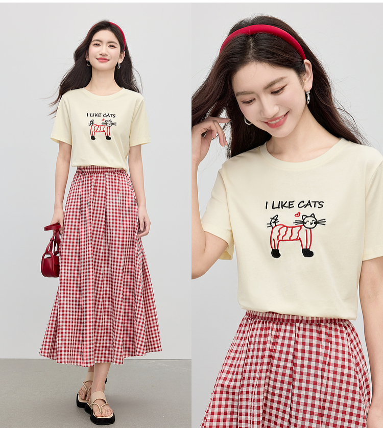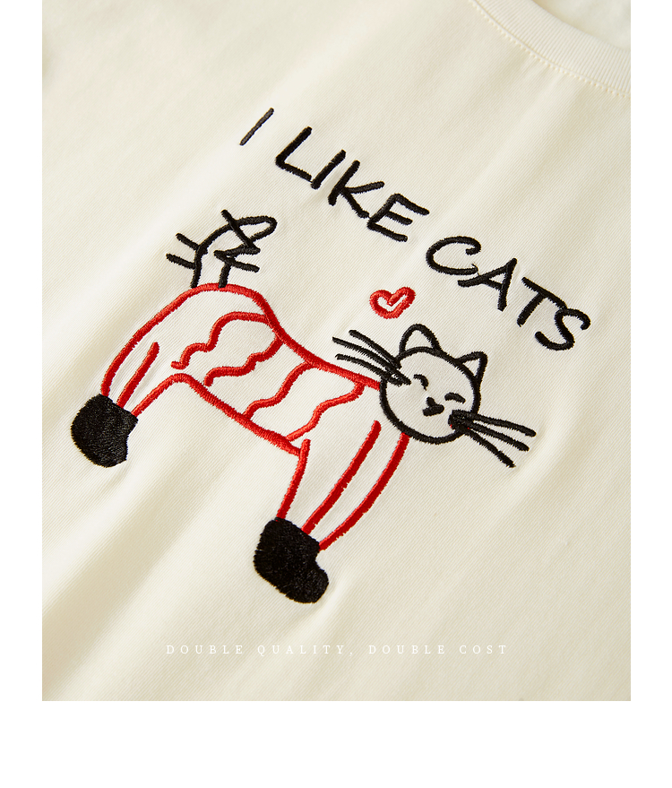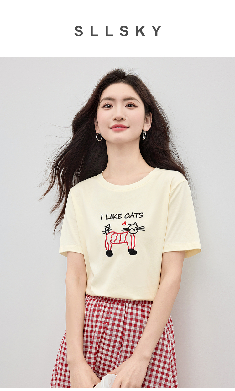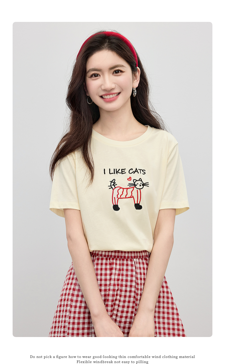 【专属特价】熙世界美式猫咪刺绣T恤女短袖夏日趣味减龄圆领正肩体恤上衣纯棉