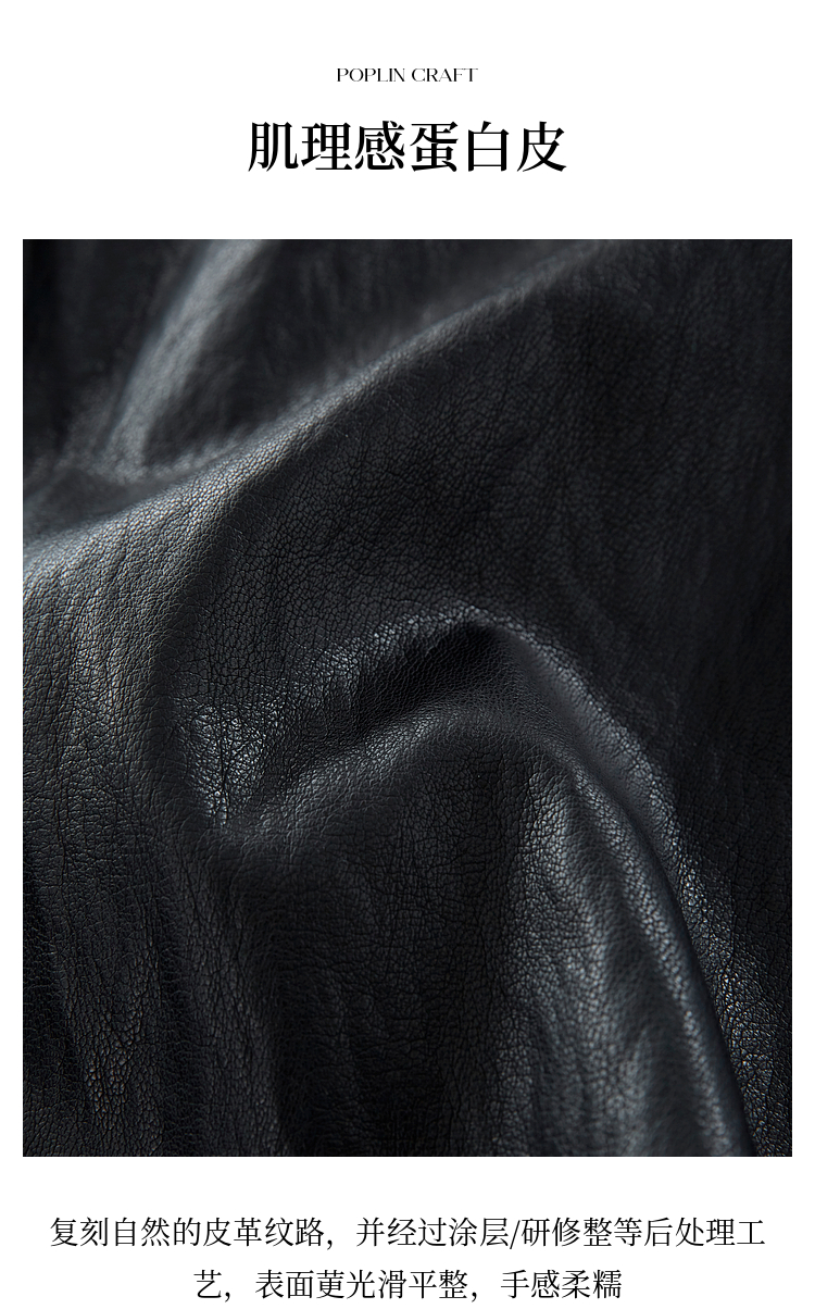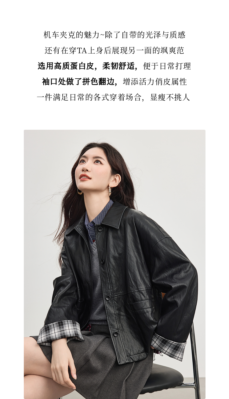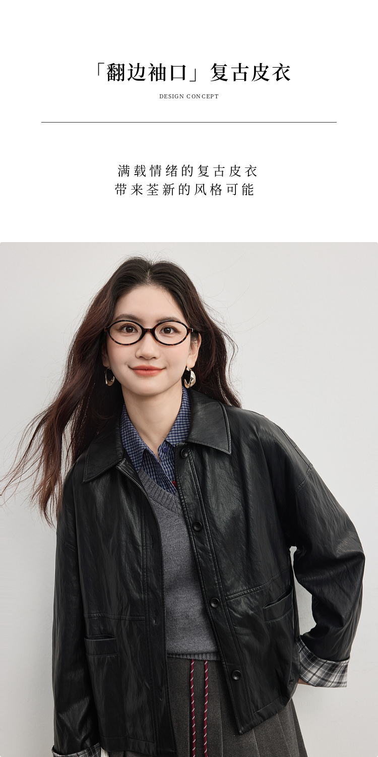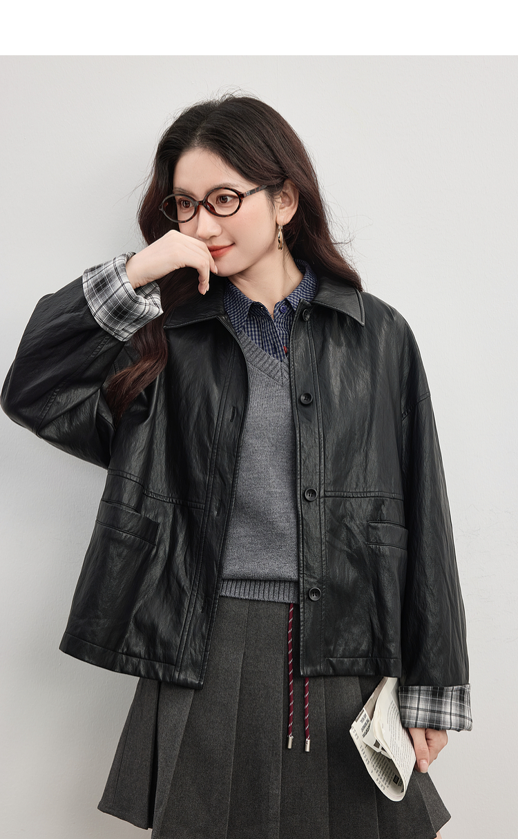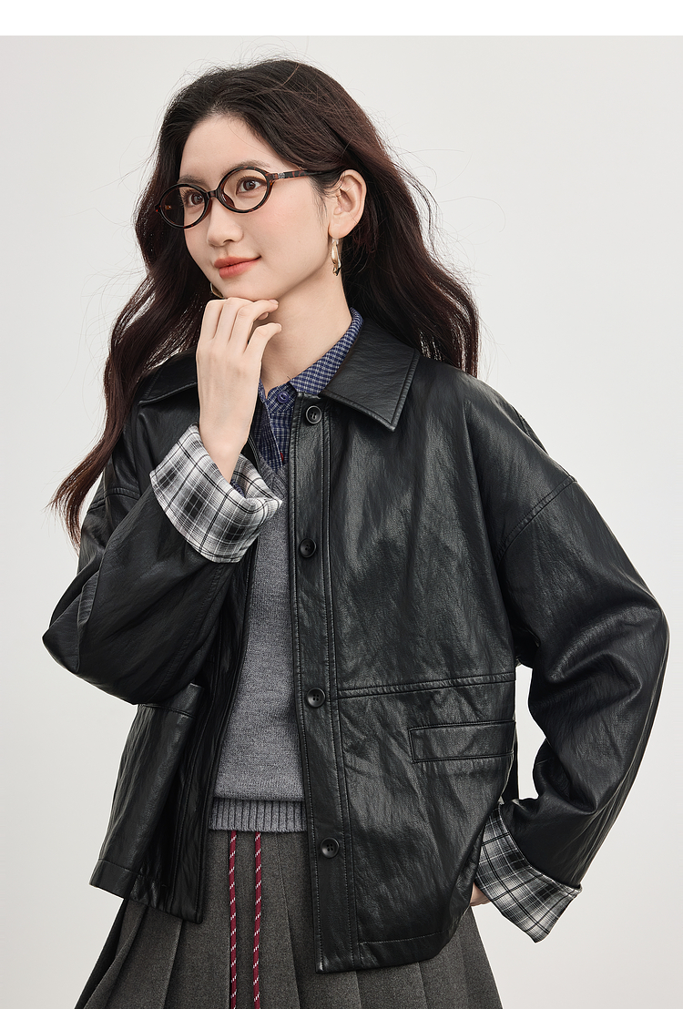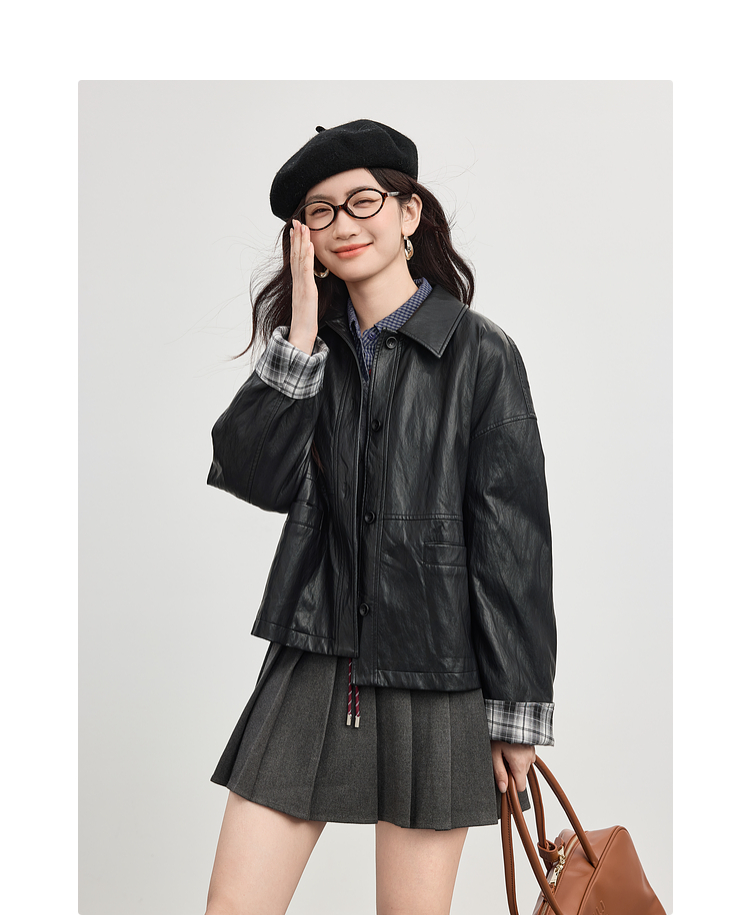 【年货节】熙世界肌理感蛋白PU皮衣外套女秋季格纹翻边袖巴恩风短款夹克上衣