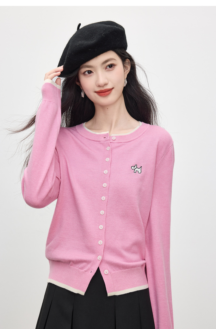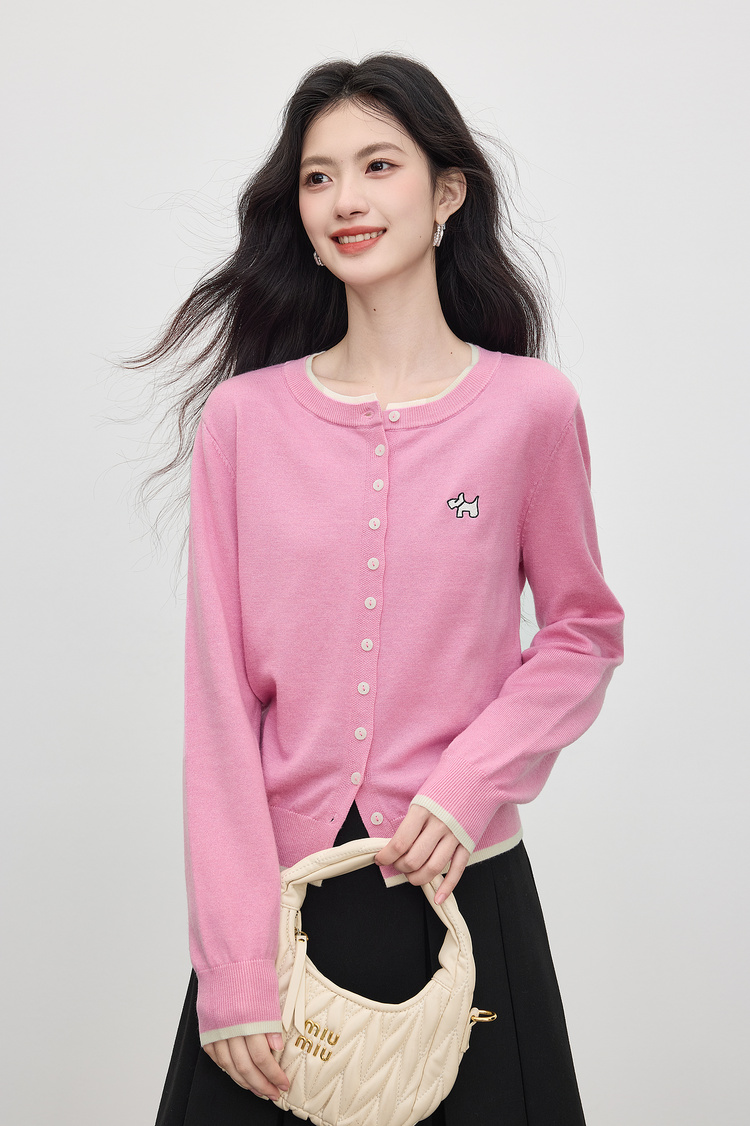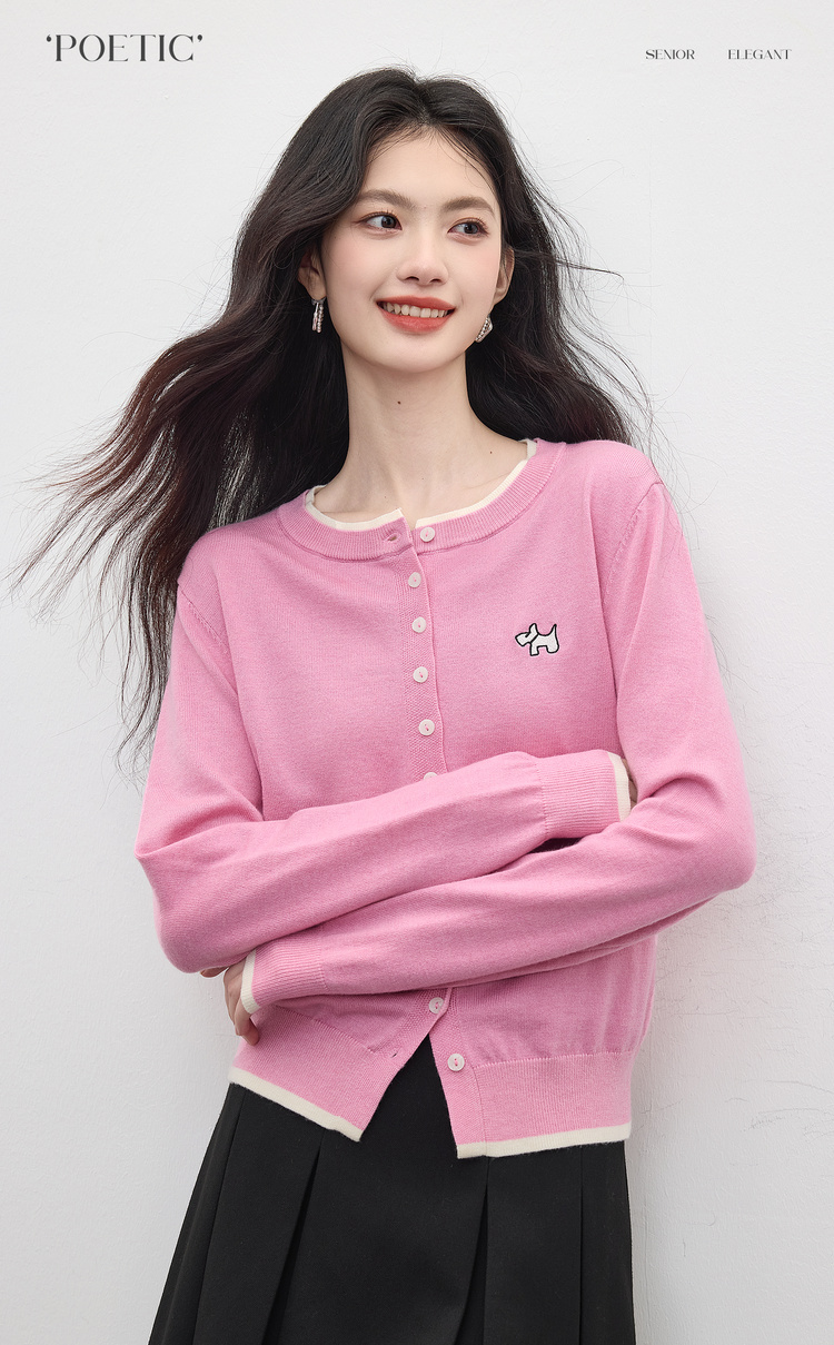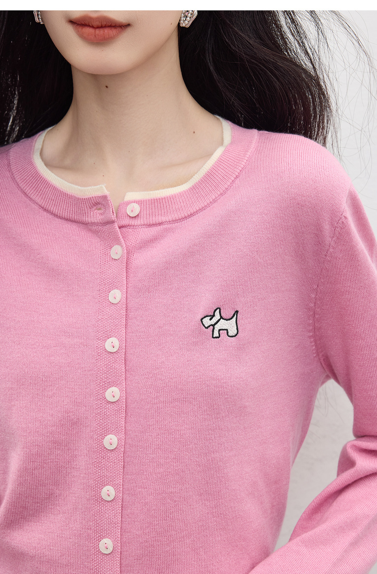 【五折购】熙世界假两件粉色针织衫女2025新款开秋穿搭刺绣减龄圆领开衫上衣
