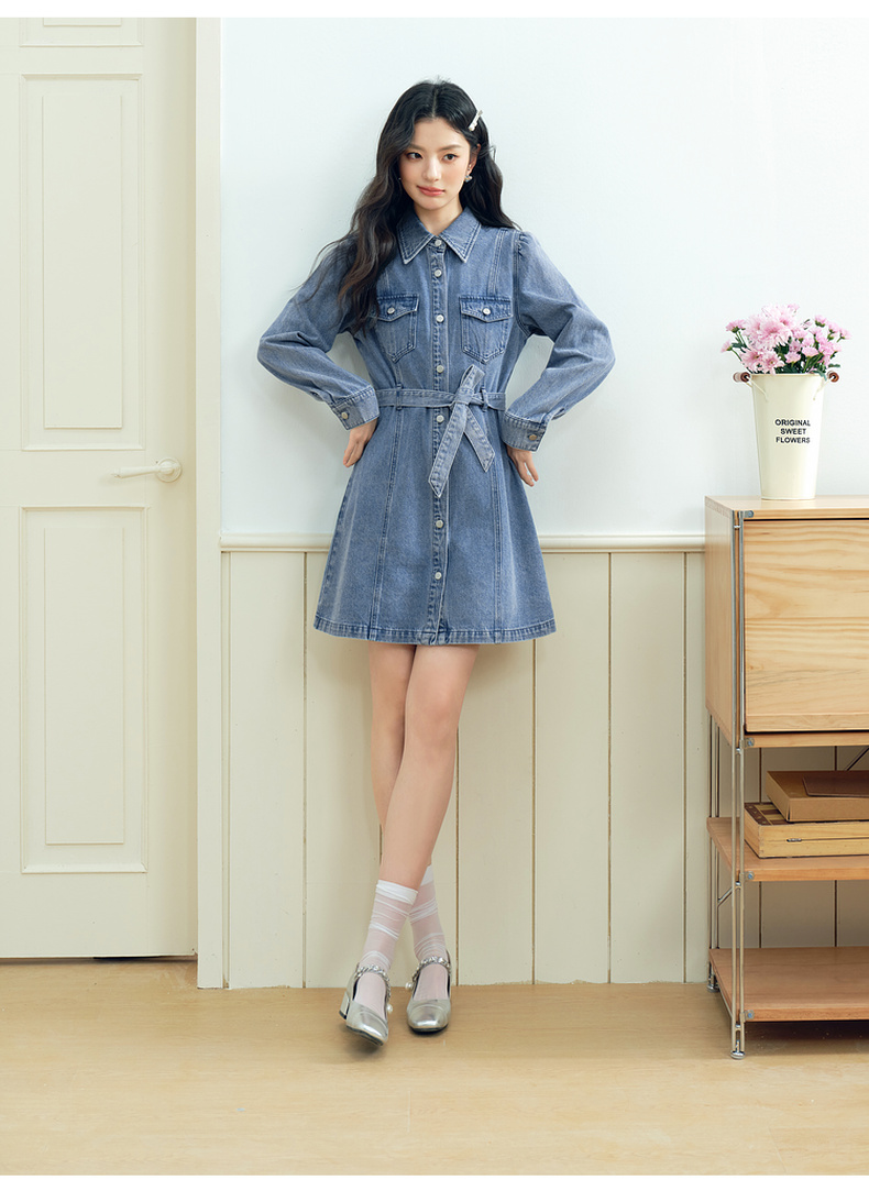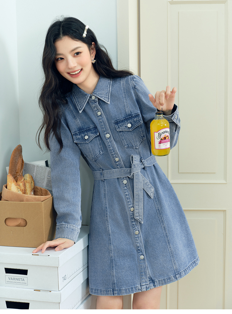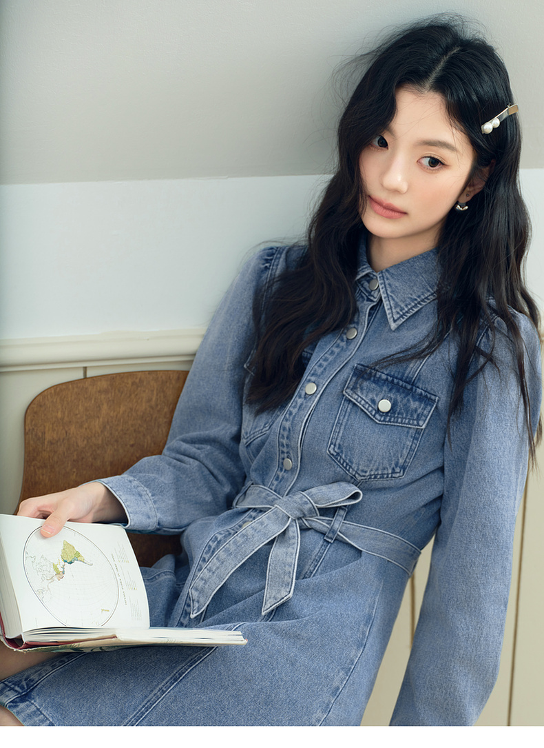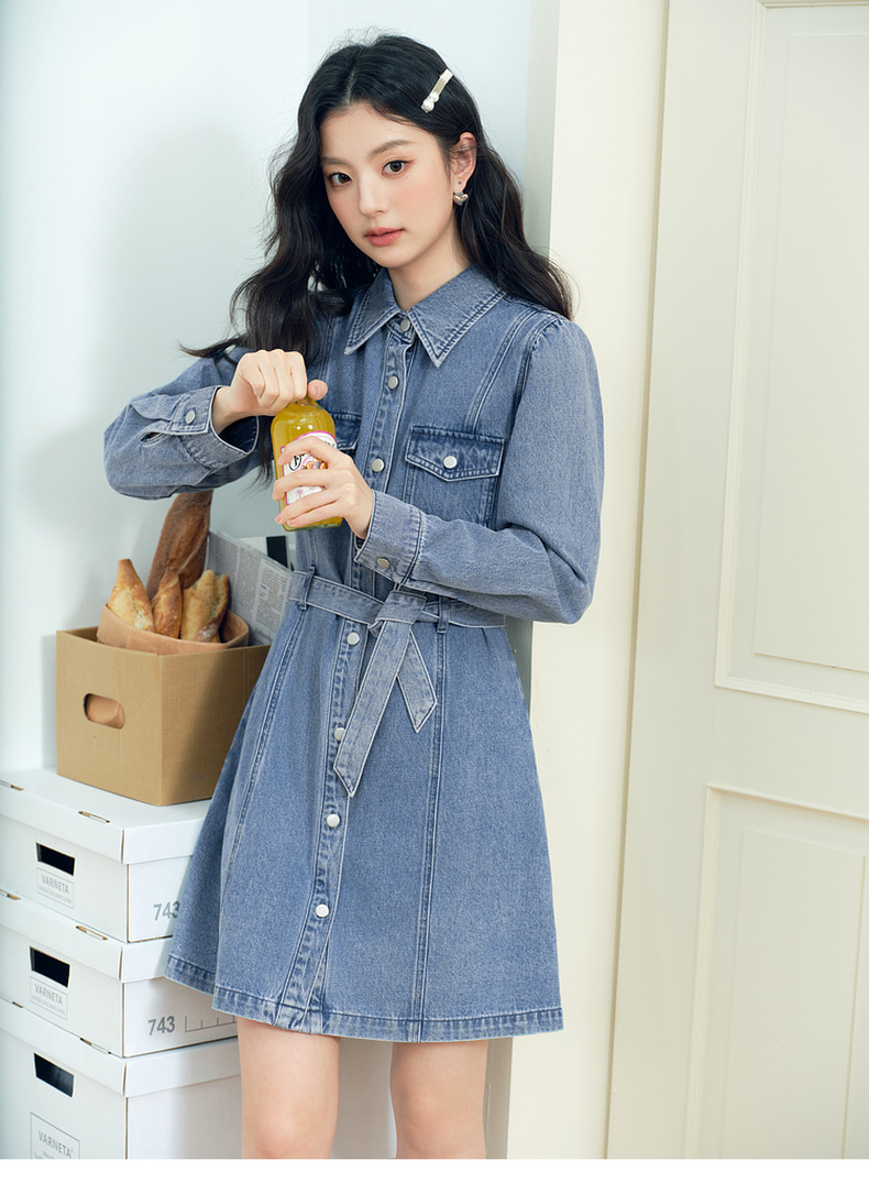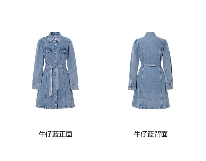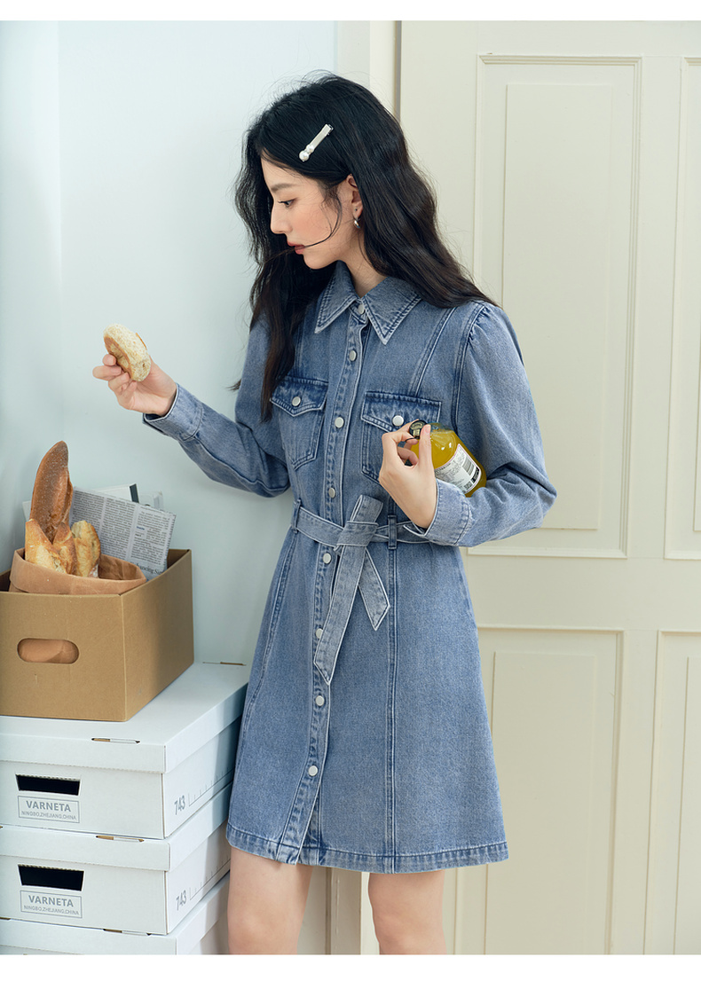 【严选】诗凡黎廓形牛仔连衣裙2025春新款翻领气质收腰复古显瘦中长裙7G3190541