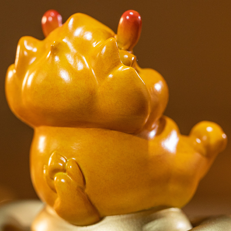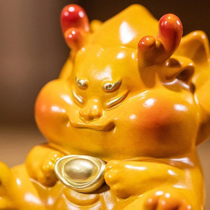 “龙腚发财”的摆件,也很有意思,小龙手抱着小元宝,腚坐在大元宝上,萌趣可爱。“腚”与定同音,寓意一定发财。