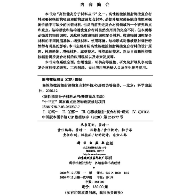 《高性能微波辐射调控复合材料技术》为“高性能高分子材料丛书”之一。高性能微波辐射调控复合材料主要包括结构吸波和结构透波复合材料,是提升航空装备隐身性能和探测性能不可缺少的关键材料,也是当前先进复合材料领域的一个研究热点和重点。结构吸波和结构透波复合材料虽然应用目的完全不同,但本质都是微波的辐射调控,因此称为微波辐射调控复合材料。微波辐射调控复合材料的不同树脂基体、增强材料、使用环境、结构形式对微波辐射调控特性都有明显的影响。《高性能微波辐射调控复合材料技术》主要介绍高性能微波辐射调控复合材料的设计原理、树脂基体、增强材料、成型技术、性能表征技术,以及目前高性能微波辐射调控复合材料的应用现状以及未来发展等。