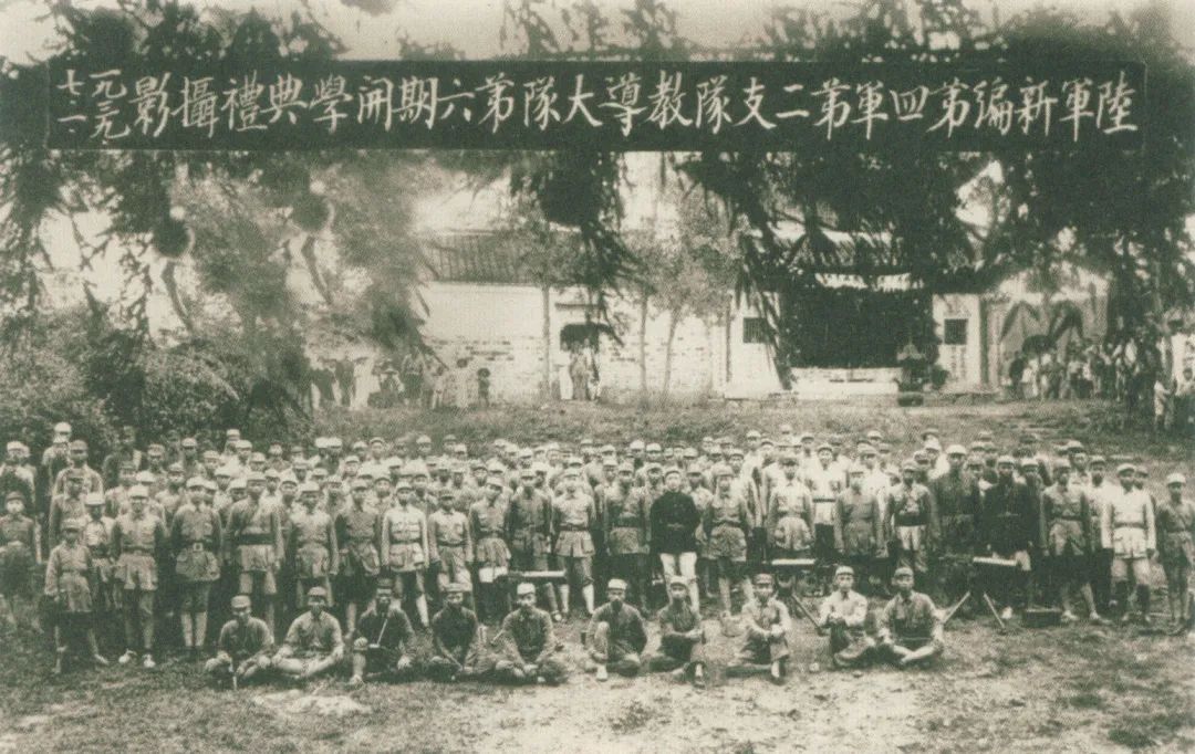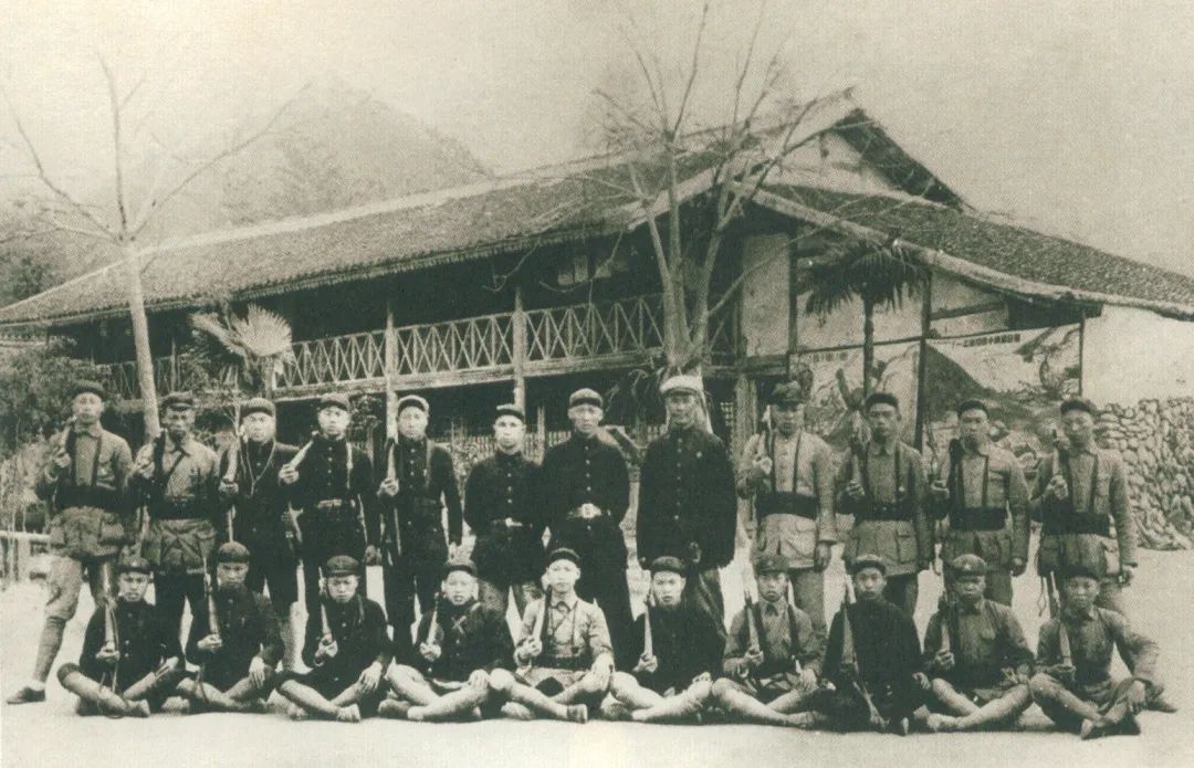 粟裕率红军挺进师进驻浙江省平阳县北港风林村,开办训练班和干部学校,为奔赴抗日前线积极准备,在山门抗日救亡干部学校前合影。