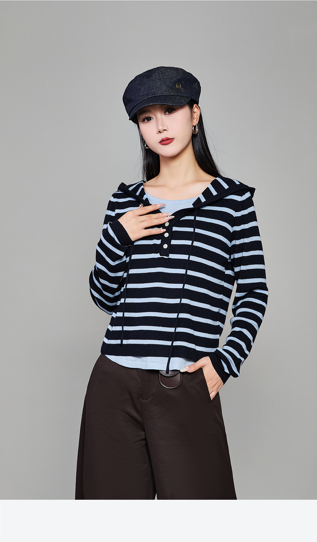 冬上新海军风条纹连帽宽松休闲长袖毛衣1254010 商品图0