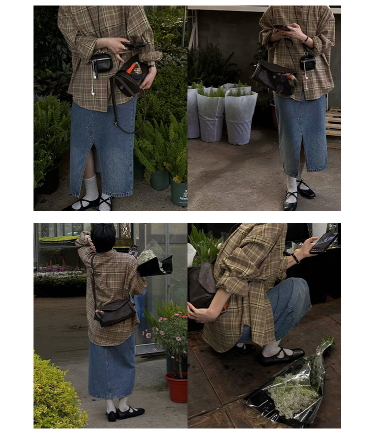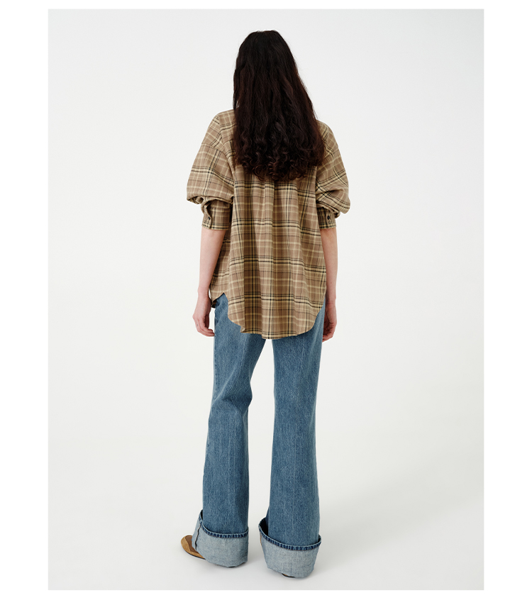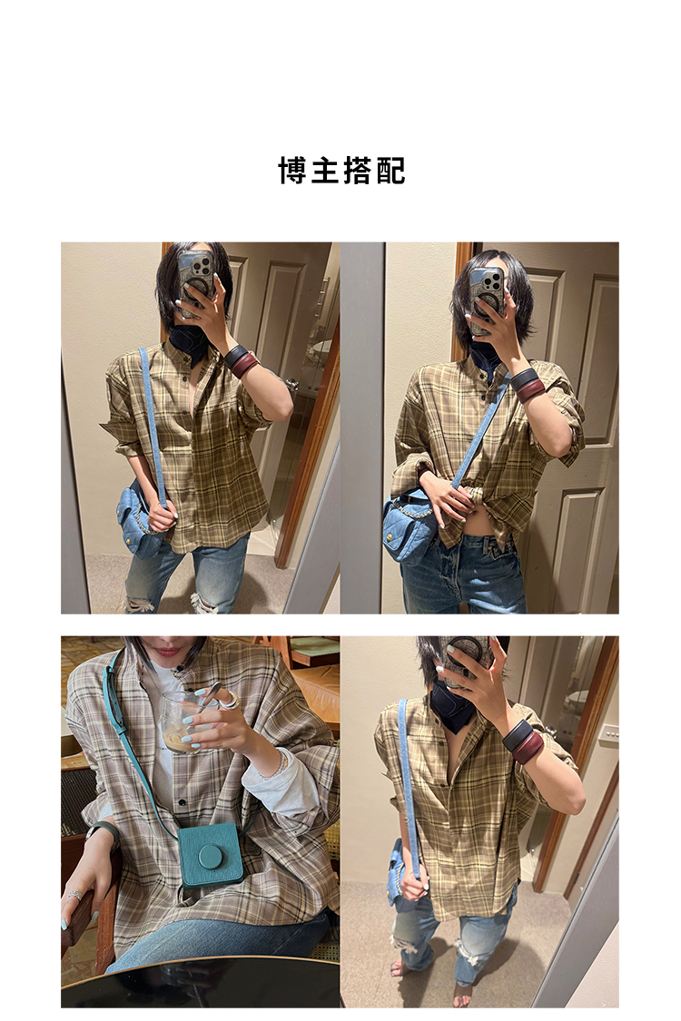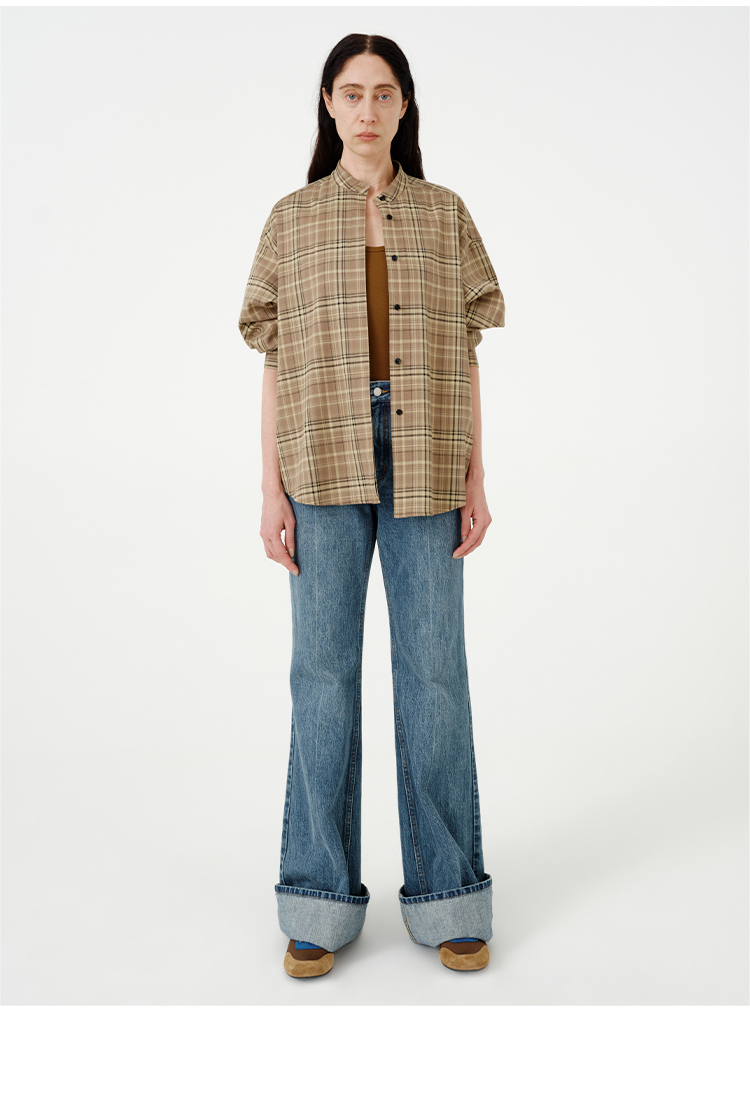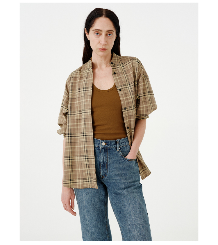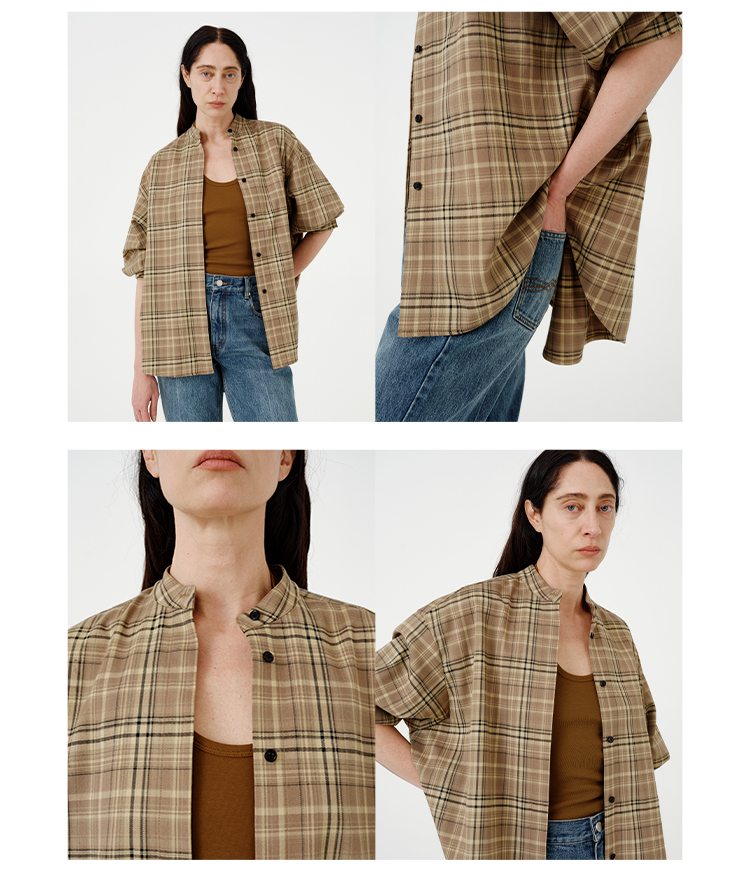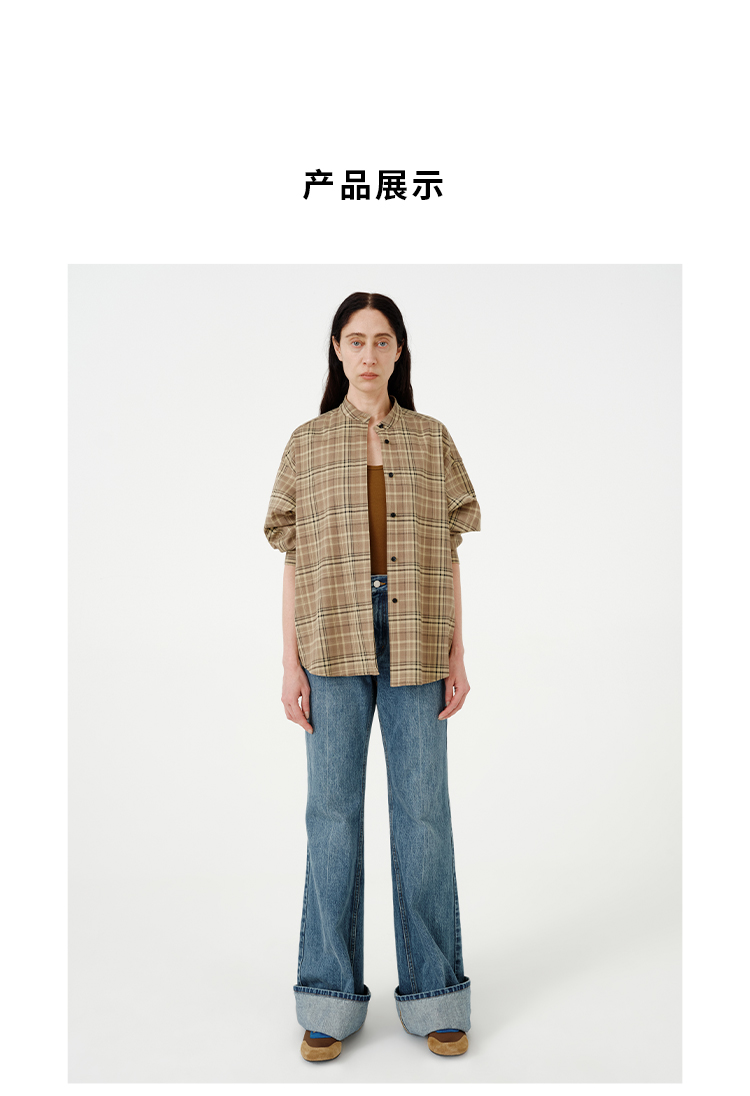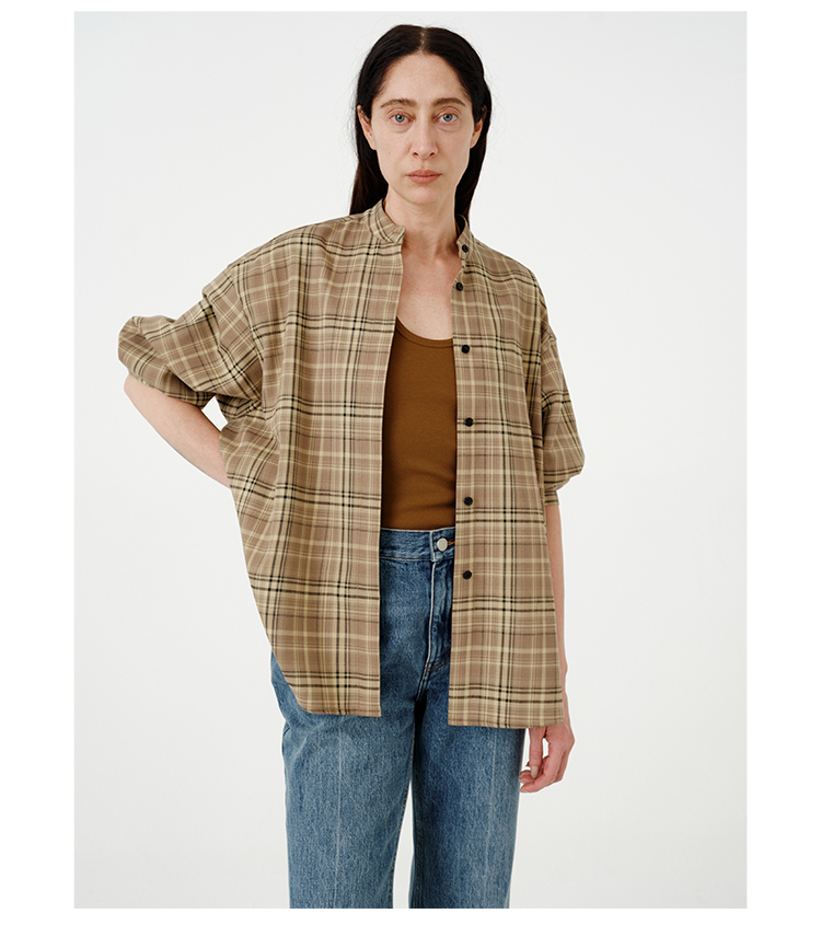 HIDEMI饼干色色织格纹小立领圆领廓形宽松衬衫