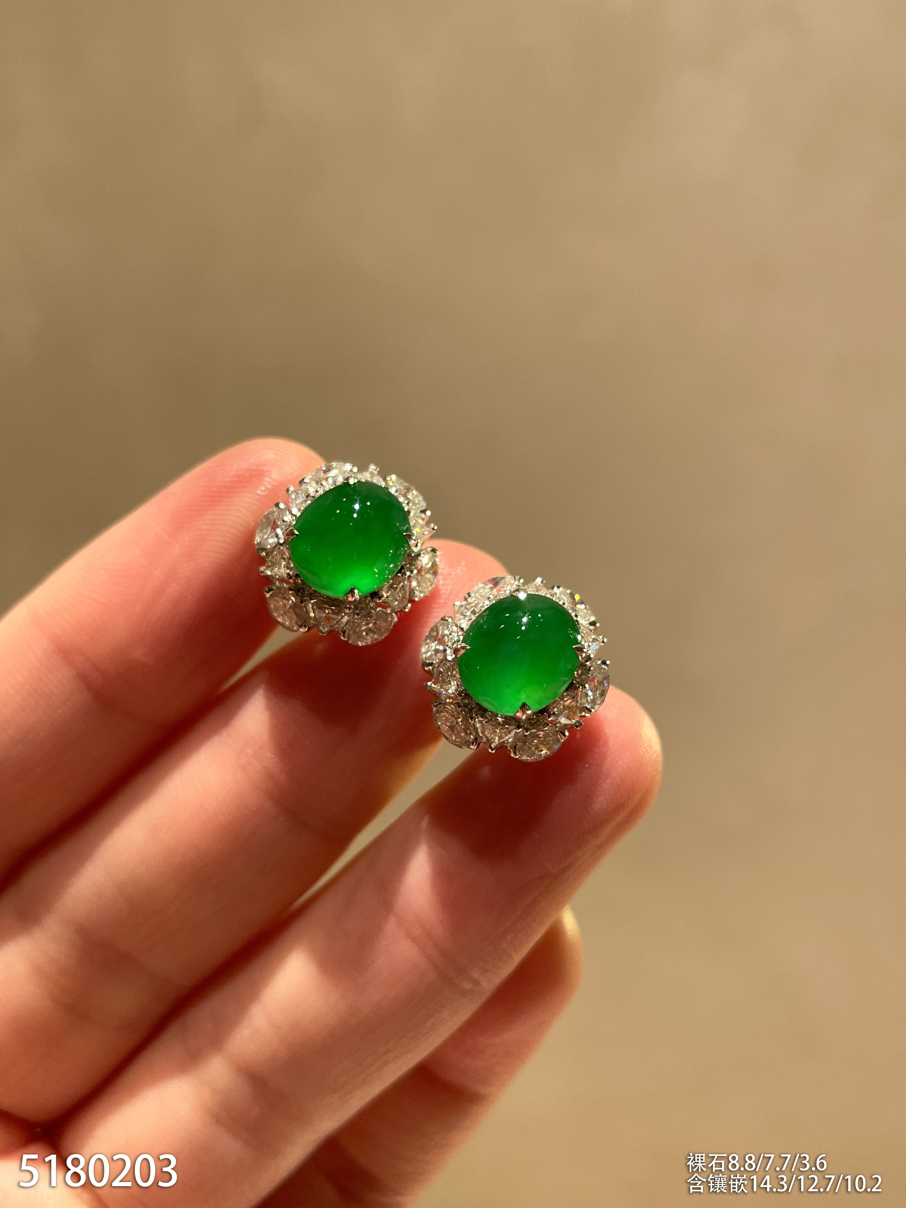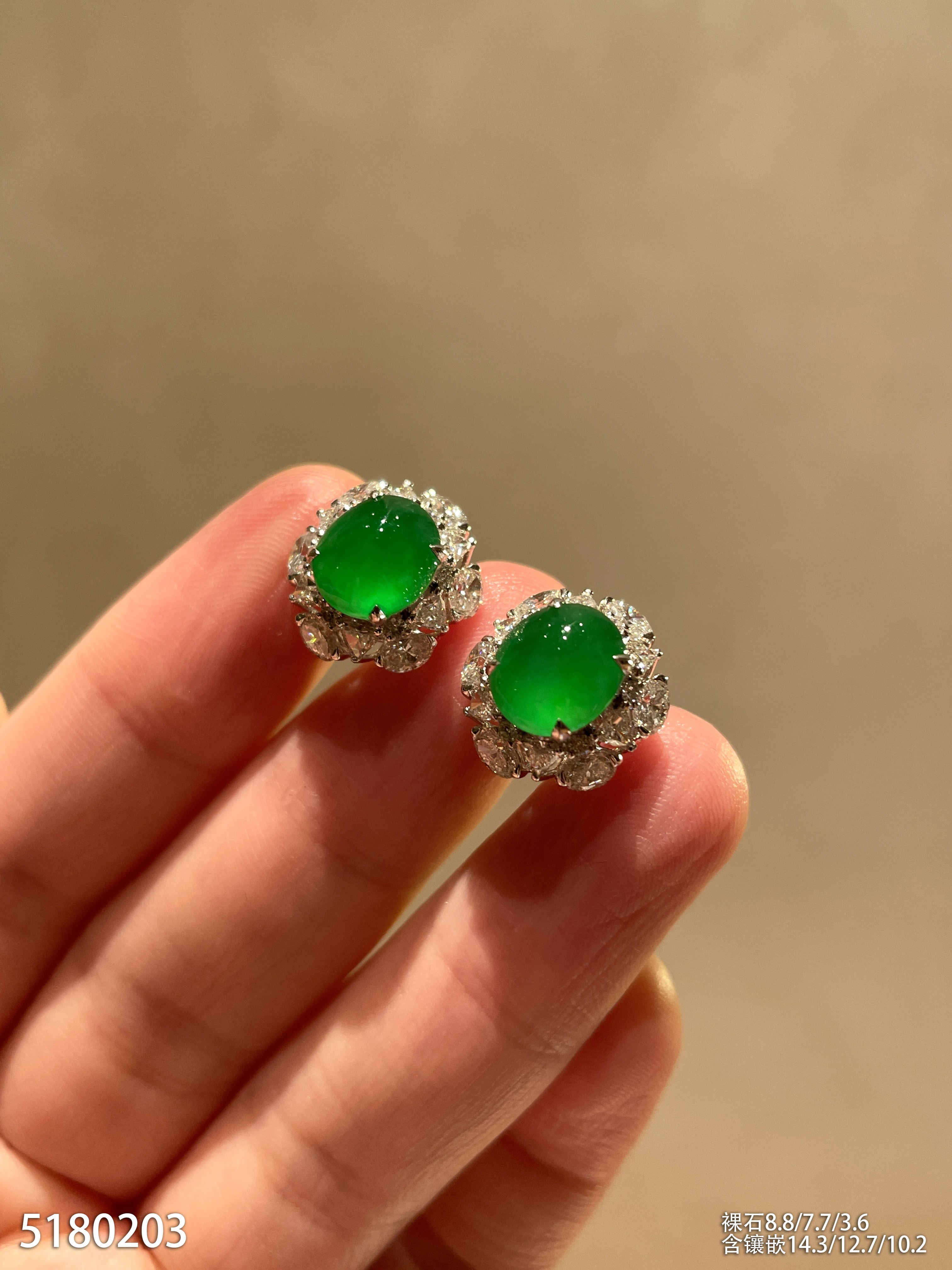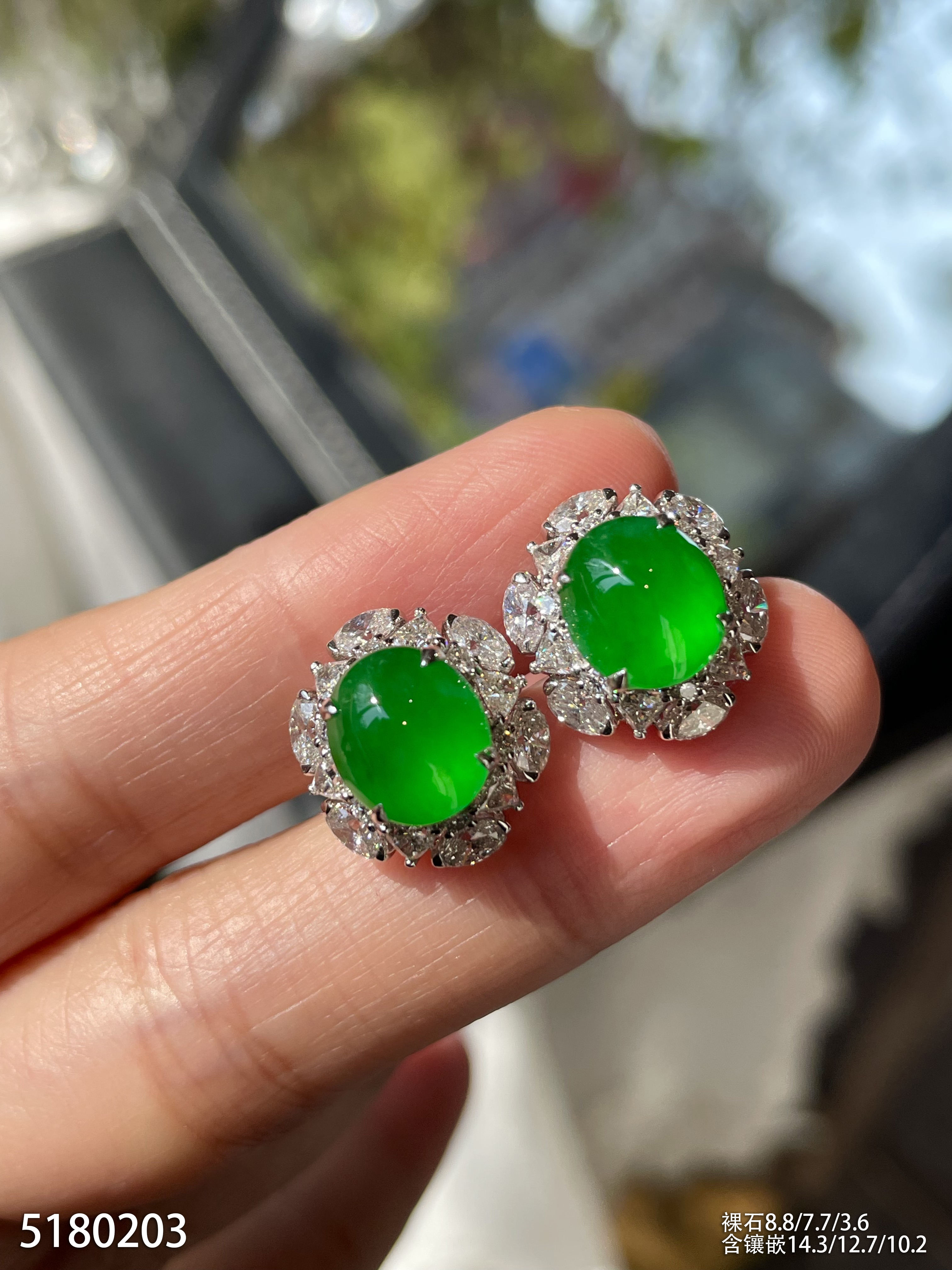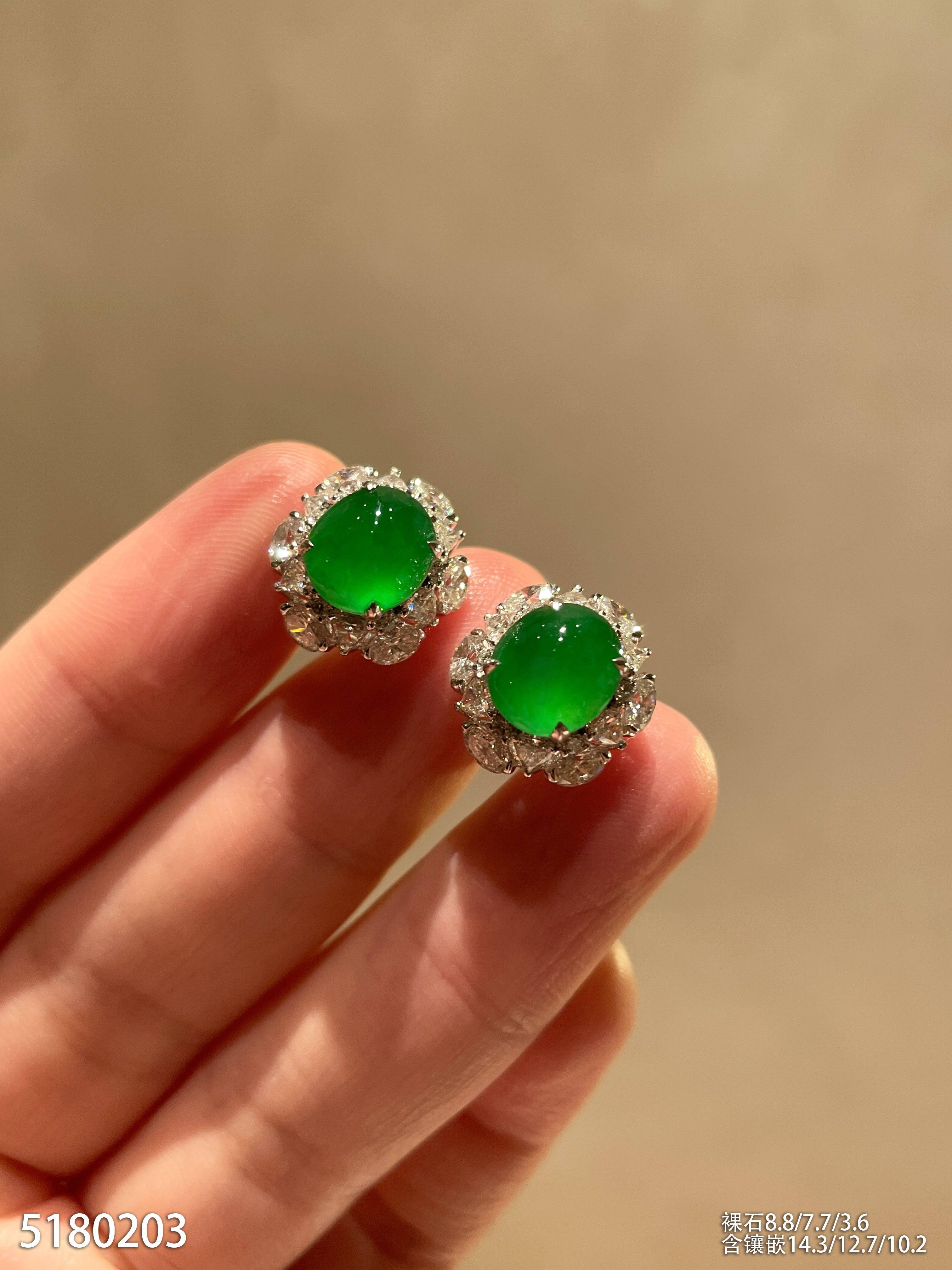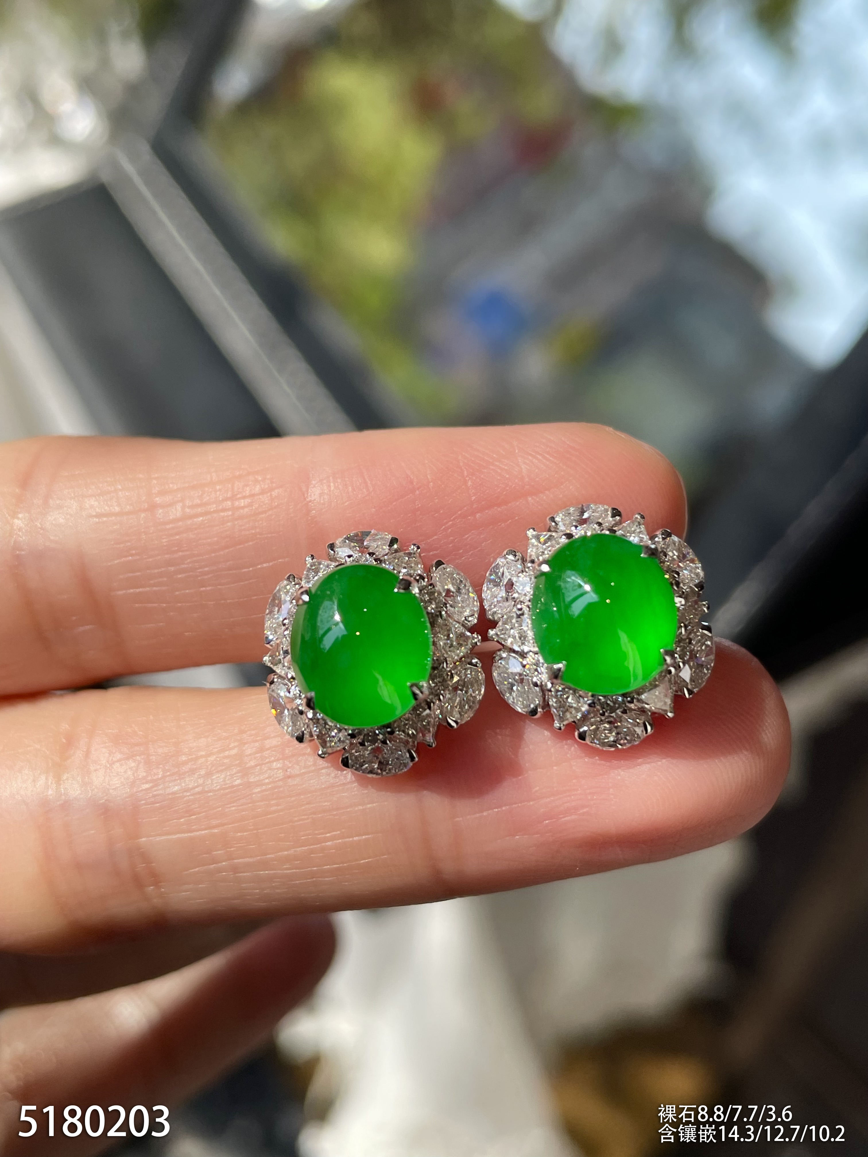 老坑玻璃种艳绿蛋面耳钉。95999【5180203】