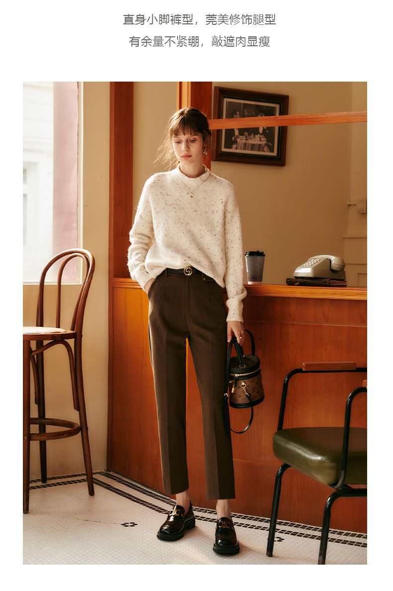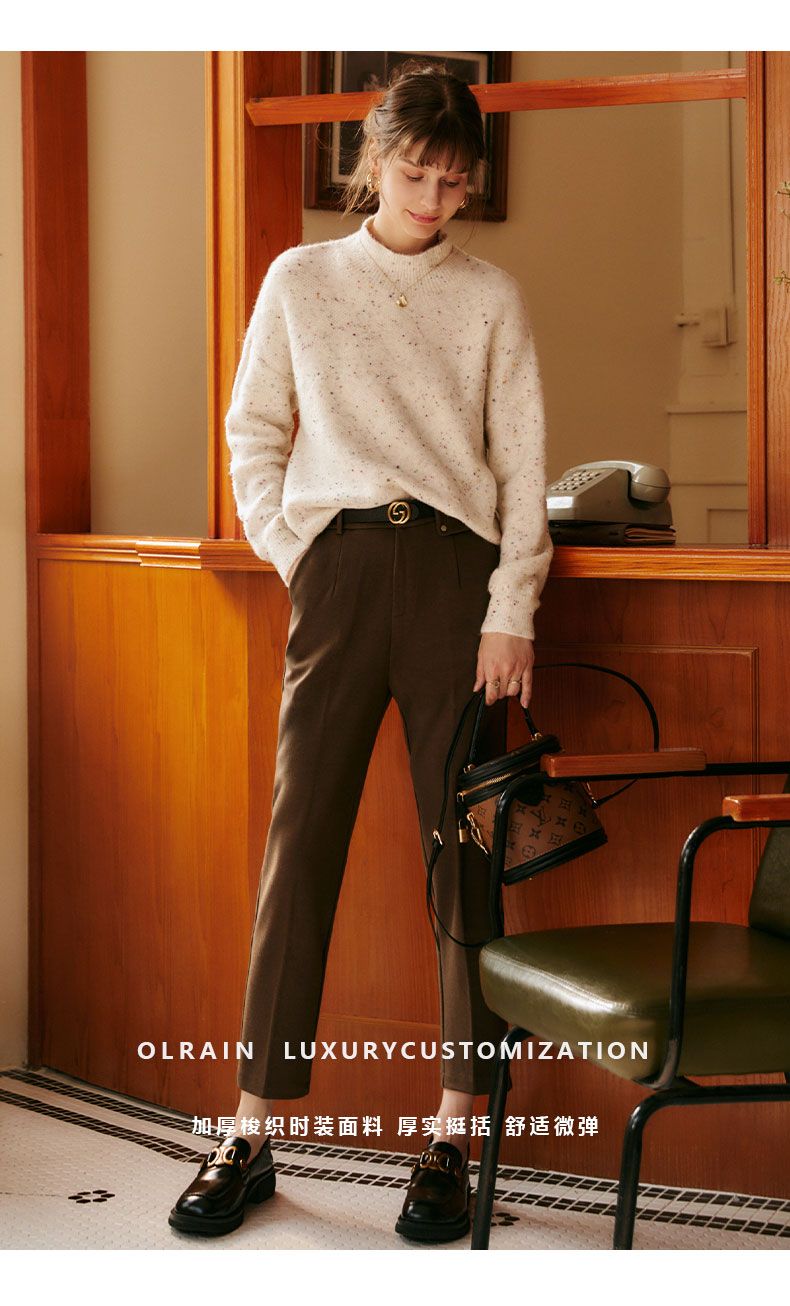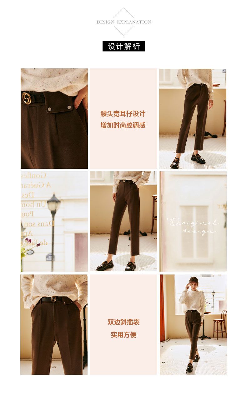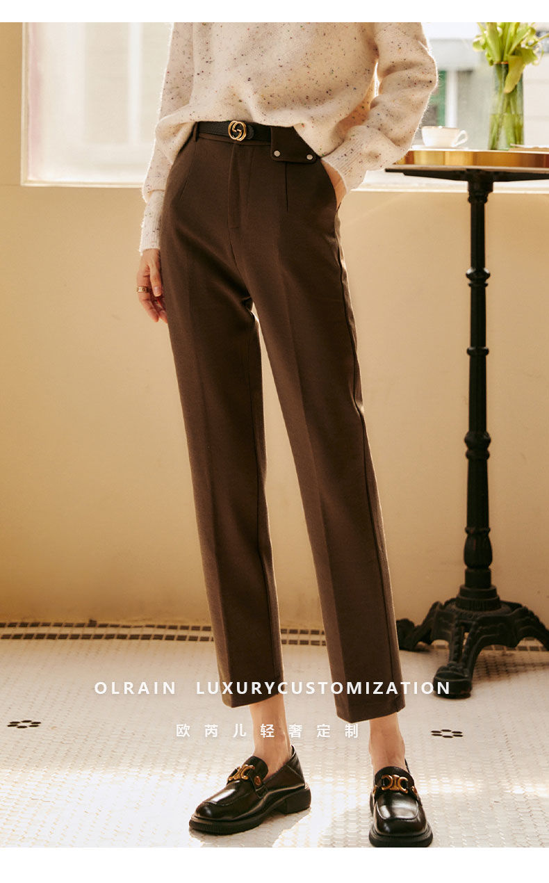 欧芮儿咖色休闲裤女秋冬2021年新款高腰显瘦时尚加绒九分阔腿裤子