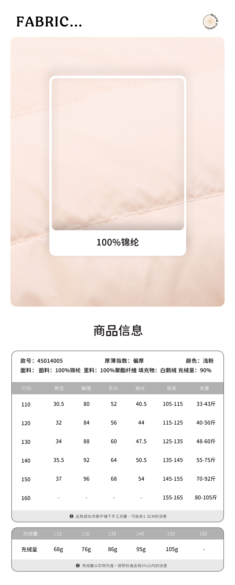 | 含绒量: 90% | 材质成分: 聚酰胺纤维(锦纶)100% |