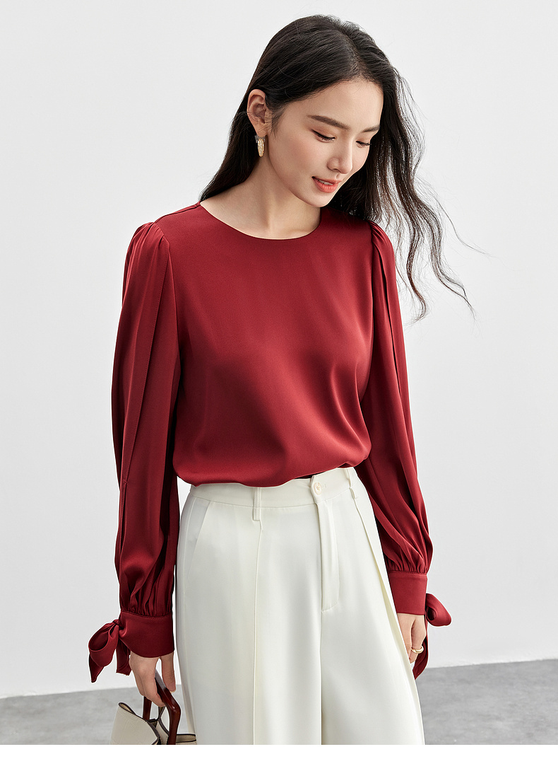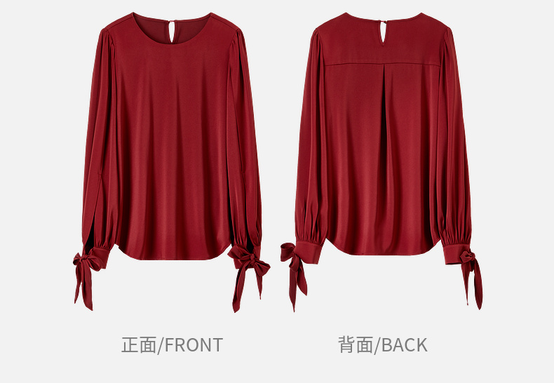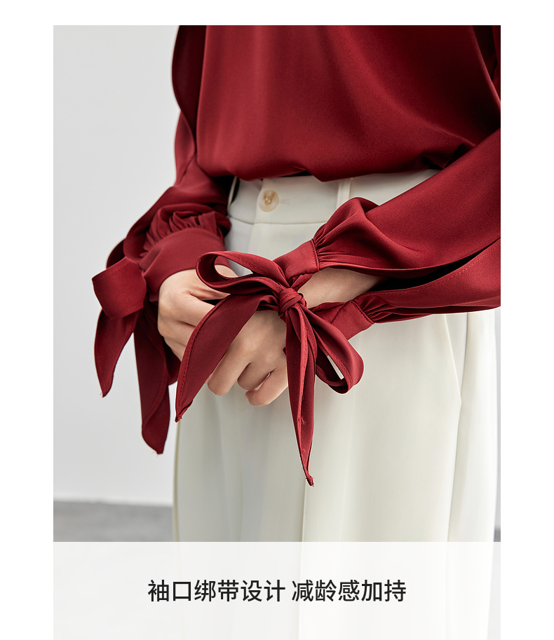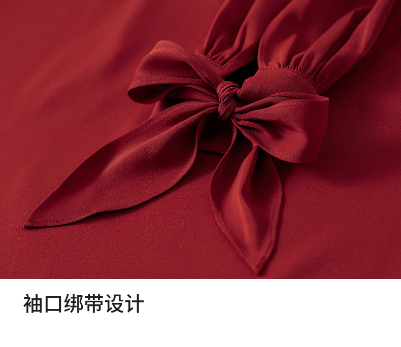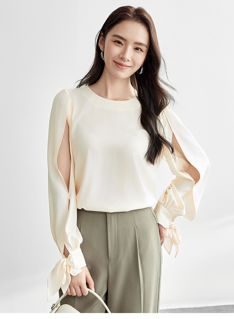 【内购】通勤气质设计感破缝开衩绑带长袖水滴镂空圆领清爽垂感雪纺衫-151V58068