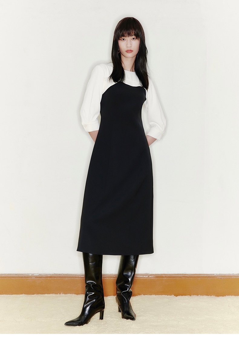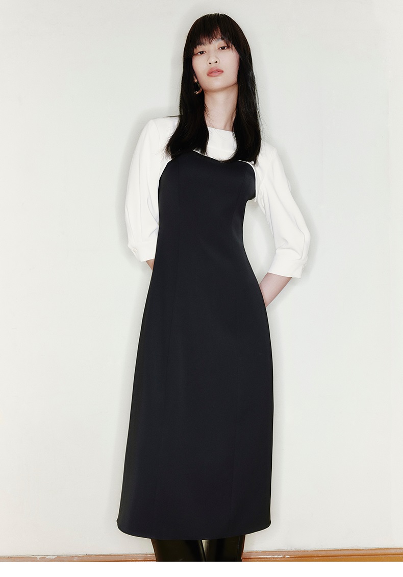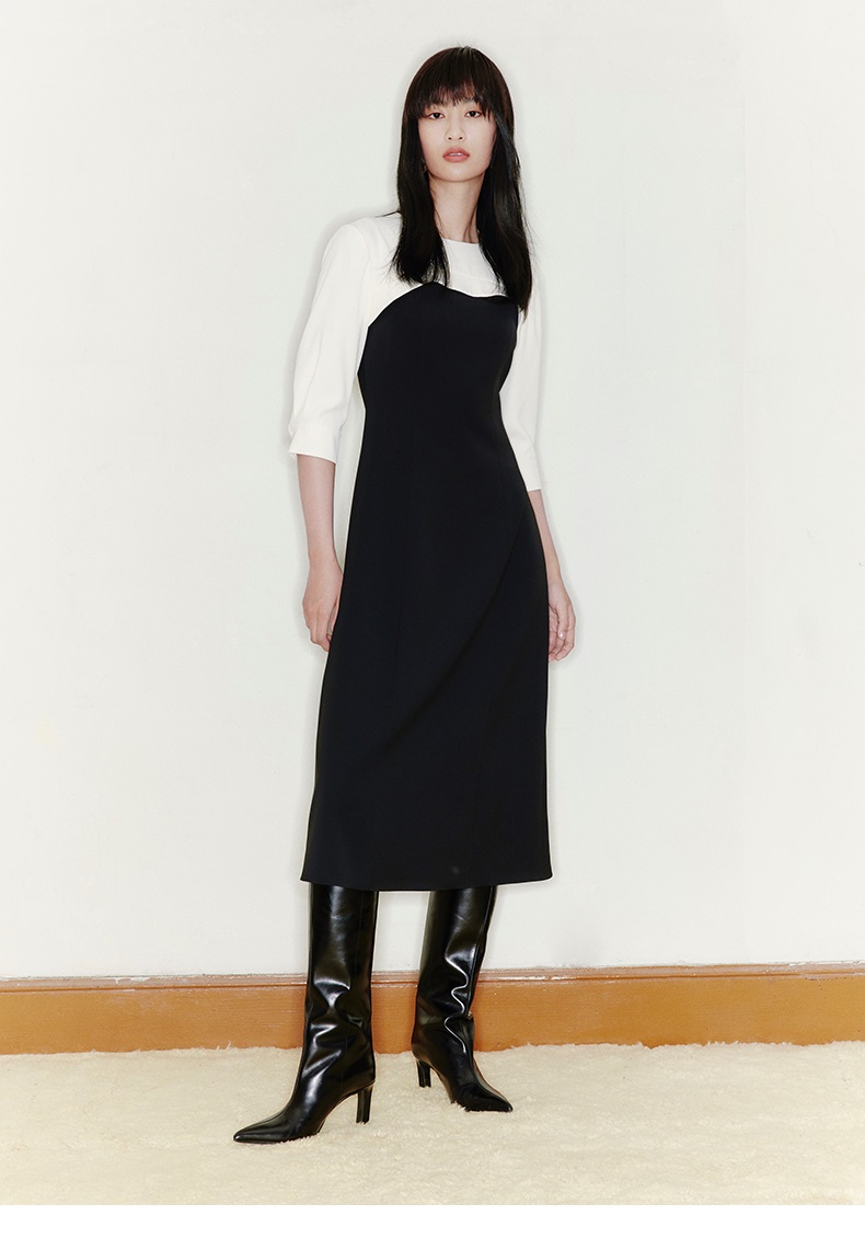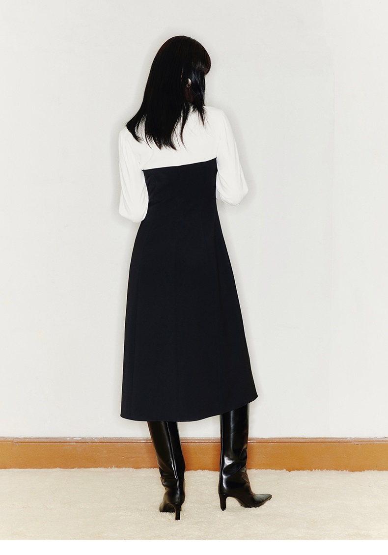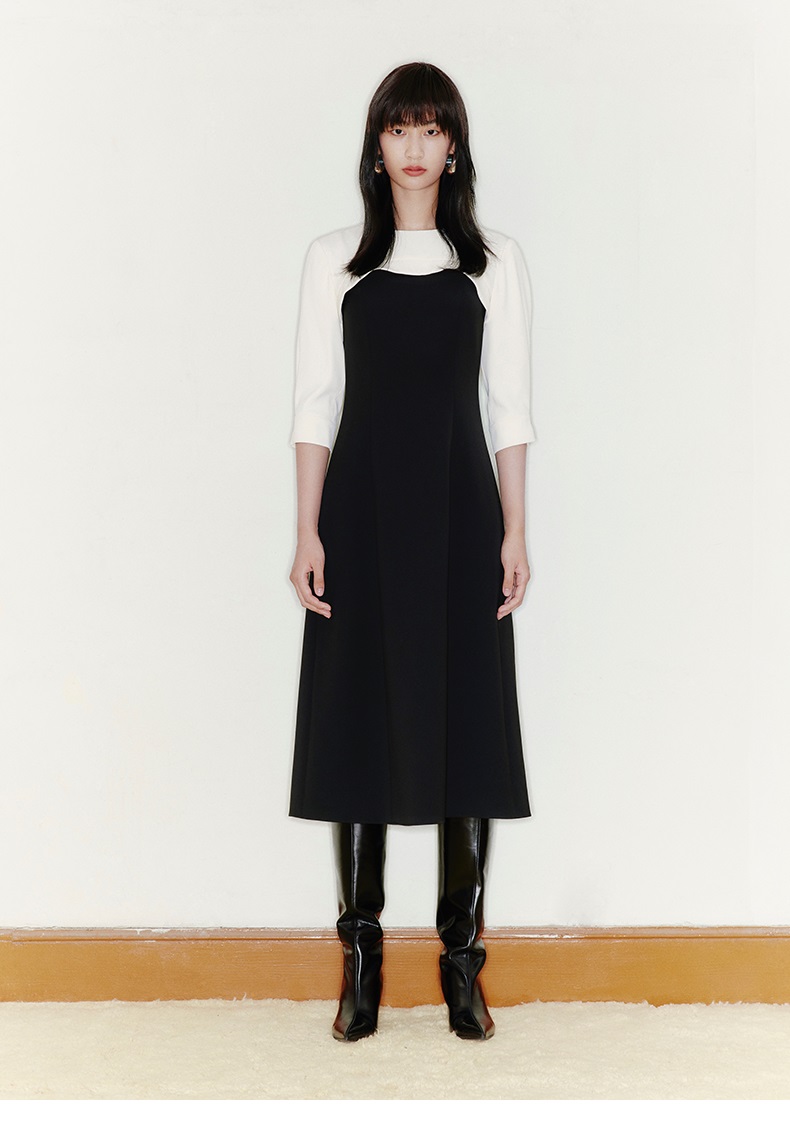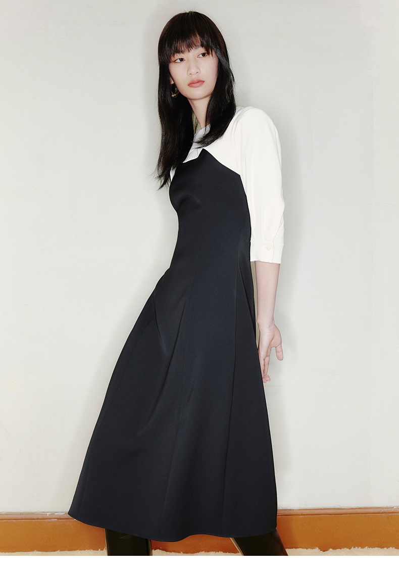 【马蹄莲】弧形立体拼接收腰A字过膝连衣裙/22000046