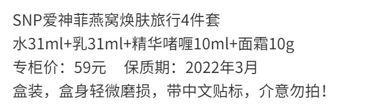 【爆款超低价预售 急单慎拍】临期处理 韩国SNP爱神菲燕窝焕肤旅行4件套水乳精华霜小样试用装