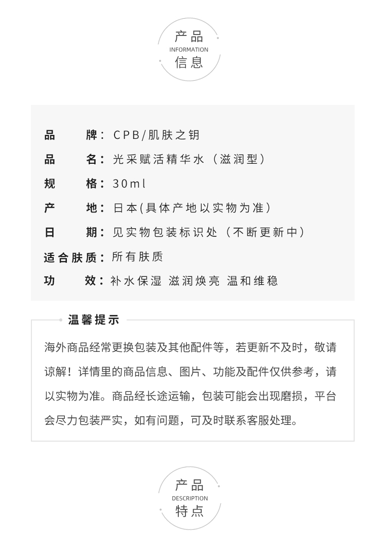 CPB肌肤之钥光采赋活精华水滋润型30ml小样 补水保湿 滋润焕亮