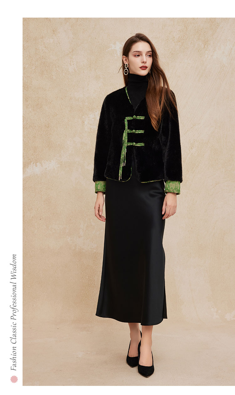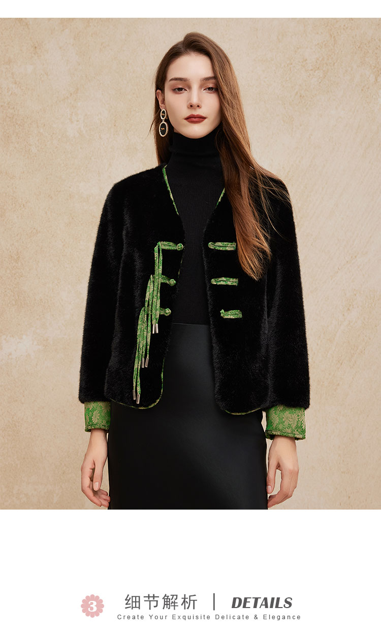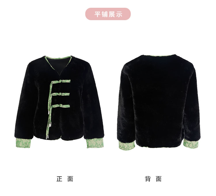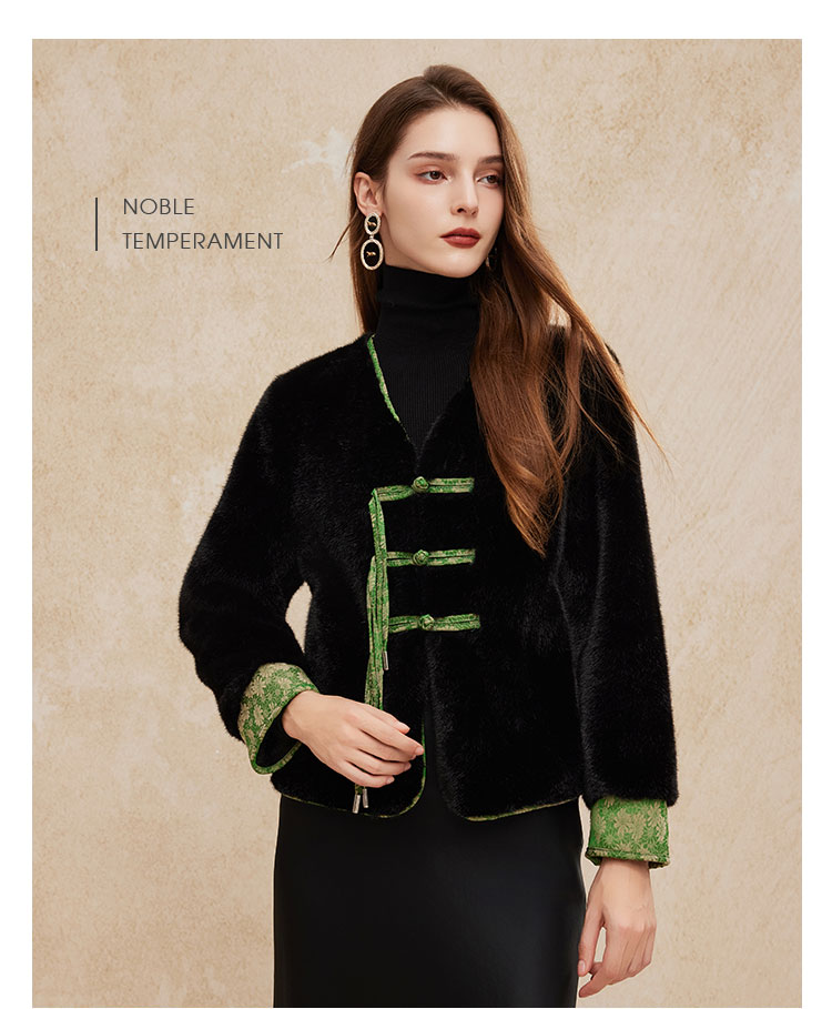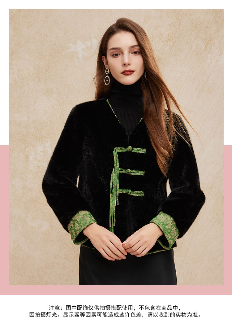 PH113斯尔丽24秋冬时尚新中式国风外套环保皮草盘扣提花袖口短毛绒上衣