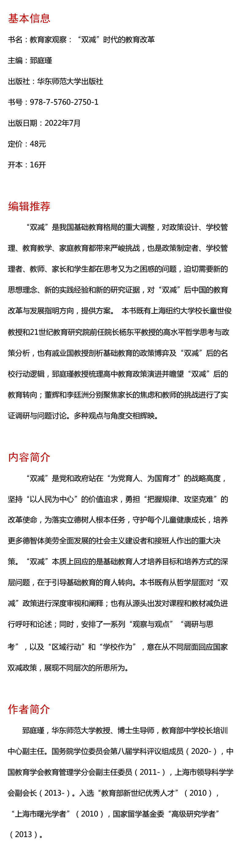 “双减”是党和政府站在“为党育人、为国育才”的战略高度,坚持“以人民为中心”的价值追求,勇担“把握规律、攻坚克难”的改革使命,为落实立德树人根本任务,守护每个儿童健康成长,培养更多德智体美劳全面发展的社会主义建设者和接班人作出的重大决策。“双减”本质上回应的是基础教育人才培养目标和培养方式的深层问题,在于引导基础教育的育人转向。本书既有从哲学层面对“双减”政策进行深度审视和阐释;也有从源头出发对课程和教材减负进行呼吁和论述;同时,安排了一系列“观察与观点”“调研与思考”,以及“区域行动”和“学校作为”,意在从不同层面回应国家双减政策,展现不同层次的所思所为。