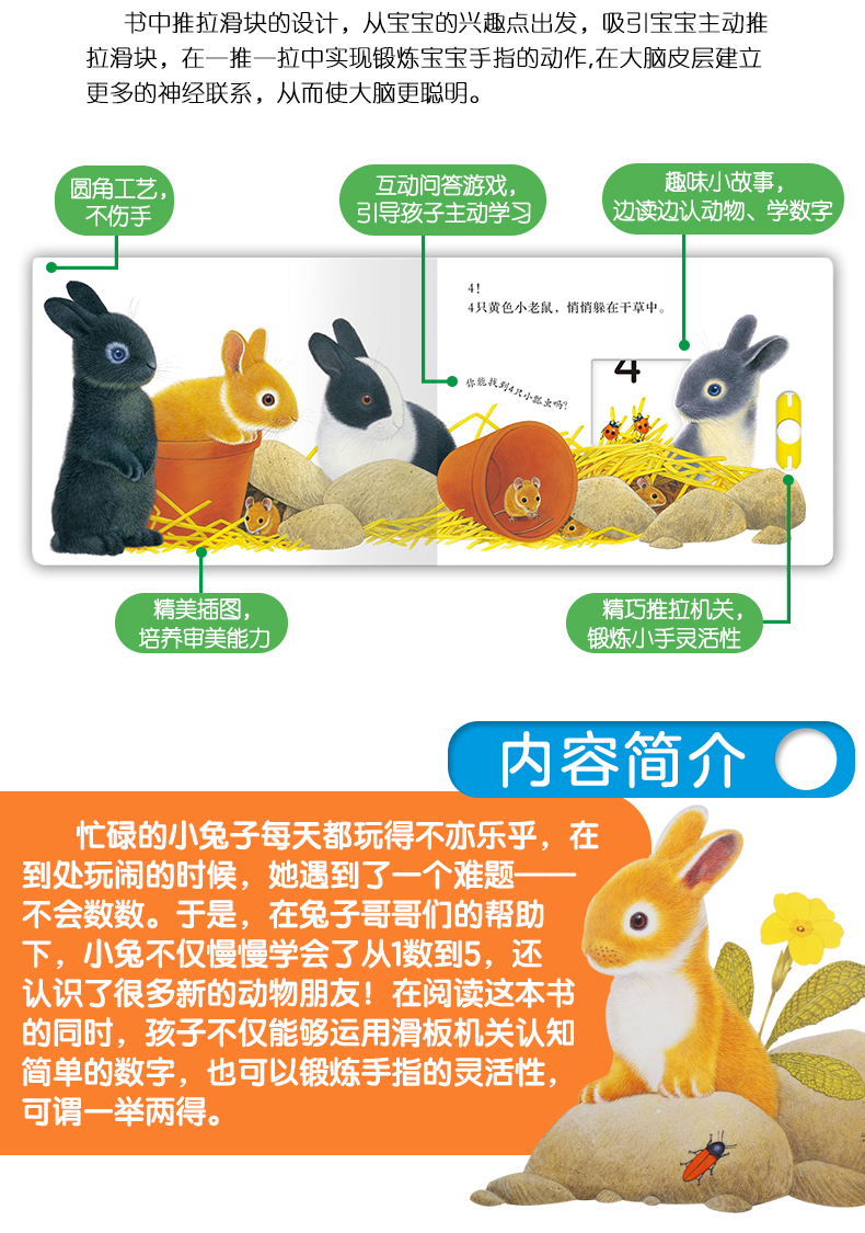 忙碌的小兔子每天都玩得不亦乐乎,在到处玩闹的时候,她遇到了一个难题——不会数数。于是,在兔子哥哥们的帮助下,小兔不仅慢慢学会了从1数到5,还认识了很多新的动物朋友!在阅读这本书的同时,孩子不仅能够运用滑板机关认知简单的数字,也可以锻炼手指的灵活性,可谓一举两得。