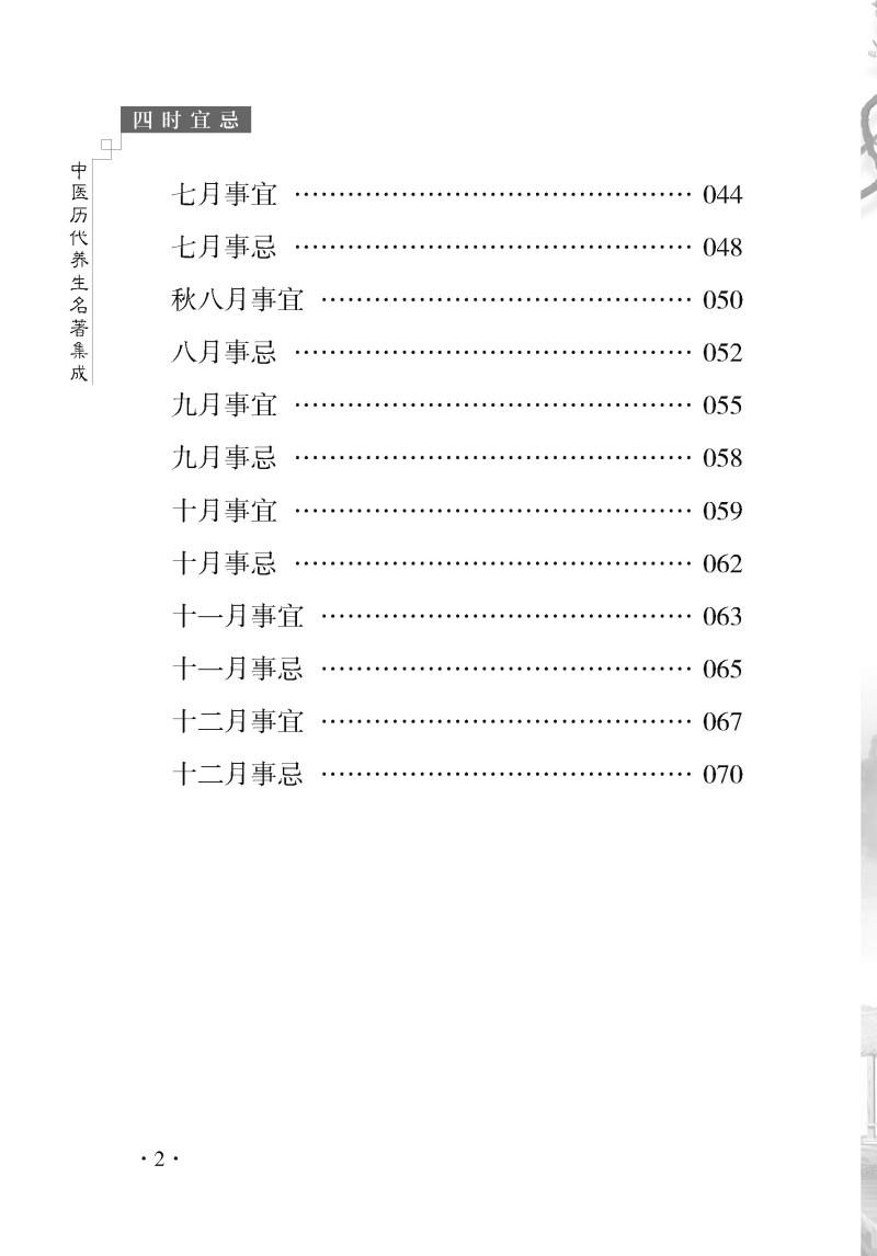 书中内容分为“事宜”与“事忌”两部分,每月各设一章,系统性地总结了不同月份的养生宜忌。如正月注重调养阳气,二月强调春季养生,三月至五月则关注春夏交替时节的养生原则,六月注重夏季防暑与调理,七月至八月则强调夏季末期与初秋的养生要点,九月至十二月则围绕秋季与冬季的养生展开。