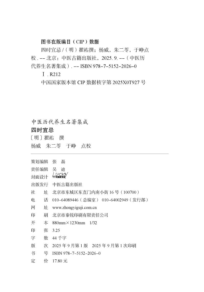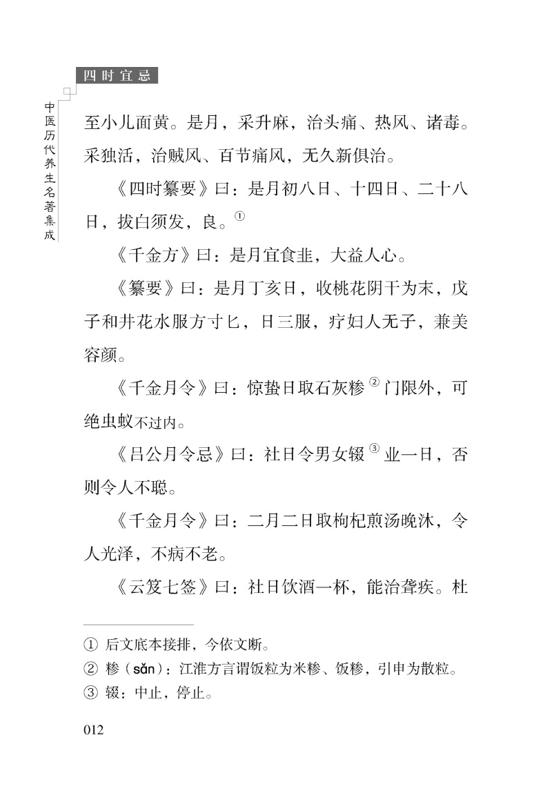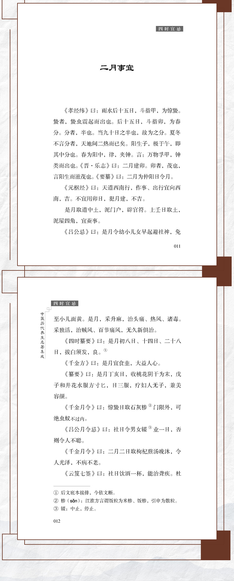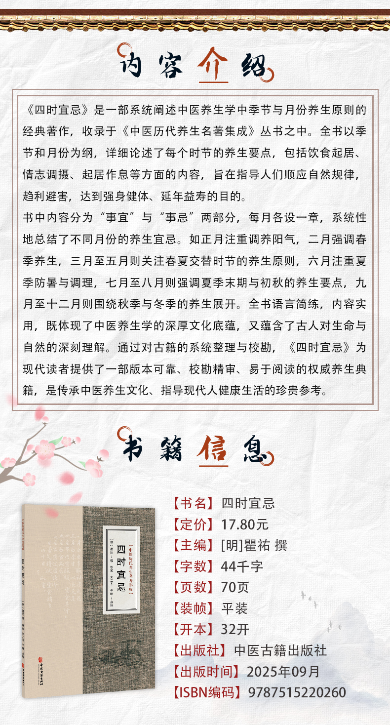 全书语言简练,内容实用,既体现了中医养生学的深厚文化底蕴,又蕴含了古人对生命与自然的深刻理解。通过对古籍的系统整理与校勘,《四时宜忌》为现代读者提供了一部版本可靠、校勘精审、易于阅读的权威养生典籍,是传承中医养生文化、指导现代人健康生活的珍贵参考。