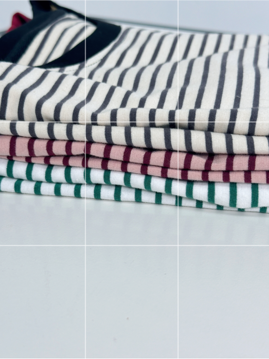 面料上:采用的拉架棉 自带竖条肌理感 区别于普通平纹的面料 手感更佳爽滑细腻 颜色配比上也是花尽了心思 米灰条纹×红粉条纹×绿白条纹 领口采用1*1撞色螺纹 每一件都非常吸睛有没有!