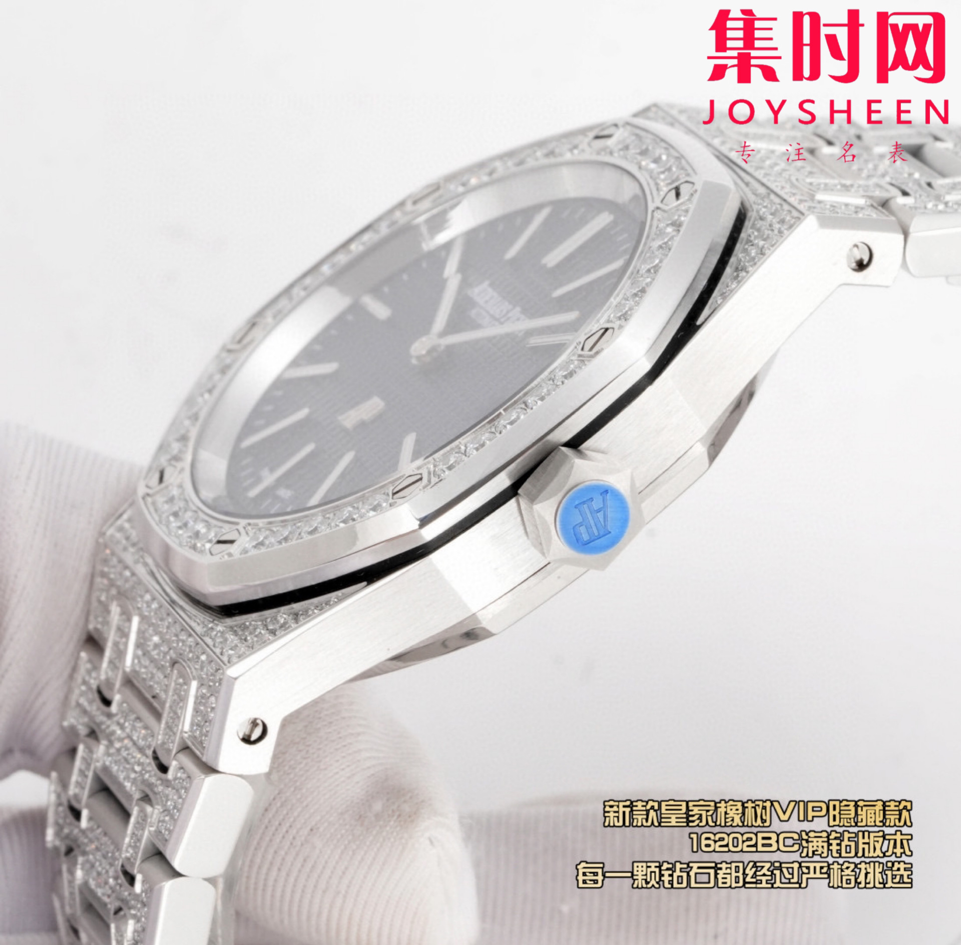 爱彼AP OMF新款皇家橡树vip隐藏款 皇家橡树满钻满天星 16202BC满钻版 男士腕表 表壳表带都采用先电白金在镶钻,质感重量达到完mei平衡。搭配高透防眩光蓝宝石玻璃镜面。自1972年由传奇制表大师杰拉尔德·吉尔多设计以来,一直是高级制表界的革命性象征,16202BC满钻版本,延续了经典的八角表圈设计同时,全表面共镶嵌进口莫桑钻,每一颗钻石都经过严格挑选,并达到VVS标准,璀璨程度叹为观止,超薄厚度9mm 表壳尺寸39mm,搭载Cal.7121自动上链机械机芯,满动储高达55小时,这款满钻在阳光或灯光璀璨夺目,大方异彩。是钢壳表无法取代的。喜欢的朋友赶紧下手,数量有限。