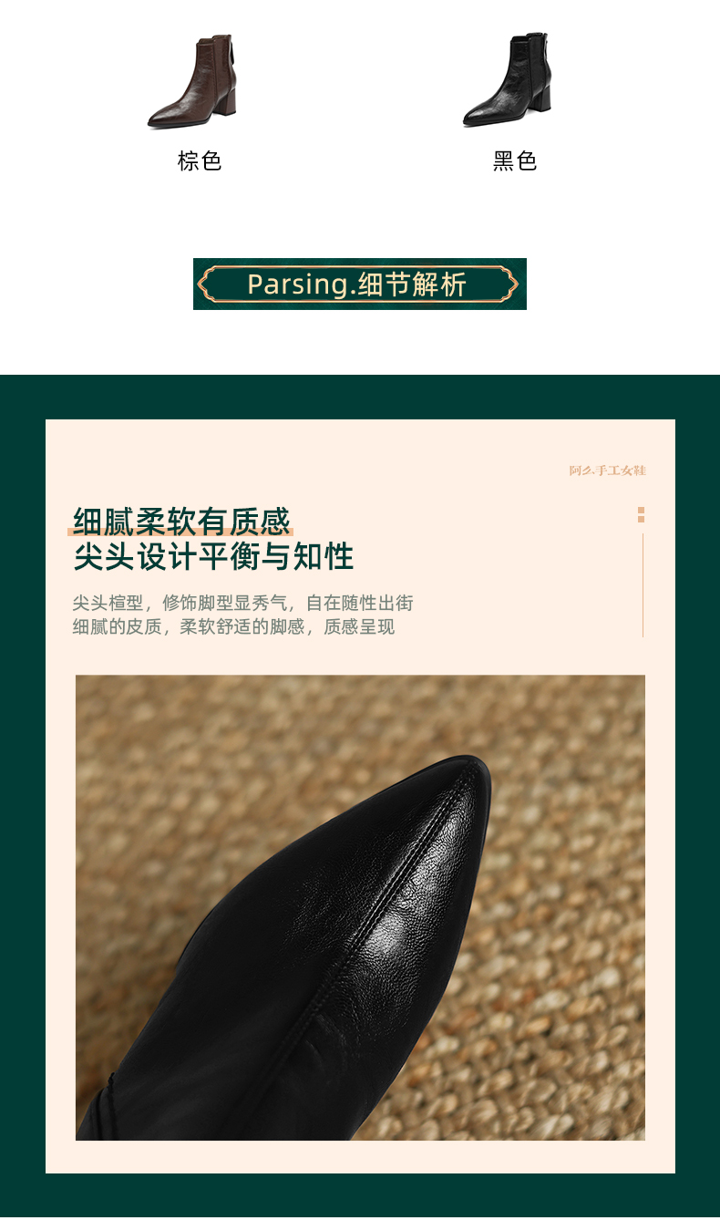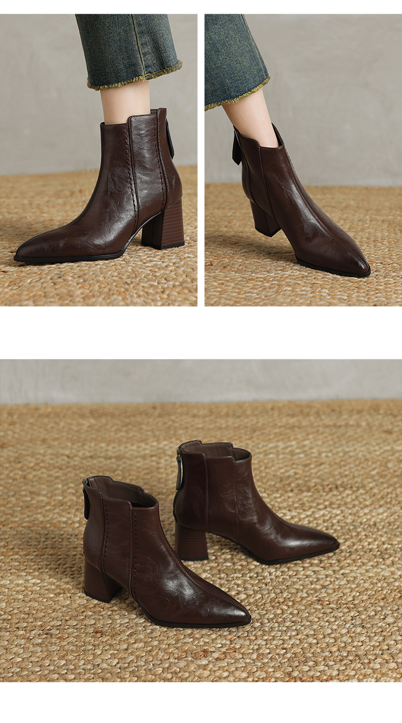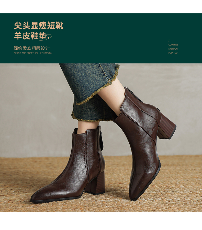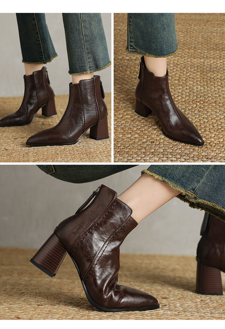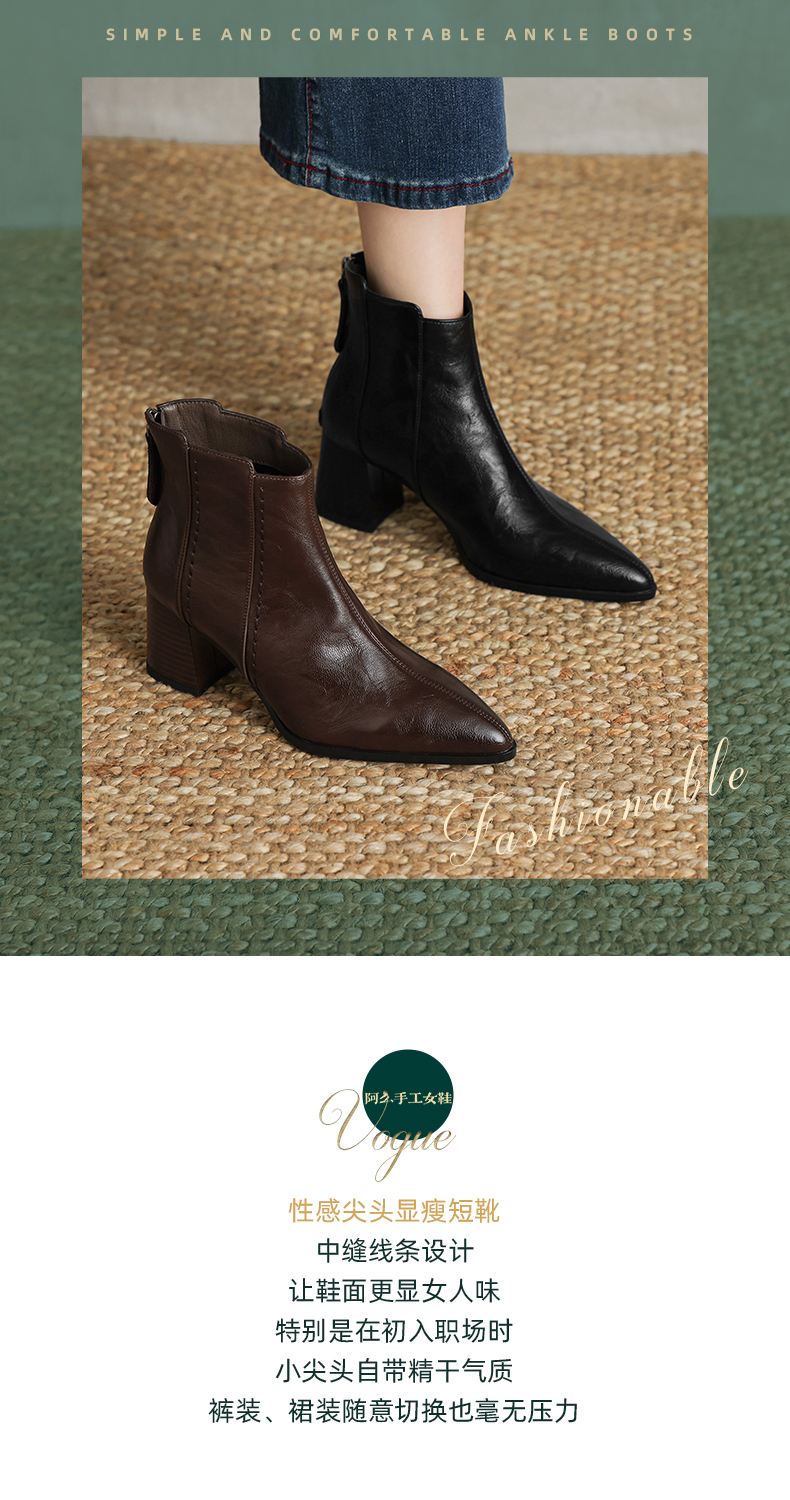 阿么手工女鞋复古尖头高跟短靴2025新款真皮棕色美式西部靴6.5CM