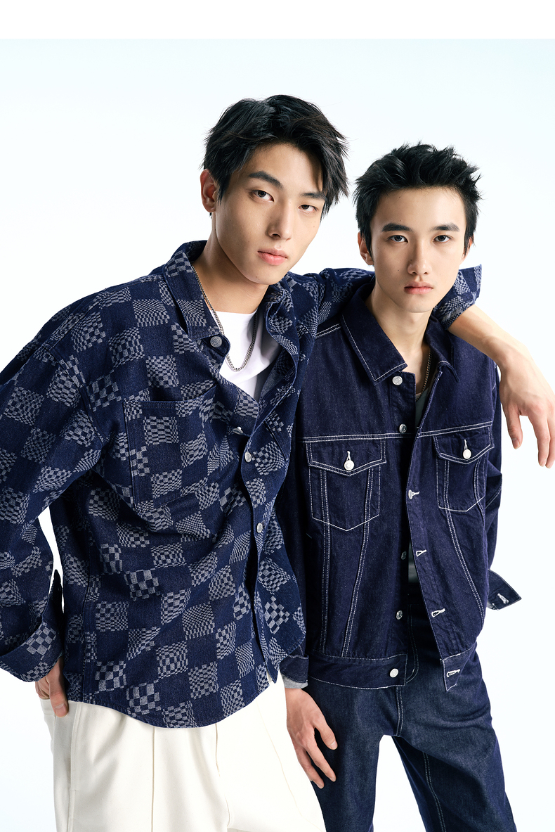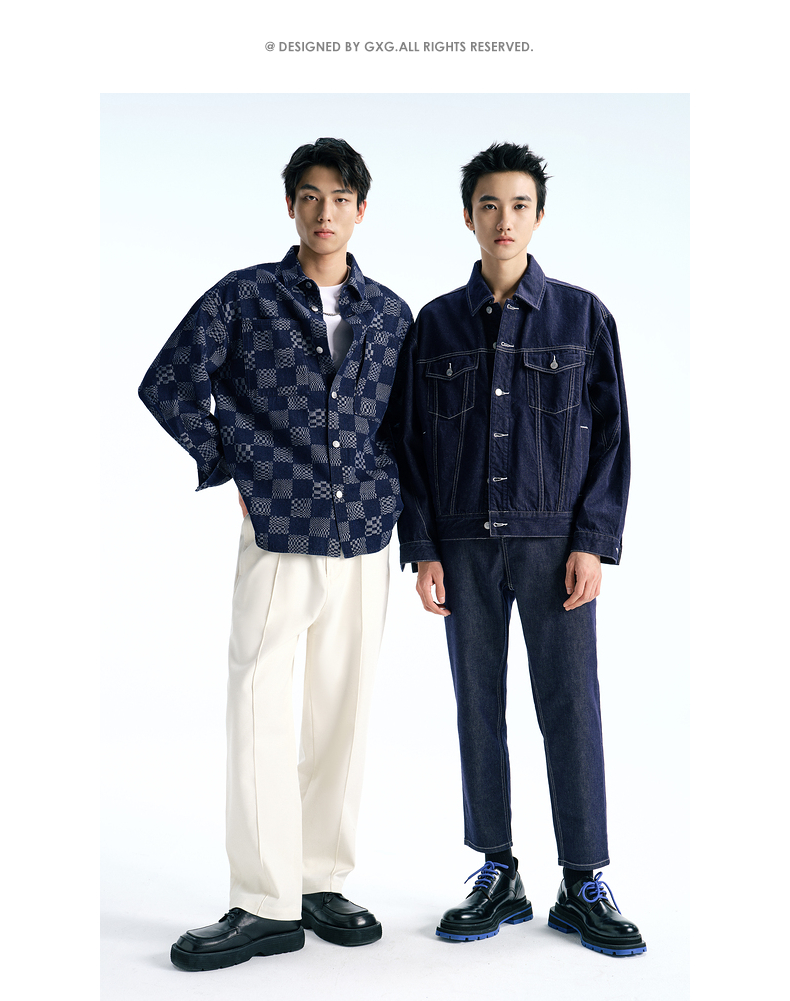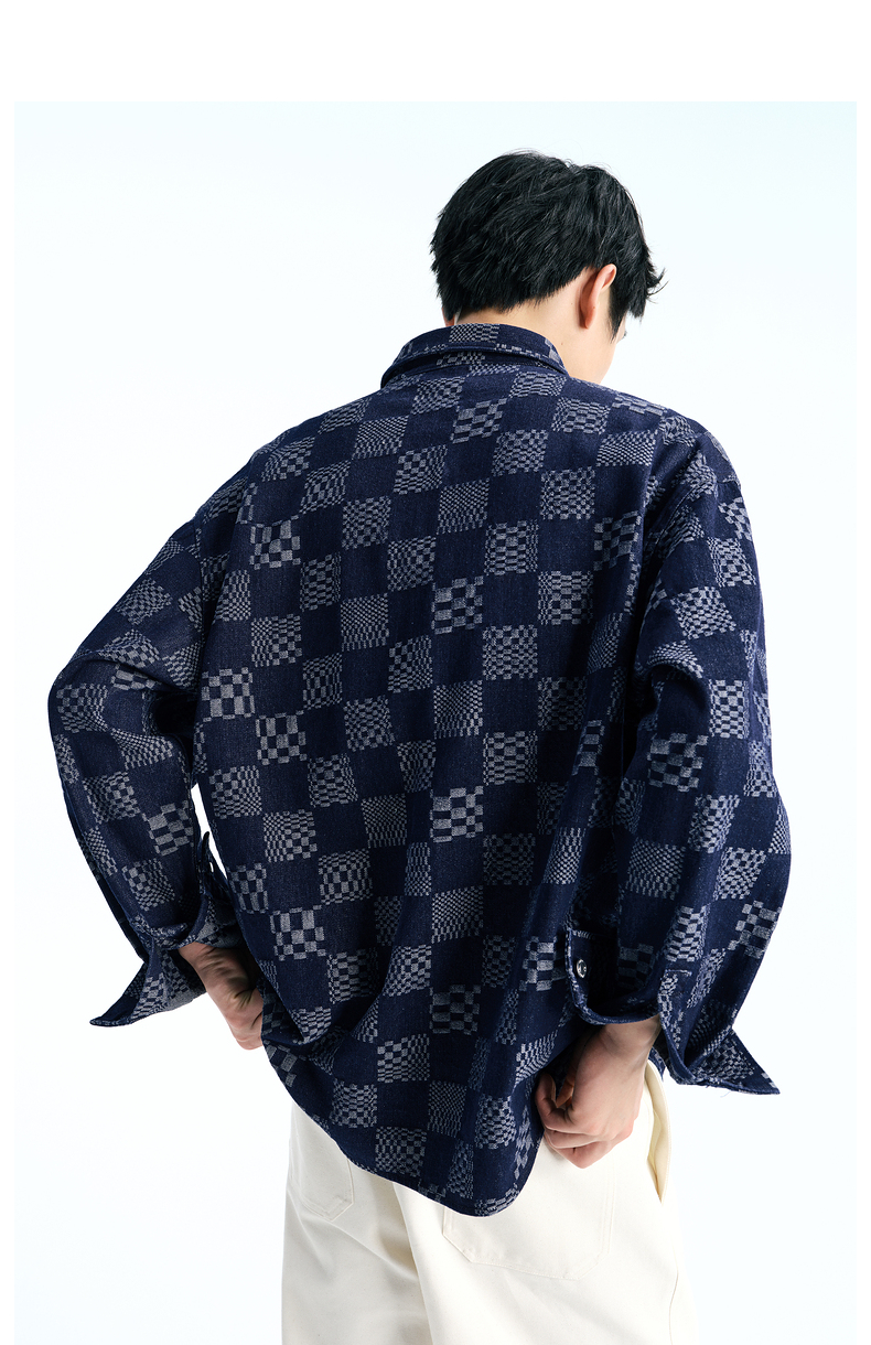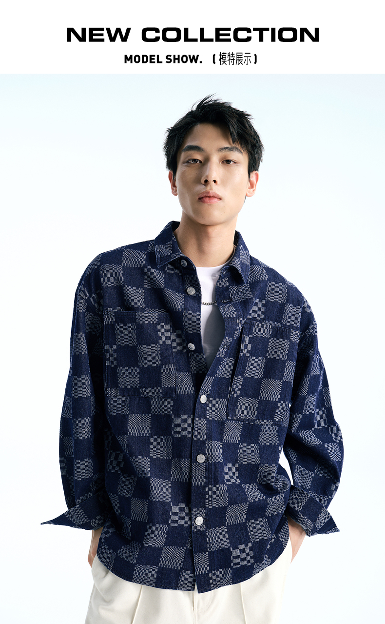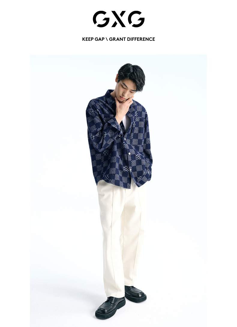 GXG男装 深蓝棋盘格提花潮流时尚衬衫外套 春季热卖