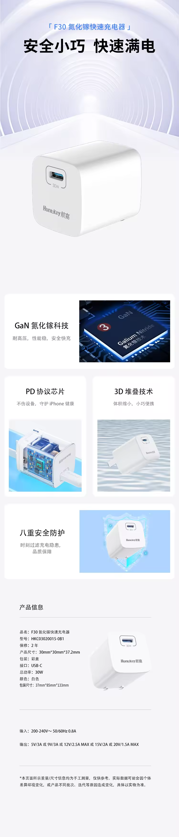 HUNTKEY航嘉 30W Pro款折叠氮化镓快速充电器 白色