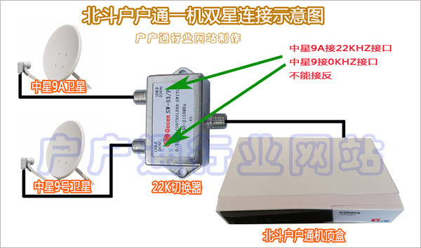 北斗户户通同时收看中星9号和中星9A卫星在使用一锅双星,或一机双锅时,需配置22K切换开关。