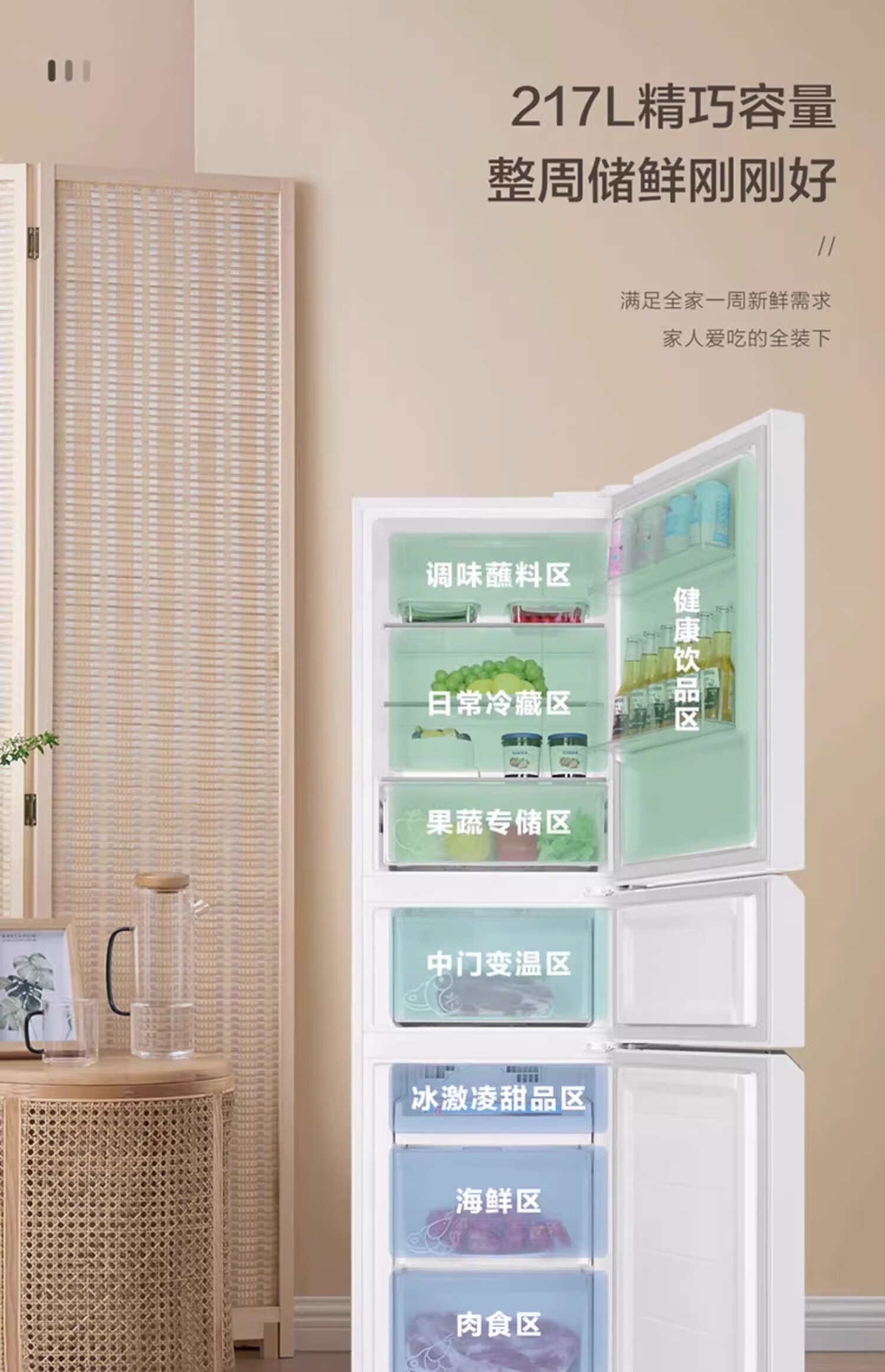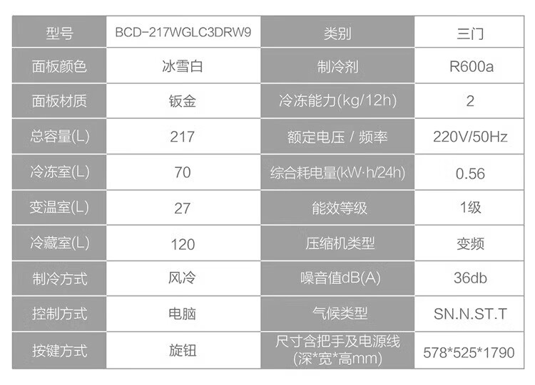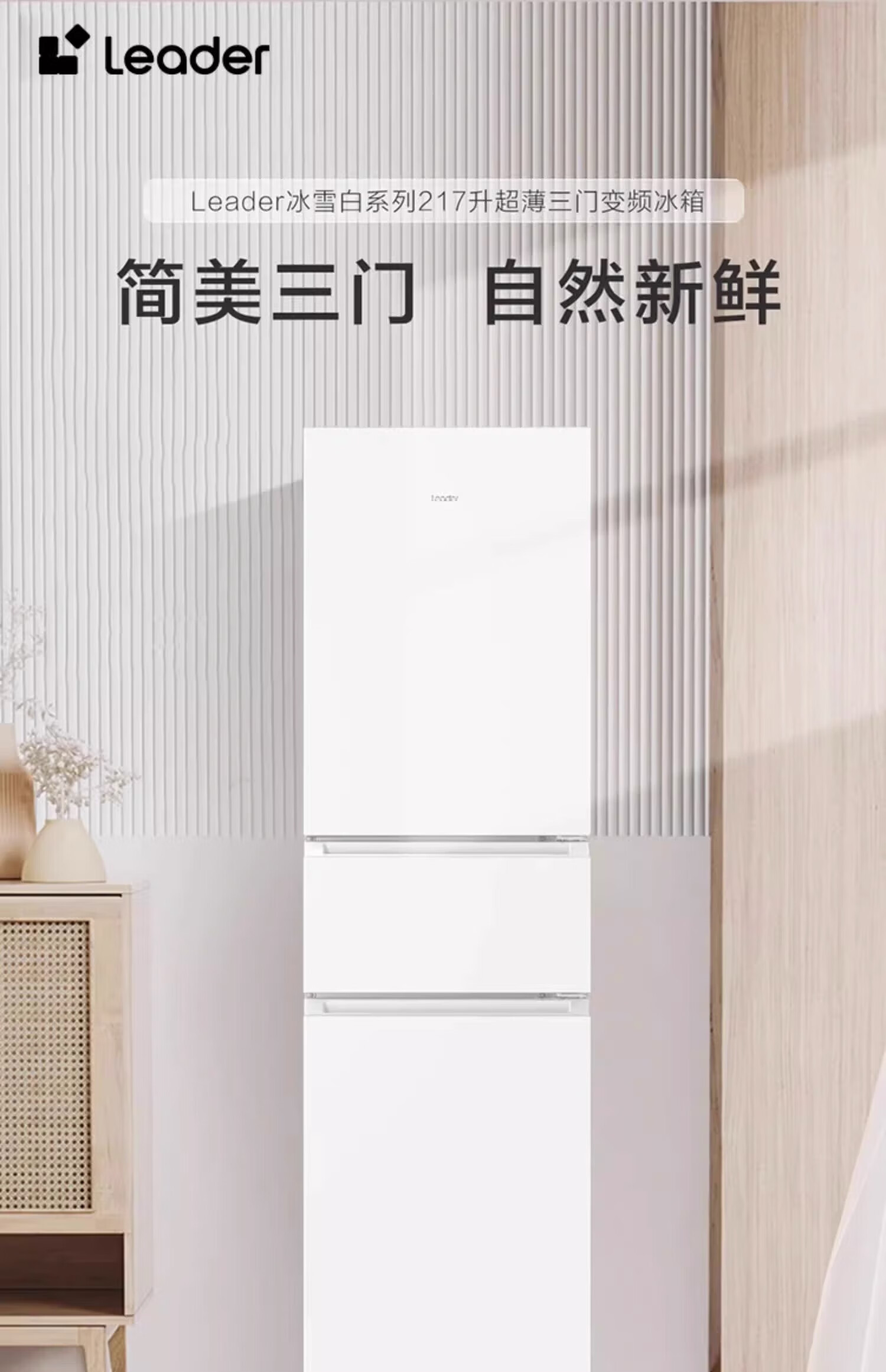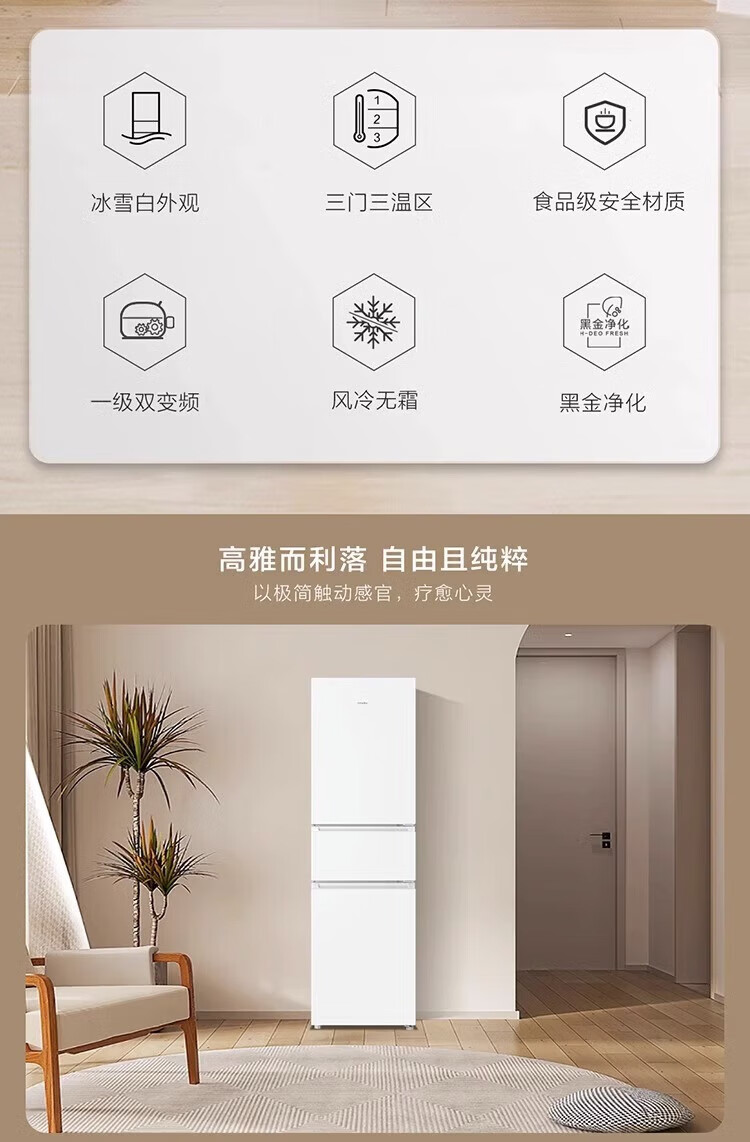 海尔智家Leader统帅冰箱 冰雪白217升一级双变频 风冷无霜租房家用电冰箱