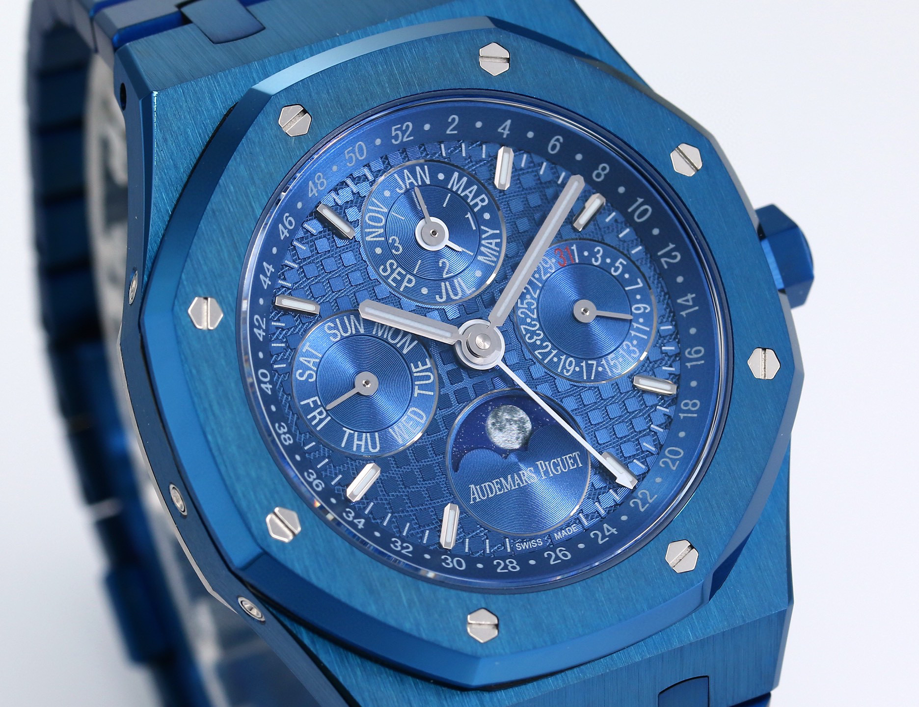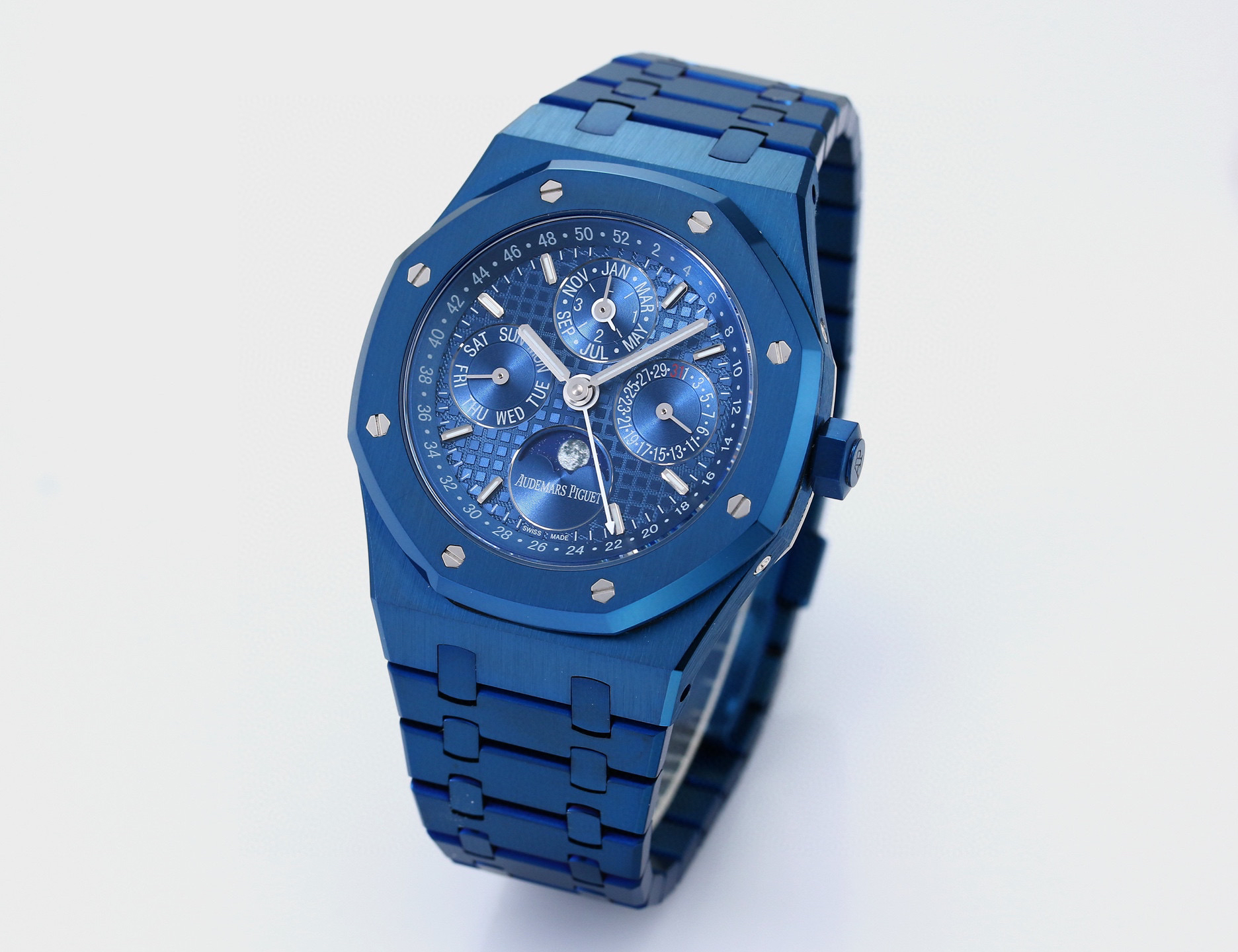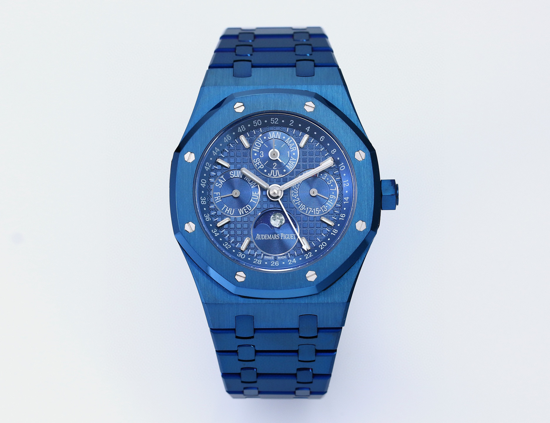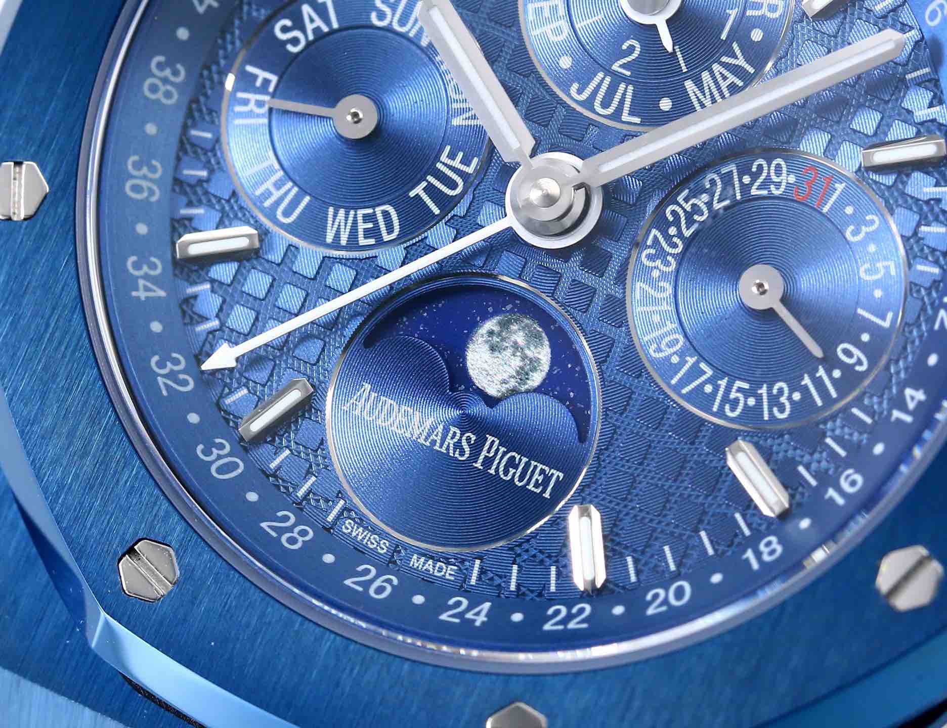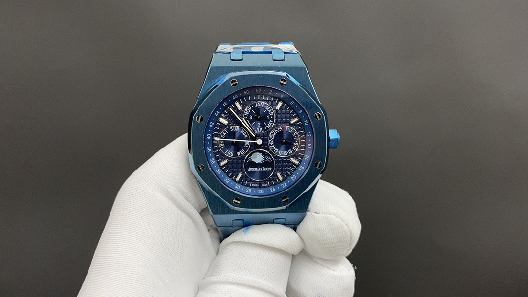The noble Audemars Piguet Royal Oak series perpetual calendar watch features a noble and elegant blue dial paired with a cool and bright stainless steel case, perfectly reflecting Audemars Piguet's aesthetic design and advanced technology in complex functions.