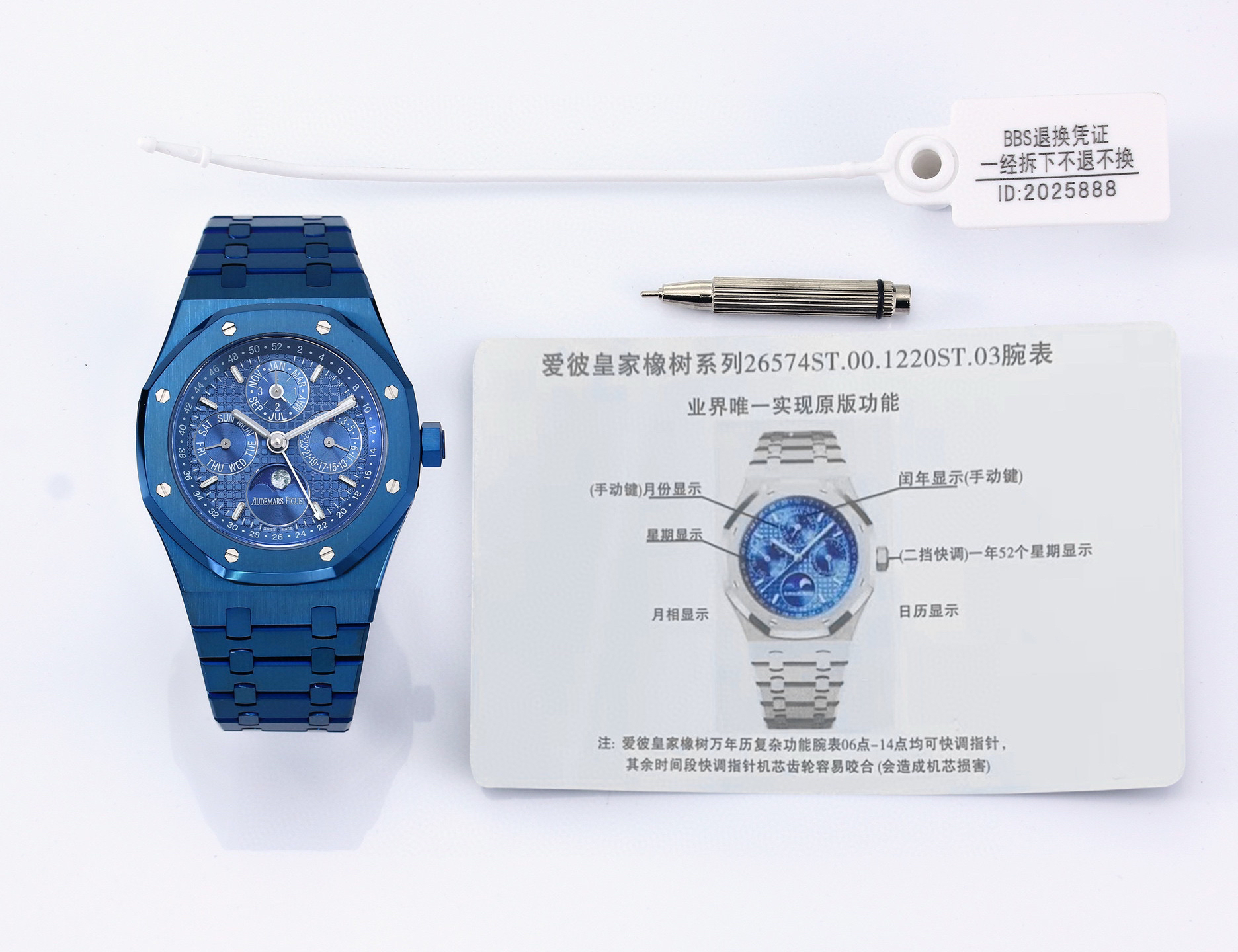 The case is made of 316L stainless steel with a diameter of 41 millimeters Thickness 11.4mm. Blue dial engraved with "Grande Tapisserie" large grid decoration, blue dial, three-dimensional hour markers, engraved hands covered with luminous coating. Three sub dials with calendar display functions and a moon phase display dial are symmetrically distributed on the dial, displaying hour, minute, week, date, weekly calendar, month, moon phase, and leap year information in an orderly manner. The only true version. Sapphire anti glare treatment makes the overall watch more transparent and bright.