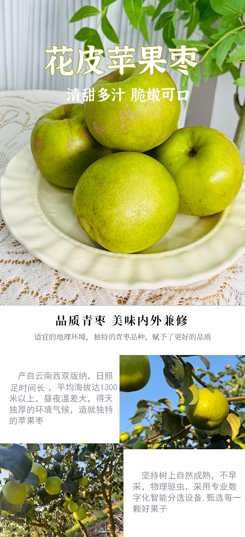 1.刚摘下的蜜枣是青黄色的,口感脆甜,由于在运输途中,部分蜜枣表面可能有小小刮花现象或是自身的小斑点,但不影响食用,介意者慎拍。