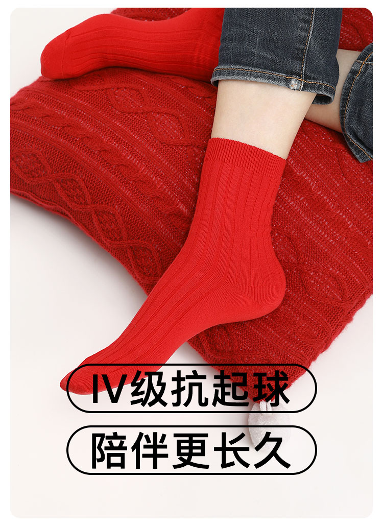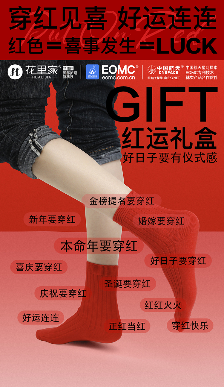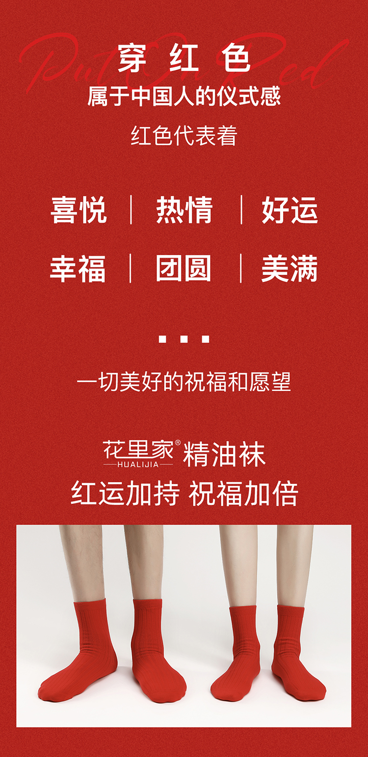 花里家红运礼盒长筒袜红色防臭精油袜男士商务中筒袜子纯色抗菌排汗透气秋冬季棉袜女