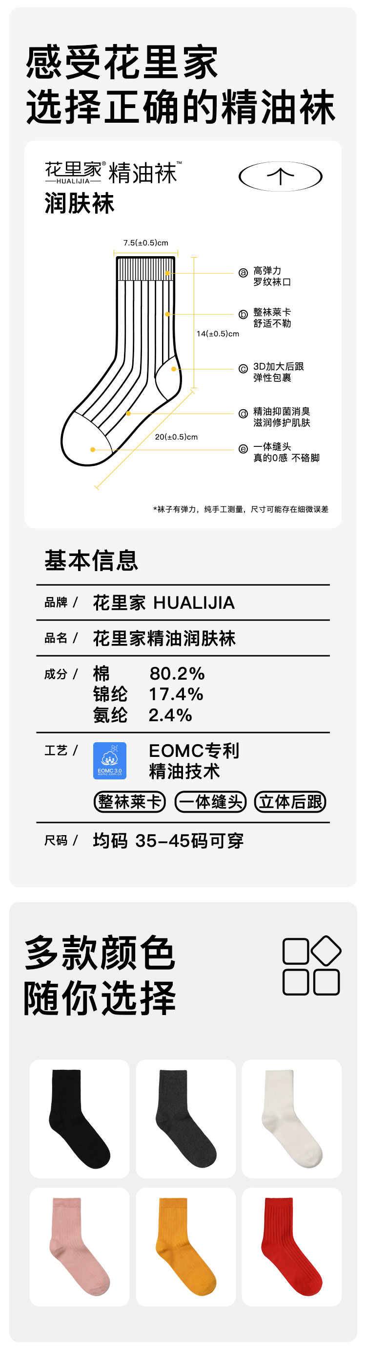 工艺处理:*EOMC精油技术 *一体缝头 *整袜莱卡 *头跟加固 *高弹面料 *40支细纱线