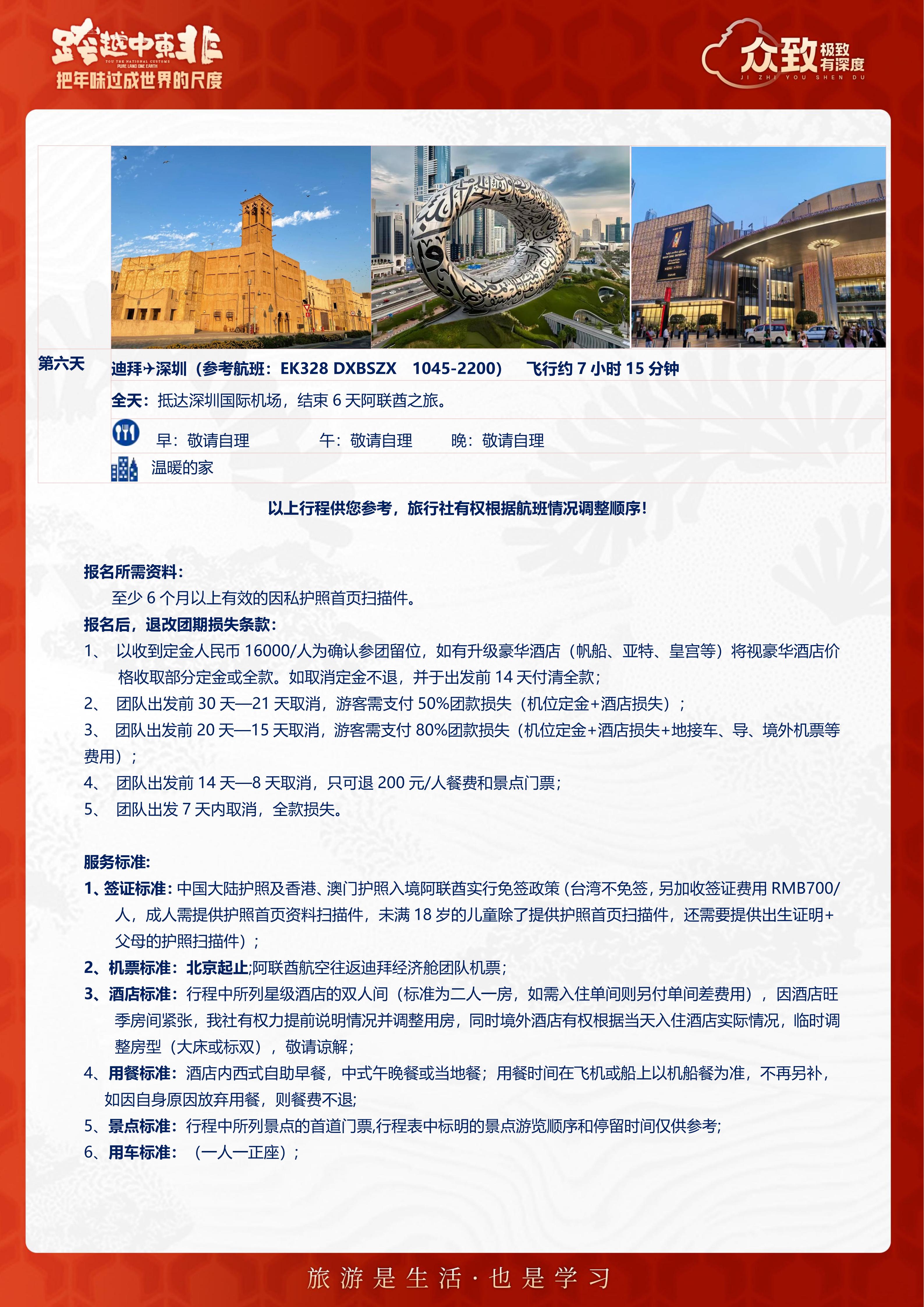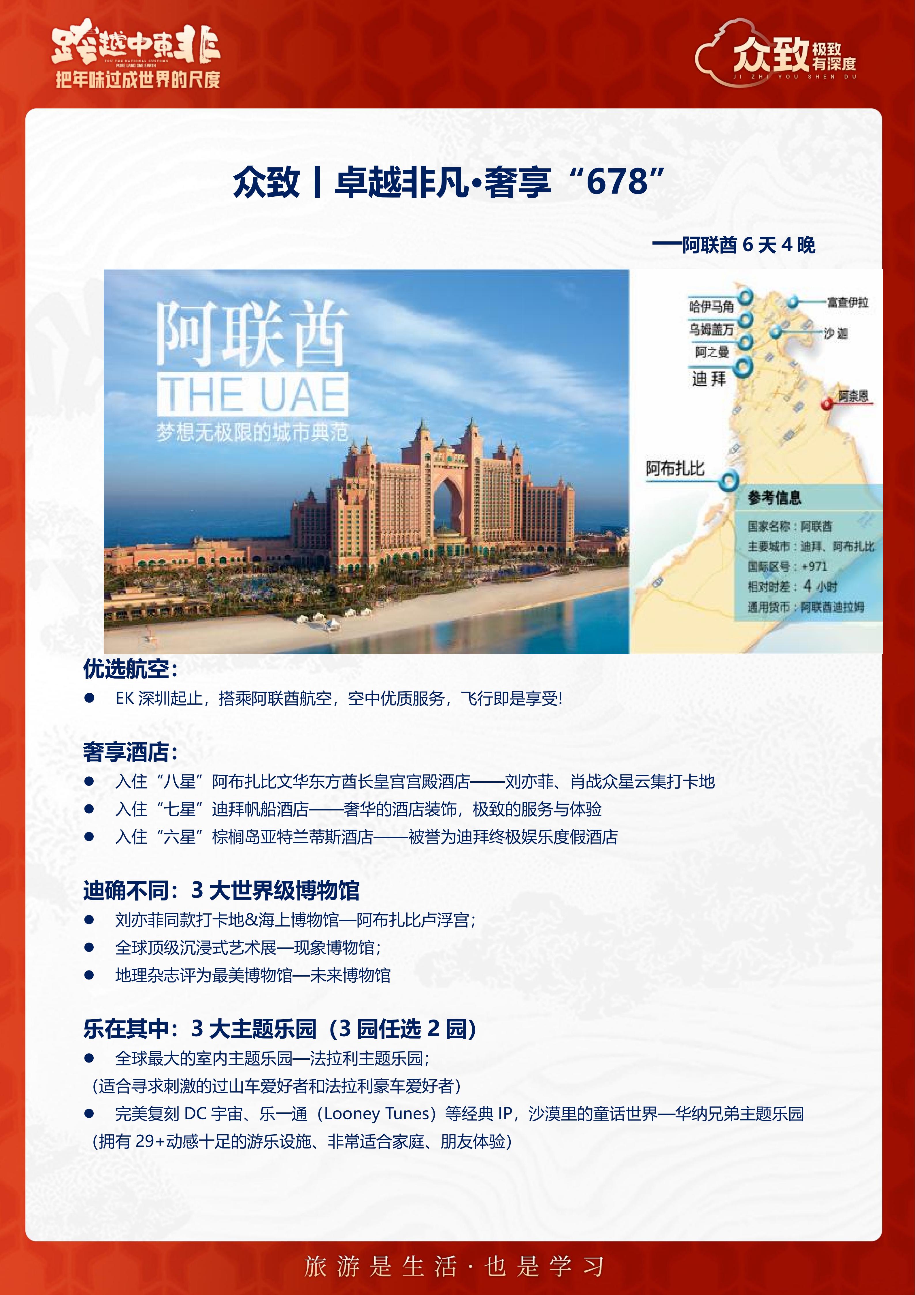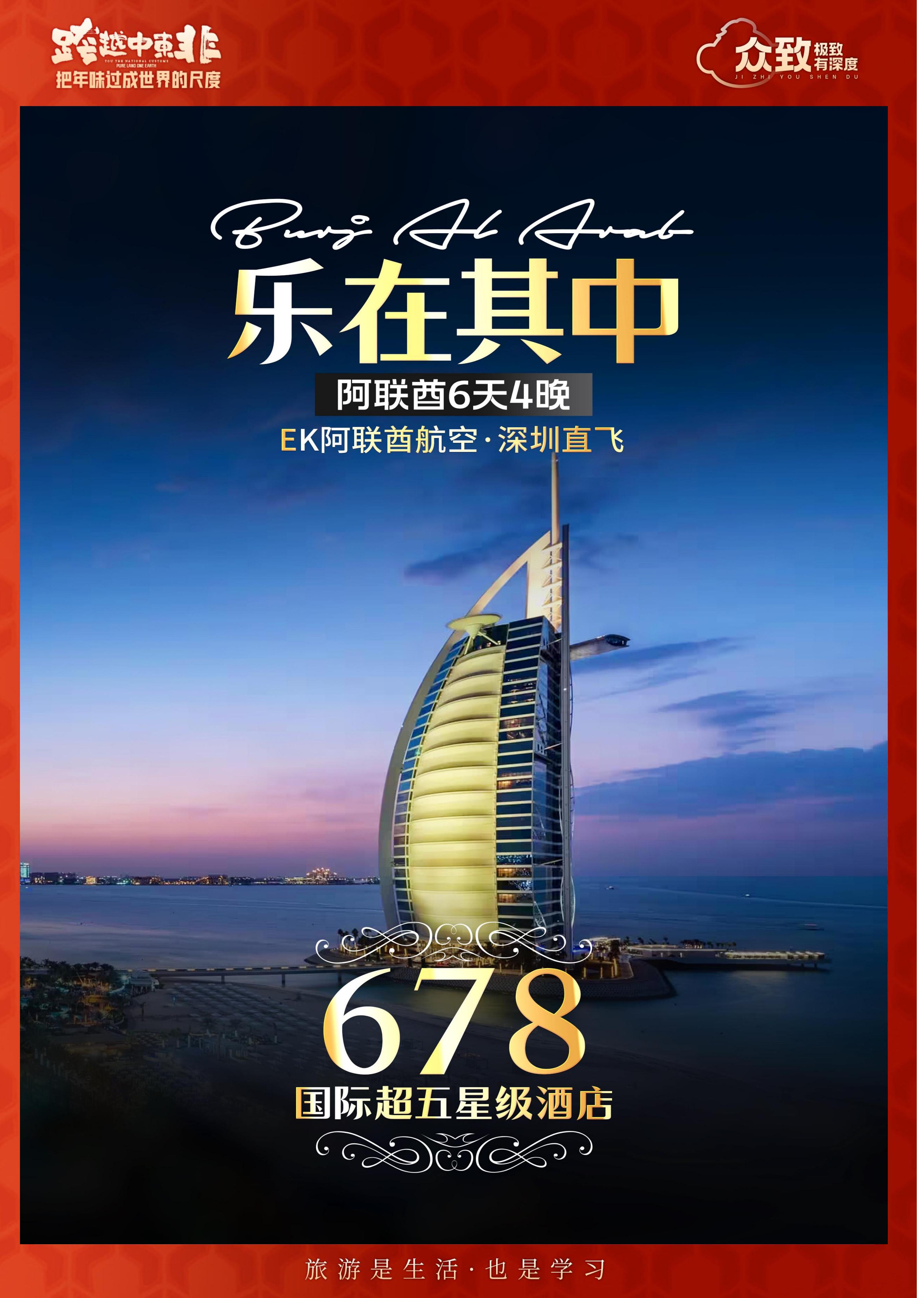 【春节】<阿联酋迪拜6天4晚尊享团-深圳直飞往返>1晚八星文华东方酋长皇宫宫殿酒店+1晚七星迪拜帆船酒店+六星亚特兰蒂斯酒店+3 大主题乐园(3选2)、阿布扎比总统府、棕榈岛观景平台52层、未来博物馆