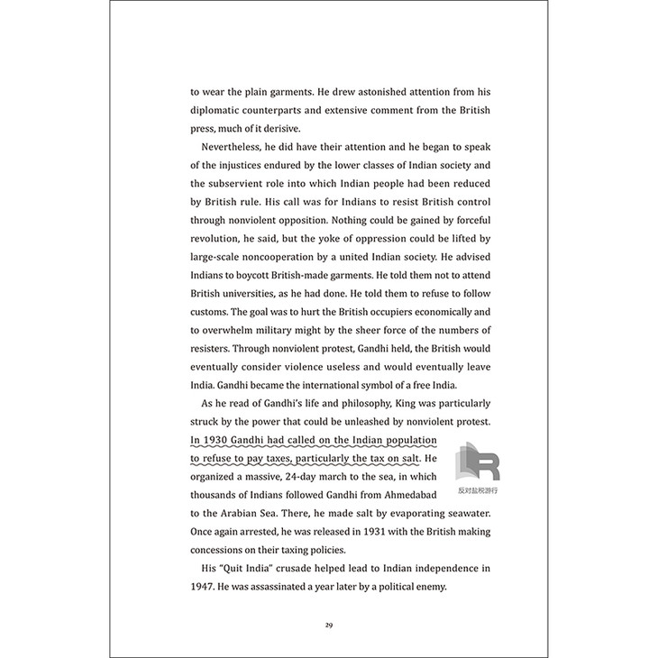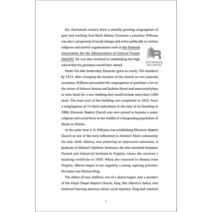 《黑暗中的光明使者:马丁·路德·金传》一书中既有原汁原味的英文,又有生动流畅的译文,书中还穿插了许多背景知识拓展,扫描封底二维码即可查看文内精彩知识点解析。马丁·路德·金是美国牧师、社会活动家、民权运动领袖。本书记载了马丁·路德·金的成长历程以及他为争取种族平等而奋斗的一生。作为美国民权运动的重要人物,马丁·路德·金以非暴力的主张,在美国多地组织游行、抵抗运动,号召民众争取种族平等,极大地推动了民权运动的进展。