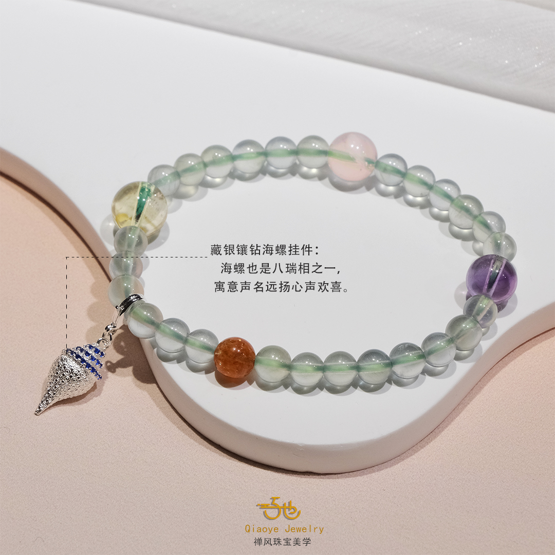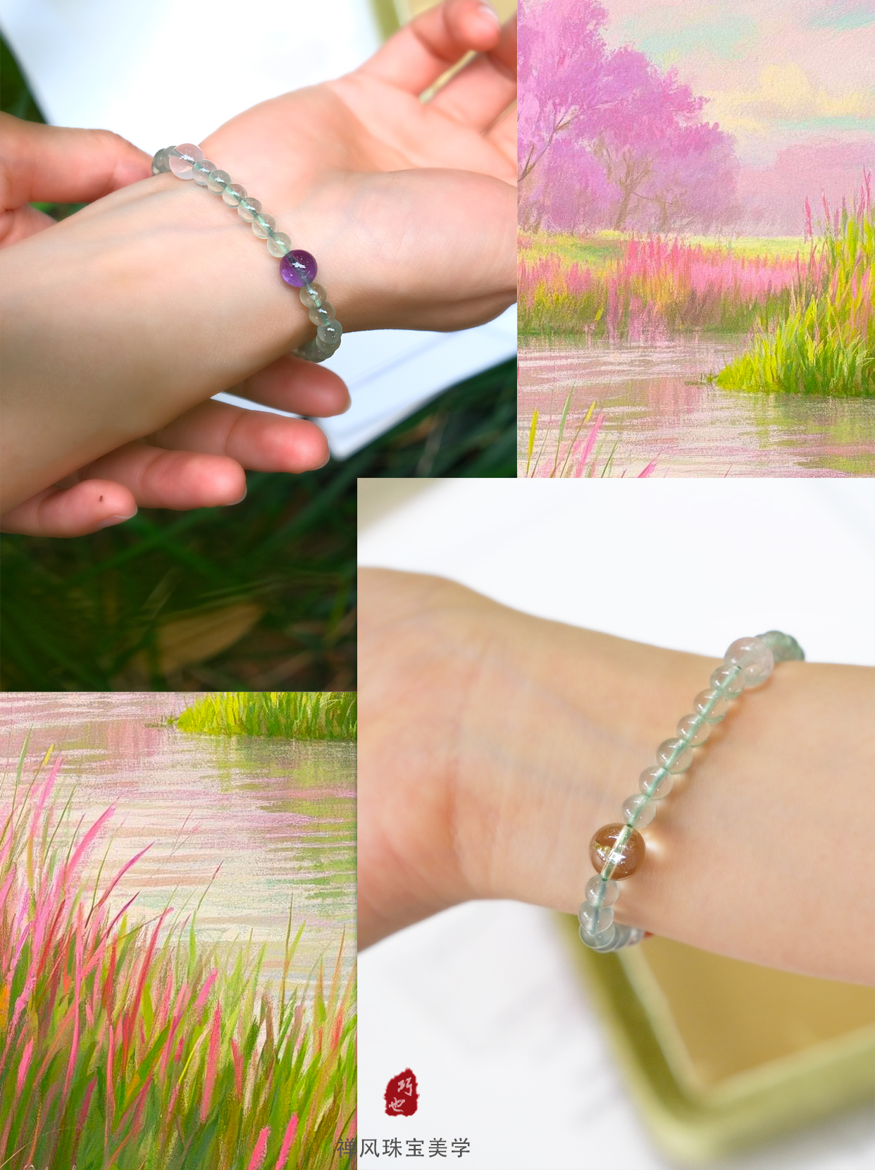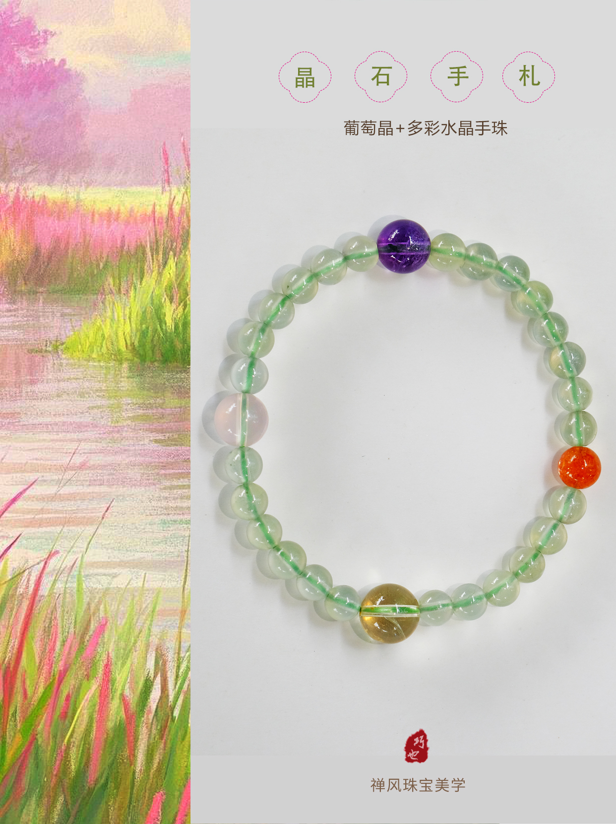 腕间藏星河,珠玉纳乾坤。葡萄石凝露为魂,翠色流转间似揽青峦云气;粉晶萦温柔之息,若桃花拂月,暗许春深;黄晶撷金乌流光,暖透浮世薄凉;紫晶卧星汉残梦,幽韵自含风骨;日光石碎金跃动,恍闻晨钟破雾音。