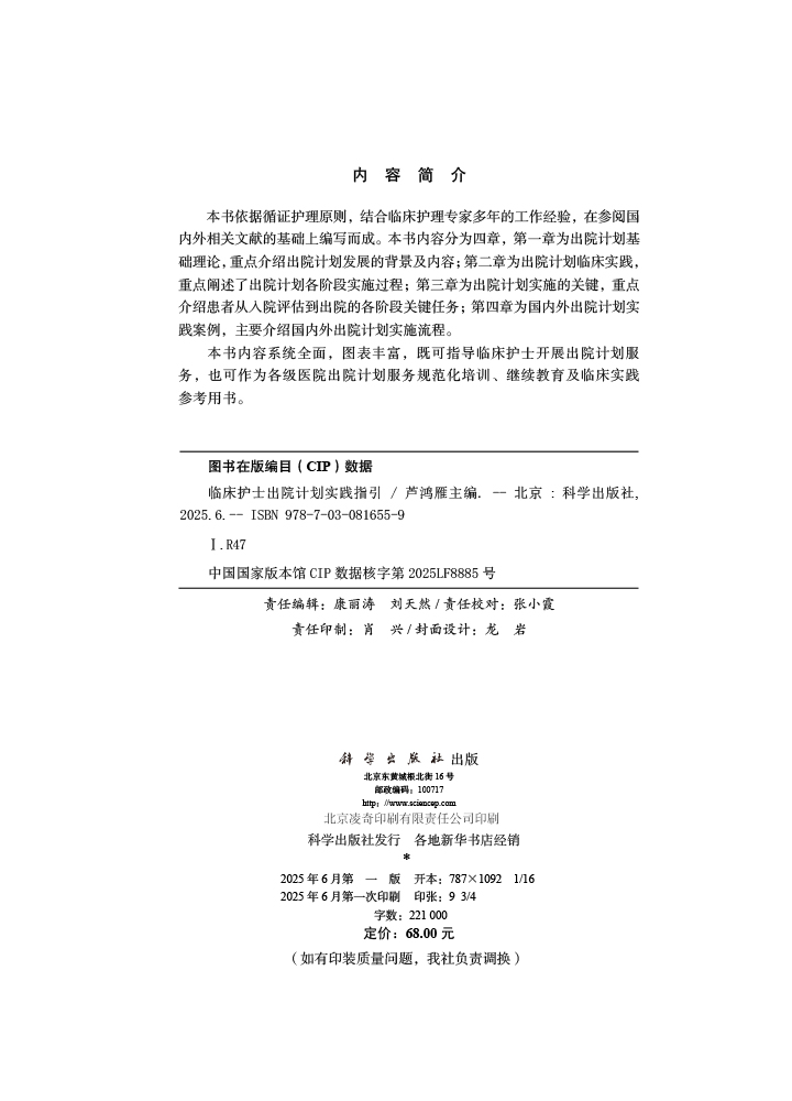 临床护士出院计划实践指引 芦鸿雁 主编 适用各级医院临床护理人员及从事护理管理工作的人员 临床医学 护理学 科学出版社
