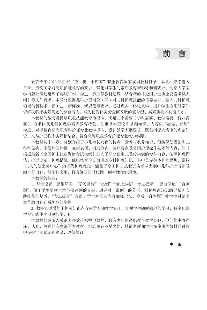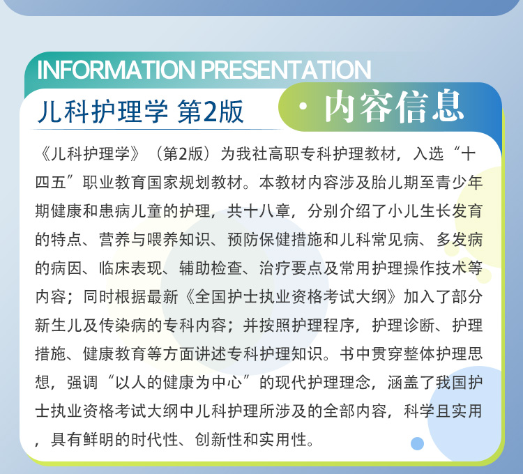 《儿科护理学》(第2版)为我社高职专科护理教材,入选“十四五”职业教育国家规划教材。本教材内容涉及胎儿期至青少年期健康和患病儿童的护理,共十八章,分别介绍了小儿生长发育的特点、营养与喂养知识、预防保健措施和儿科常见病、多发病的病因、临床表现、辅助检查、治疗要点及常用护理操作技术等内容;同时根据最新《全国护士执业资格考试大纲》加入了部分新生儿及传染病的专科内容;并按照护理程序,护理诊断、护理措施、健康教育等方面讲述专科护理知识。书中贯穿整体护理思想,强调“以人的健康为中心”的现代护理理念,涵盖了我国护士执业资格考试大纲中儿科护理所涉及的全部内容,科学且实用,具有鲜明的时代性、创新性和实用性。