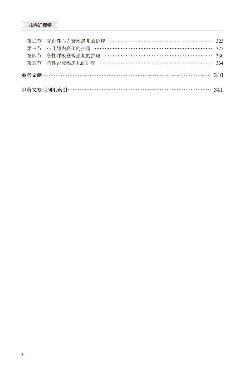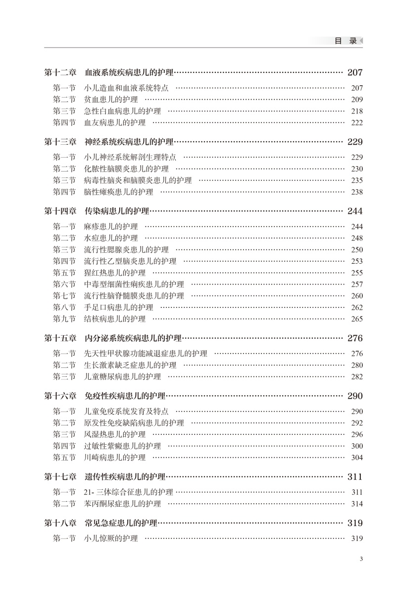 目录 第一章 绪论 1 第一节 儿科护理的任务和范围 1 第二节 儿科护理的特点 2 第三节 小儿年龄分期及各期特点 4 第四节 儿科护士的角色和素质要求 5 第五节 我国儿科护理学的发展 7 第二章 生长发育 9 第一节 生长发育规律及其影响因素 9 第二节 儿童体格生长发育与评价 11 第三节 与体格生长发育有关的其他系统的发育 15 第四节 儿童神经心理发育及评价 18 第五节 儿童生长发育中的特殊问题 23 第三章 儿童营养28 第一节 能量与营养素的需要 28 第二节 小儿喂养与膳食 31 第三节 小儿营养状况评价 37 第四章 儿童保健40 第一节 各年龄期儿童保健重点 40 第二节 计划免疫 44 第五章 儿科医疗机构的设置及住院患儿的护理50 第一节 儿科医疗机构及护理管理 50 第二节 儿科健康评估的方法 53 第三节 小儿沟通的特点与方法 57 第四节 住院患儿的心理护理 59 第五节 小儿用药的护理 61 第六节 小儿体液平衡特点和液体疗法 64 第七节 儿科常用护理技术 71 第六章 新生儿与新生儿疾病患儿的护理87 第一节 新生儿分类 87 第二节 正常足月儿和早产儿的特点及护理 88 第三节 新生儿重症监护的护理 95 第四节 新生儿窒息的护理 96 第五节 新生儿缺氧缺血性脑病的护理 101 第六节 新生儿颅内出血的护理 103 第七节 新生儿黄疸的护理 105 第八节 新生儿败血症的护理 109 第九节 新生儿寒冷损伤综合征的护理 111 第十节 新生儿脐炎的护理 114 第十一节 新生儿低血糖的护理 115 第十二节 新生儿低钙血症的护理 116 第十三节 新生儿产伤性疾病的护理 118 第七章 营养障碍性疾病患儿的护理 123 第一节 蛋白质 - 能量营养不良患儿的护理 123 第二节 单纯性肥胖症患儿的护理 128 第三节 维生素 D 缺乏症患儿的护理 131 第八章 消化系统疾病患儿的护理 144 第一节 小儿消化系统解剖生理特点 144 第二节 口炎患儿的护理 145 第三节 腹泻患儿的护理 148 第九章 呼吸系统疾病患儿的护理 157 第一节 小儿呼吸系统解剖生理特点 157 第二节 急性上呼吸道感染患儿的护理 159 第三节 急性感染性喉炎患儿的护理 161 第四节 急性支气管炎患儿的护理 162 第五节 肺炎患儿的护理 164 第六节 支气管哮喘患儿的护理 170 第十章 循环系统疾病患儿的护理 177 第一节 小儿循环系统解剖生理特点 177 第二节 先天性心脏病患儿的护理 179 第三节 病毒性心肌炎患儿的护理 185 第十一章 泌尿系统疾病患儿的护理 189 第一节 小儿泌尿系统解剖生理特点 189 第二节 急性肾小球肾炎患儿的护理 191 第三节 肾病综合征患儿的护理 196 第四节 尿路感染患儿的护理 202 第十二章 血液系统疾病患儿的护理 207 第一节 小儿造血和血液系统特点 207 第二节 贫血患儿的护理 209 第三节 急性白血病患儿的护理 218 第四节 血友病患儿的护理 222 第十三章 神经系统疾病患儿的护理 229 第一节 小儿神经系统解剖生理特点 229 第二节 化脓性脑膜炎患儿的护理 230 第三节 病毒性脑炎和脑膜炎患儿的护理 235 第四节 脑性瘫痪患儿的护理 238 第十四章 传染病患儿的护理 244 第一节 麻疹患儿的护理 244 第二节 水痘患儿的护理 248 第三节 流行性腮腺炎患儿的护理 250 第四节 流行性乙型脑炎患儿的护理 253 第五节 猩红热患儿的护理 255 第六节 中毒型细菌性痢疾患儿的护理 257 第七节 流行性脑脊髓膜炎患儿的护理 260 第八节 手足口病患儿的护理 262 第九节 结核病患儿的护理 265 第十五章 内分泌系统疾病患儿的护理 276 第一节 先天性甲状腺功能减退症患儿的护理 276 第二节 生长激素缺乏症患儿的护理 280 第三节 儿童糖尿病患儿的护理 282 第十六章 免疫性疾病患儿的护理 290 第一节 儿童免疫系统发育及特点 290 第二节 原发性免疫缺陷病患儿的护理 292 第三节 风湿热患儿的护理 296 第四节 过敏性紫癜患儿的护理 300 第五节 川崎病患儿的护理 304 第十七章 遗传性疾病患儿的护理 311 第一节 21- 三体综合征患儿的护理 311 第二节 苯丙酮尿症患儿的护理 314 第十八章 常见急症患儿的护理 319 第一节 小儿惊厥的护理 319 第二节 充血性心力衰竭患儿的护理 323 第三节 小儿颅内高压的护理 327 第四节 急性呼吸衰竭患儿的护理 330 第五节 急性肾衰竭患儿的护理 334 参考文献 340 中英文专业词汇索引 341