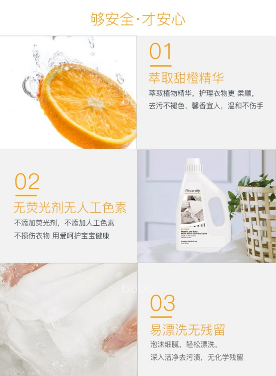 同系列的还有一款 花卉诗甜橙母婴洗衣液 专为婴幼儿娇嫩肌肤研制 要知道宝宝的肌肤比成年人娇嫩的多 表皮更薄更脆弱,对环境的适应能力差 抵抗细菌口能力弱 所以贴身衣物一定要清洗千净,给宝宝干净的肌肤环境~ 甜橙母婴洗衣液采用水般温和配方 在强效杀菌去污的同时 保持衣物柔顺亲肤,不破坏本原纤维 散发天然甜橙清香,舒爽果味给宝宝满满活力! ! 2L装的容量也可以用超久啦~