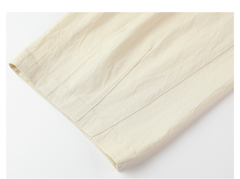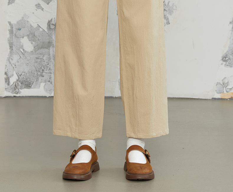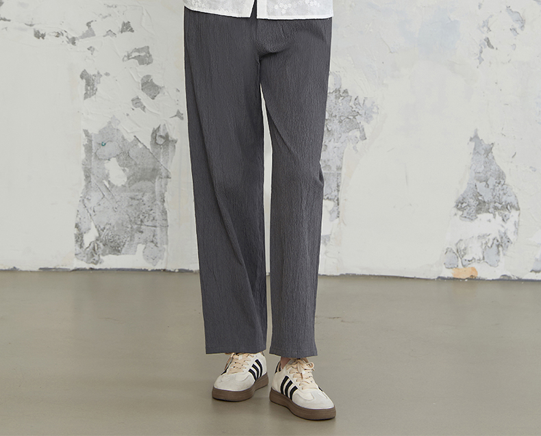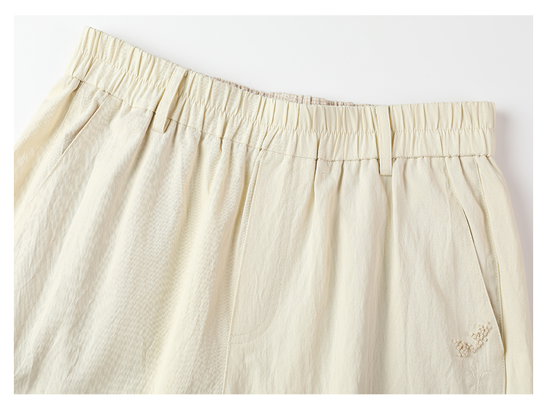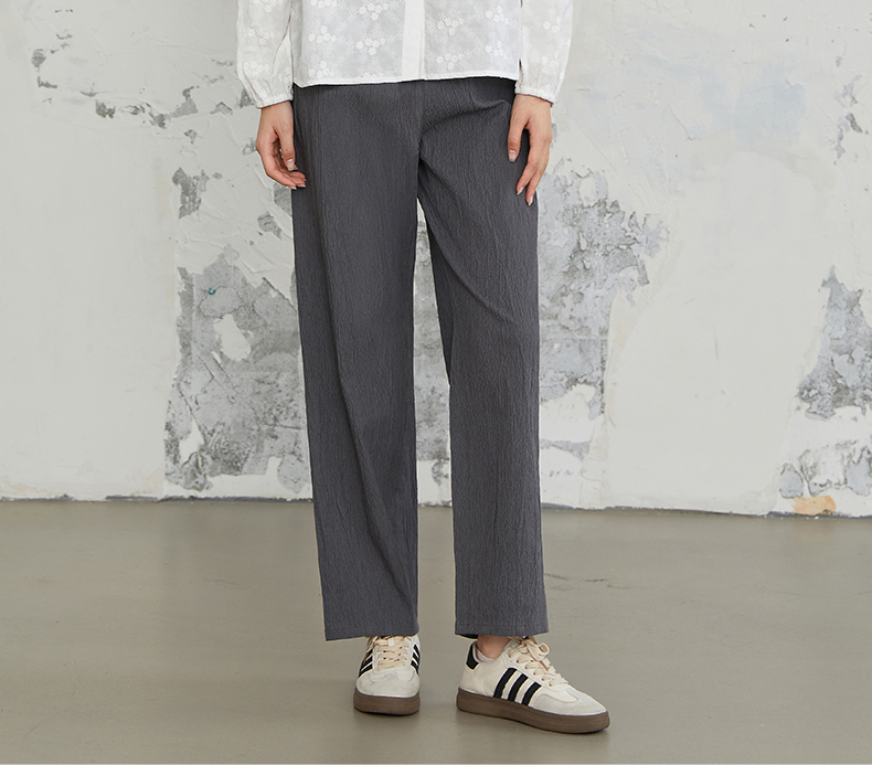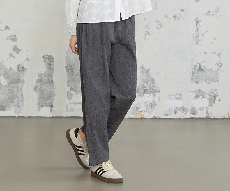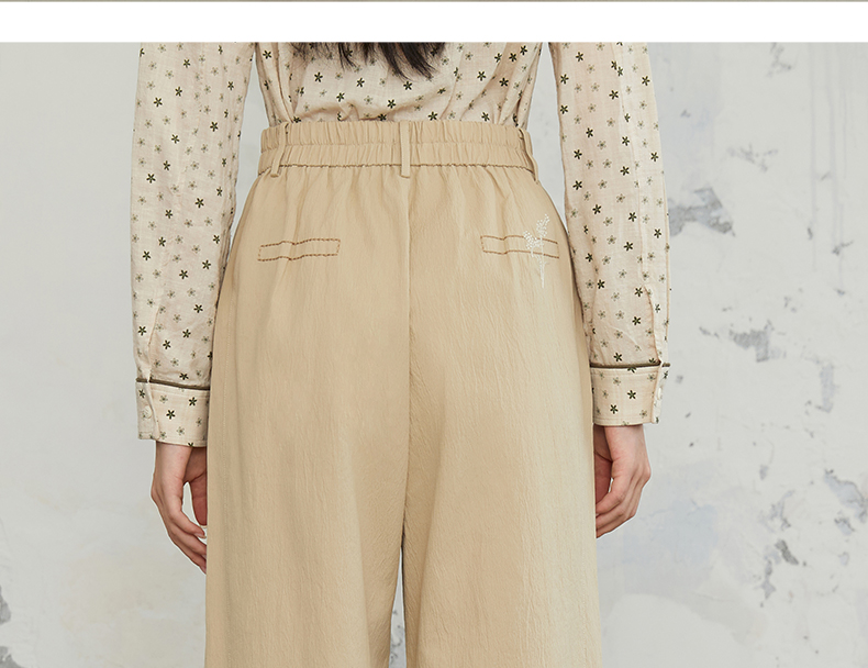 Famecoco范可儿裤子棉质刺绣褶皱感休闲直筒松紧腰长裤女秋季FAB6GA013